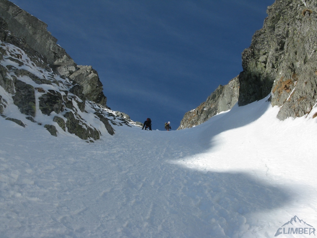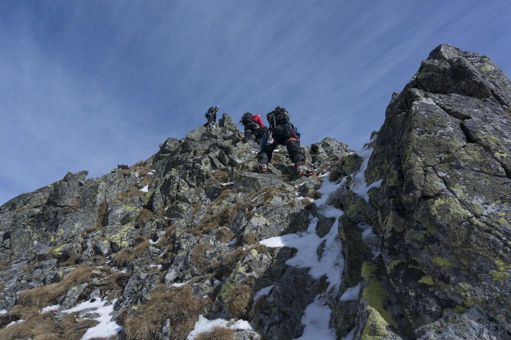Pomysł na wejście na Szatana Czerwonym Żlebem podpatrzyłem od kolegi Łukasz (Madnessa) prowadzącego blog Mountain Adventure. Zbieramy sporą ekipę i wcześnie rano podchodzimy do Mięguszowieckiej. Warunki w żlebie są bardzo dobre, dlatego rezygnujemy z asekurowania się. Grań jest już łatwa, a na zejściu jedyne trudne miejsce pokonujemy zjazdem. Szybka i sprawna akcja i kolejna piękna góra zdobyta - tym razem drogą "prawie wspinaczkową".