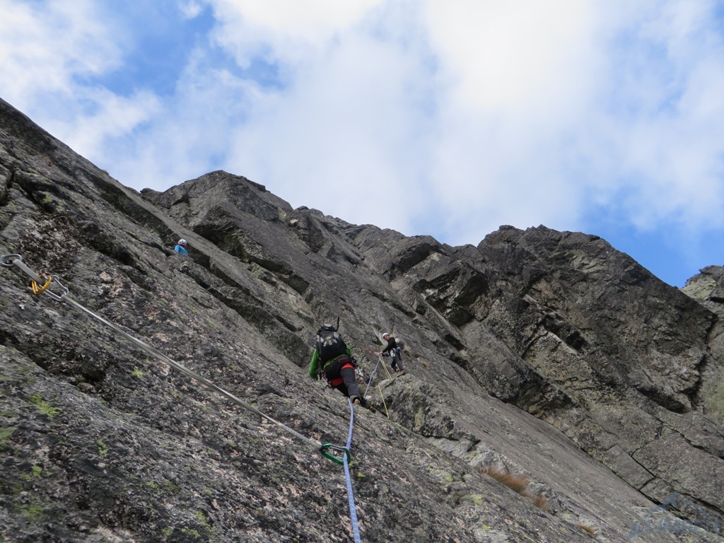 W tym samym składzie jak rok temu, wracamy na Kieżmarski by dokończyć drogę Kriššáka (VI+) na południowej ścianie. Podczas zeszłorocznego wspinania (RELACJA) zostaliśmy zmuszeni przez ulewę do wycofania się po przejściu dolnej części i 2 wyciągów nad rampą, pozostały nam więc dwa ostatnie wyciągi drogi. Z tego też względu tym razem postanawiamy dolną część ściany przejść drogą Lipka-Święcicki (V+). Akcja zaczyna się od nieprzyjemnej niespodzianki – z powodu silnego wiatru nie kursuje kolejka do Łomnickiego Stawu. Chcieliśmy skorzystać z jednej z nielicznych okazji by nie podchodzić pod ścianę, oszczędzić nogi i wyspać się godzinę dłużej – udało się tylko to ostatnie 😉.
