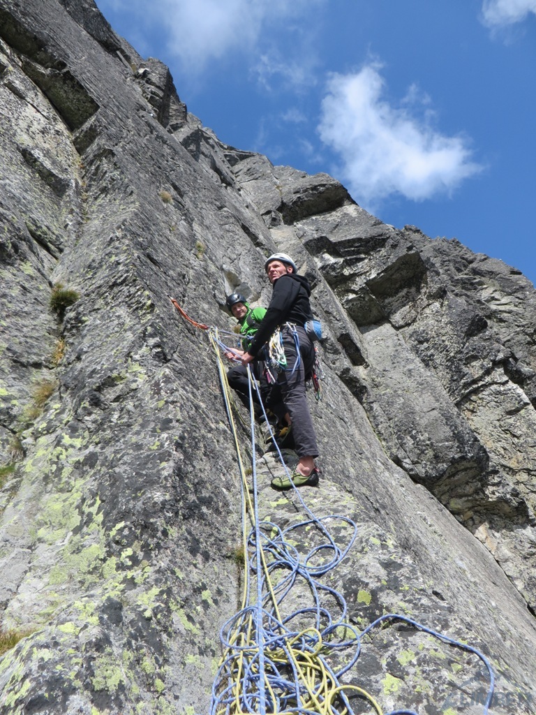 Ustalamy strategię działania, dzielimy wyciągi i ruszamy w Płyty Kriššáka. Ponieważ dwa pierwsze wyciągi w zeszłym roku prowadzili chłopaki, wszystko wskazuje bym robił je tym razem ja – szpeję się więc i ruszam. Pierwszy wyciąg to nieprzyjemny trawers nad wielkim okapem, asekuracja jest bardzo wymagająca ale rzeźba skały jest świetna, dlatego też szybko melduję się na stanie. Drugi odcinek to piękne płyty, niestety oszpecone niepotrzebnymi w niektórych miejscach spitami. Cieszę się jednak wspinaniem i po chwili wpinam się do kolejnego stanowiska. Teraz prowadzenie przejmuje Jacek, przechodzi imponującą płytę i groźnie wyglądający okapik (a to tylko IV+!) i dochodzi do szerokiej półki na wysokości stanowiska pod kluczowymi trudnościami niesamowitego Zacięcia Fiali, biegnącego kilkanaście metrów na prawo od nas (RELACJA z przejścia rok później). W międzyczasie nadchodzą ciemne chmury i przez chwilę mamy obawy, że powtórzy się sytuacja sprzed roku i zostaniemy przegonieni ze ściany bez skompletowania drogi - na szczęście pogoda „wytrzymuje”.
