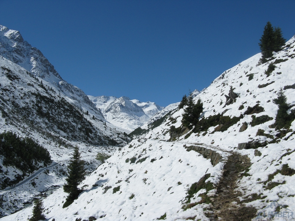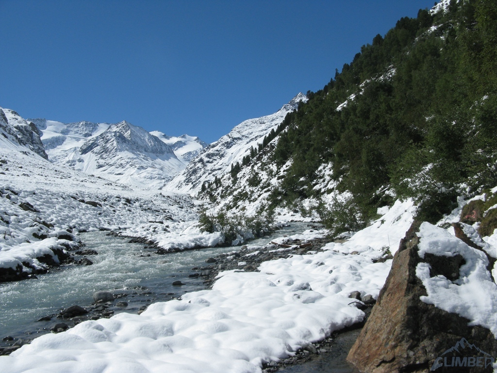 W nocy mocno sypnęło, musimy więc odłożyć ambitne plany na bok i poszukać celu w zasięgu. Decydujemy się wyjechać kolejką do Rifflsee i stamtąd górami przejść do malowniczo położonego schroniska Taschachhaus. Niestety nie jest to dobra decyzja - jesteśmy po złej stronie rzeki, schodzimy więc stromymi zboczami by ją przekroczyć. No ale wraz ze wzrostem temperatury poziom wody znacznie się podnosi i w pewnym momencie zostajemy uwięzieni w jednej z zatok - rzeki nie przekroczymy, musimy więc wspinać się po kosówkach z powrotem na naszą ścieżkę. Sponiewierani i spaleni odbijającym od śniegu Słońcem musimy zejść z powrotem do naszej miejscowości.
