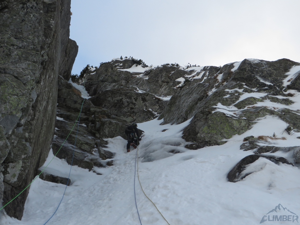 Dolny, łatwy (WI2) lód, prowadzi Mariusz i po chwili ściąga mnie na stan walcząc z zaplątaną przez Słowaka liną. Nie zatrzymuję się na stanie, tylko od razu ciągnę dalej pod Górnego Grosza. Fragment za WI4 trochę mnie bułuje, dodatkowo jest nieasekurowalny (śniego-lód) ale idzie sprawnie i po chwili melduje się przy stałym stanowisku. Ściągam kolegę, rozwiązujemy się i ruszamy dalej do góry. Pokonujemy krótki i połogi próg lodowy, po czym cały czas idziemy dość dobrze związanym śniegiem. Są jednak miejsca, gdzie śnieg przewiało i tam trzeba się żmudnie przez niego przekopywać.