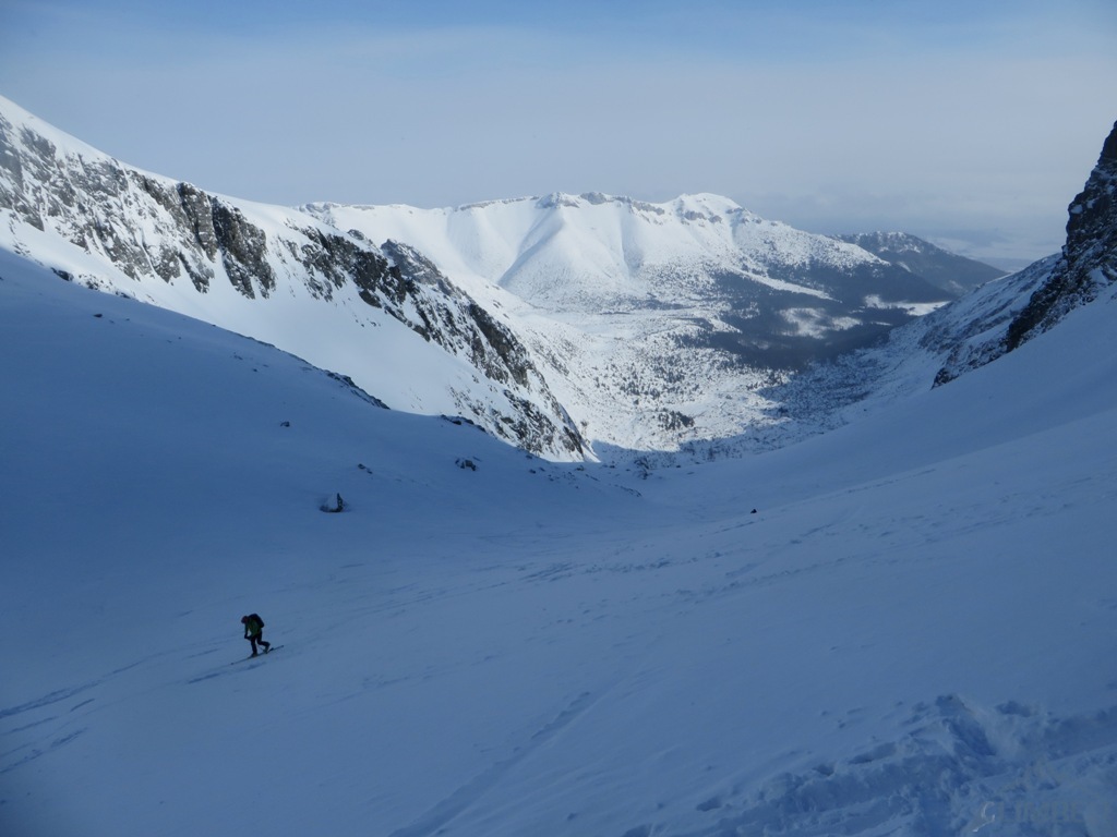 Na drugi dzień obozu prognozy nie są najlepsze – do ponad dwudziestostopniowego mrozu ma dojść zachmurzenie i słaby opad śniegu. Dlatego też wspinanie odkładam do środy i wraz z Jurasem i Kućką ruszam na skiturę, o której od dawna myślałem – przez Baranią Przełęcz do Chaty Teryho i z powrotem do Zielonego Stawu. Okazuje się, że poza mrozem prognozy nie sprawdzają się – poranne chmury rozchodzą się i cały dzień możemy cieszyć się pięknym niebieskim niebem.