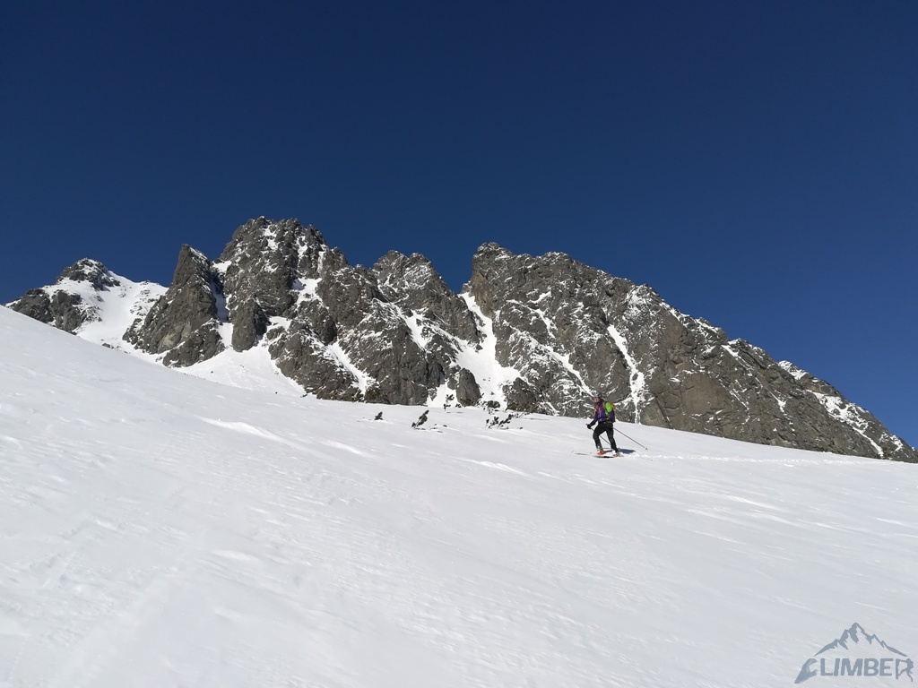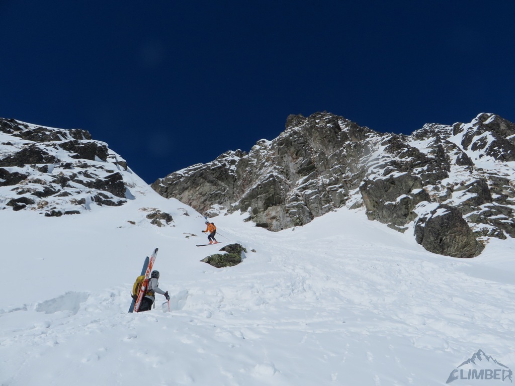 Kolejny mroźny dzień (ale już tylko minus 15) w Dolinie Kieżmarskiej. Po wczorajszym całodniowym wspinaniu, kolejną akcję na mrocznej północnej ścianie zostawiam na piątek i ruszam wraz z Jurasem na turach do słonecznej Doliny Jagnięcej. Już po kilkuset metrach i wyjściu z dziury w której przebywamy na obozie, rozbieramy się do koszulek i na lekko śmigamy w kierunku Jagnięcego Szczytu. Planujemy na nartach wyjść na Kołowy Przechód i tam zadecydować czy zjazd na drugą stronę (do Doliny Kołowej) jest możliwy, czy też wejdziemy na szczyt Jagnięcego i zjedziemy z powrotem do doliny z której podchodzimy.