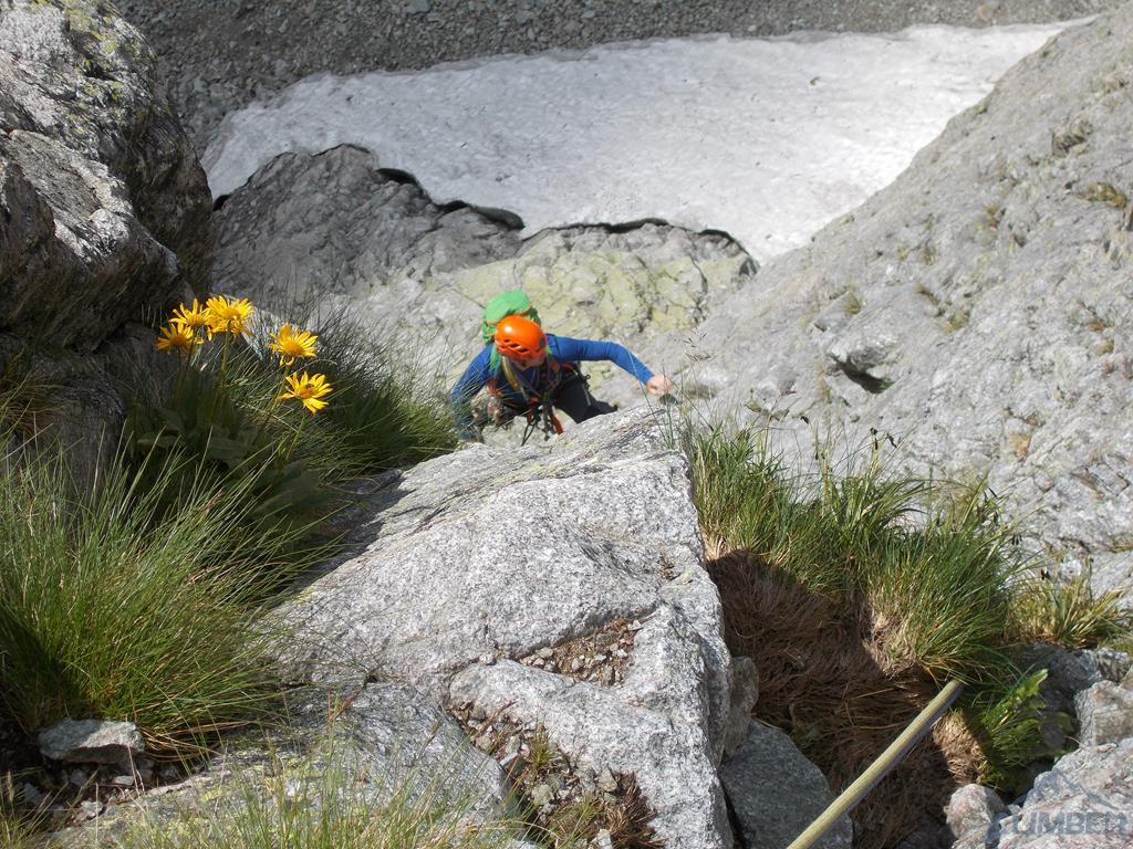 Zmieniamy się, wg topo mamy kierować się do szóstkowego kominka łatwiejszym terenem. Nie pasuje mi liczba wyciągów i wysokość ściany, a teren nade mną ewidentnie pasuje do zaznaczonego na zdjęciu ostatniego odcinka. Opis zupełnie nie pomaga - zgadza się tylko fragmentami, trzeba go więc zignorować. Gdy Jacek dochodzi pod zacięcie już jestem pewien - jesteśmy na ostatnim wyciągu. Okazuje się, że na topo z tatry nfo opis VI+,VI+,VI, dotyczył dwóch a nie trzech wyciągów i metrów na tym odcinku jest 100 (40+60) a nie 140! Tak więc komin nad kotłem, który przeszedłem miał prowadzić Jacek, a w rzeczywistości został mu ostatni, łatwy odcinek i ładne zacięcie za IV+ wyprowadzające na szczyt. Wszystko układa się w całość - półka pod nami z lewej strony jest z drogi Motyki, która w miejscu gdzie zrobiłem stanowisko łączy się ze Slámą.