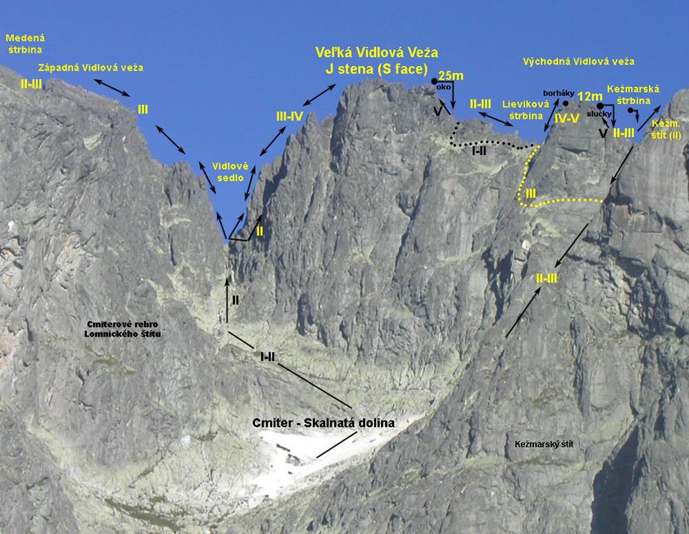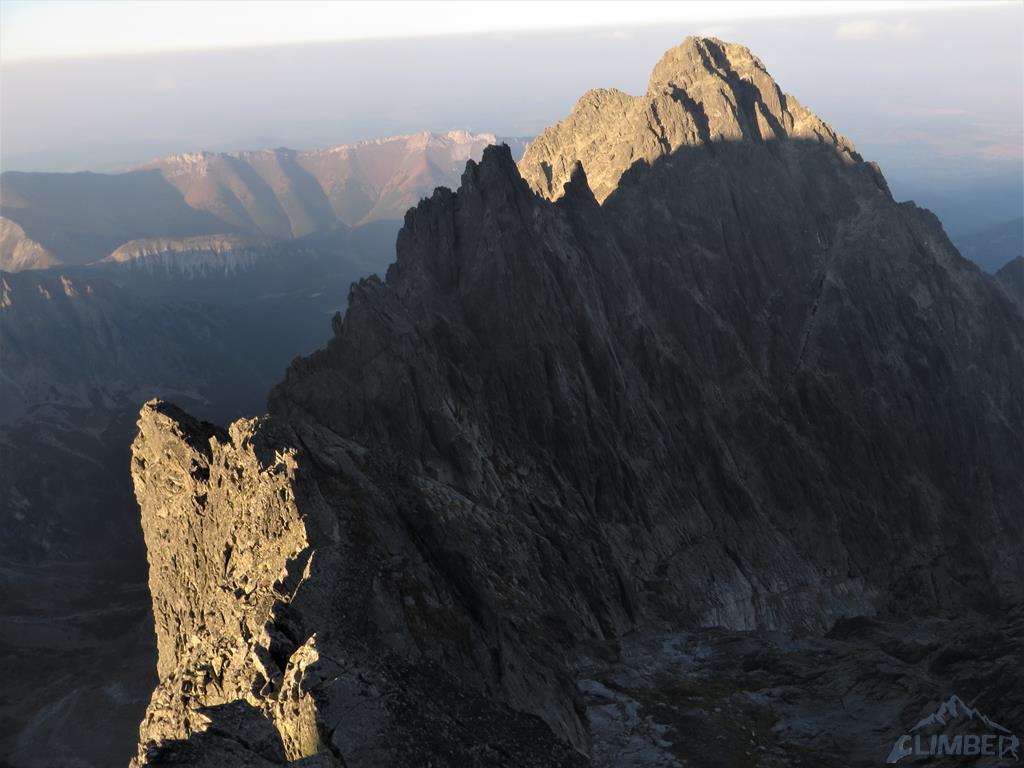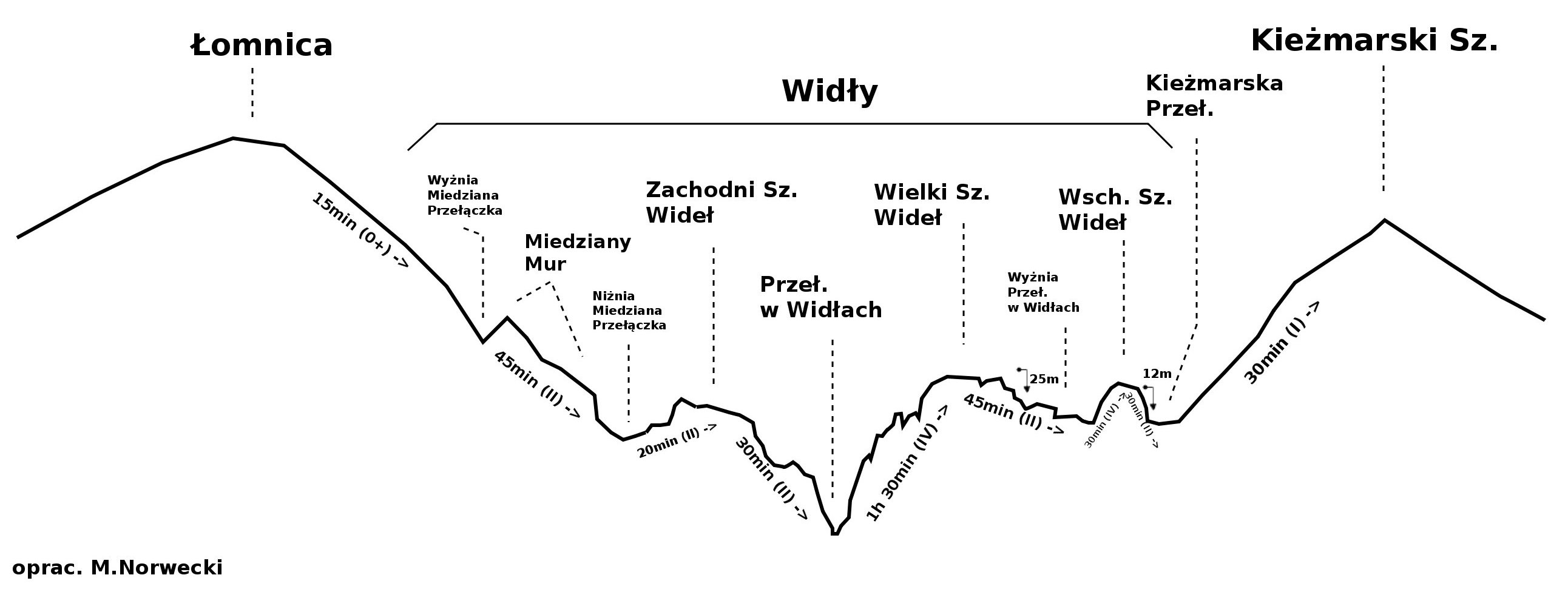Wracamy do wspinania i po chwili wchodzimy na Wschodni Szczyt Wideł, pokonując po drodze jedno piątkowe miejsce. Ze szczytu zjeżdżamy i ruszamy dalej, aż do spiętrzenia Wielkiego Szczytu Wideł (do pokonania uskok za V), na którym jesteśmy po godzinie od wyruszenia z Kieżmarskiego. Po przejściu do końca grani Wielkiego Szczytu robimy (drugi i ostatni) zjazd i trawersujemy turnię, za którą schodzi się na Przełęcz w Widłach. Koniecznie trzeba o tym pamiętać bo wiele osób w tym miejscu się myli myśląc, że po zjeździe są już na właściwej przełęczy. Stąd zaczyna się już łatwiejsza część grani, miejscami jednak mocno eksponowana i nie zupełnie lita. Wchodzimy najpierw szeroką depresją (III) na Zachodni Szczyt Wideł i trawersujemy jego piękną grań, z której schodzimy na Niżnią Miedzianą Przełęczkę. Następnie pokonujemy efektowny Miedziany Mur i przez jego turnie docieramy do Wyżniej Miedzianej Przełęczki, skąd już łatwo na Łomnicę.