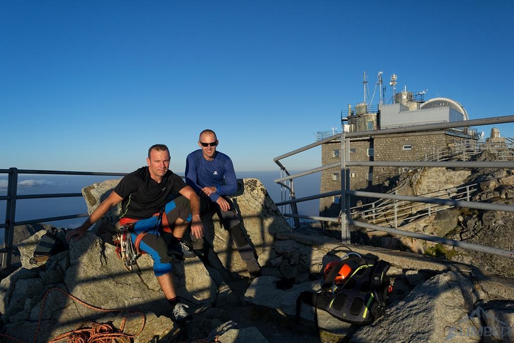 Na Kieżmarskim chwilę odpoczywamy i szykujemy się do wejścia w grań. Jest już 15-ta więc przewodnik z klientami dochodzący właśnie od strony Łomnicy pyta się czy wiemy co robimy 😊. Idziemy na lotnej (jedna cienka 30-ka złożona na pół, druga w plecaku do zjazdów) i w podejściówkach, Łukasz przodem, ja 15 metrów za nim. Schodzimy na Kieżmarską Przełęcz i po chwili zamieram w bezruchu patrząc jak mój pokrowiec z aparatem szybkuje sobie w dół. Okazuje się, że w najmniej odpowiednim momencie jakimś cudem wypięła się sprzączka od pokrowca. O dziwo słyszę jak sprzęt odbija się tylko raz, tak czy siak spisuję go jednak na straty. Przechodzę kilka metrów, dla formalności zaglądam w dół i nie wierzę własnym oczom - aparat leży 20 metrów niżej w trawiastym kociołku tuż nad przepaścią. Jeszcze bardziej dziwię się, gdy tam docieram i sprzęt odpalam, działa 😊.