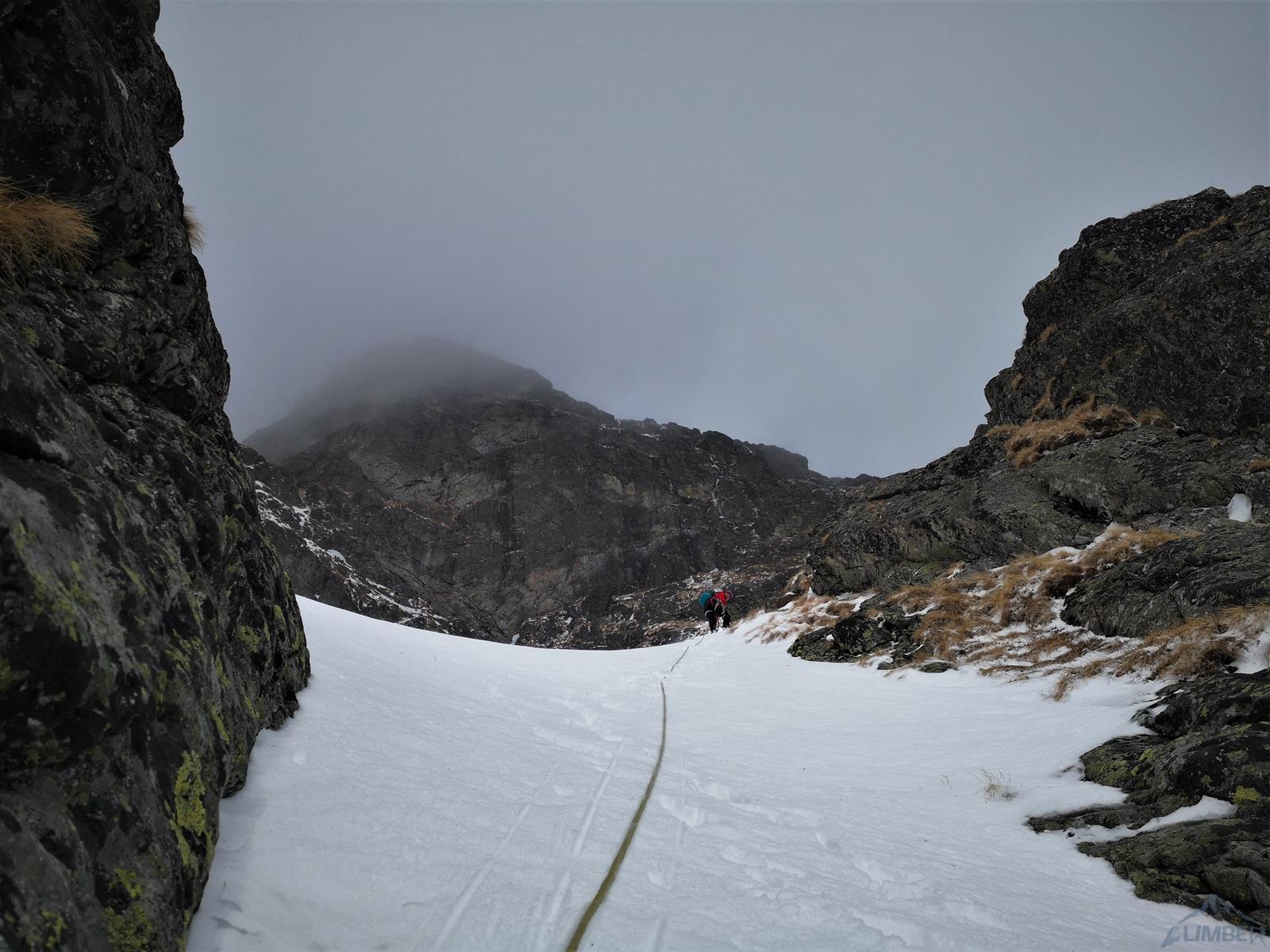 Pokonujemy jeszcze jeden łatwiejszy odcinek lodowy i wchodzimy do kotła pod spiętrzeniem szczytowym Wielickiej Baszty. Kusi nitka lodowa biegnąca ścianą w kierunku szczytu, nie ma jednak ani czasu ani warunków by wybrać tą opcję. Kontynuujemy więc naszą linią i z kotła wchodzimy w śnieżny żleb, którym żmudnie pniemy się w górę. Trudności nie ma prawie żadnych, poza ostatnim progiem gdzie czeka nas trochę skały, lodu i trawy. Do przełączki kończącej drogę dochodzimy po 4 godzinach. Podchodzimy wyżej na Dwoisty Przechód i dalej na szczyt, niestety za dużo jednak nie widać bo chmury mocno gęstnieją. Asekurujemy się na lotnej, w kilku miejscach śnieg nie wzbudza zaufania, a nas czeka trawersowanie kotłów aż do Małej Wielickiej Strażnicy. Po 16-tej docieramy do Domu Śląskiego, jemy szybki obiad i łapiemy ostatni transport w dół na parking.