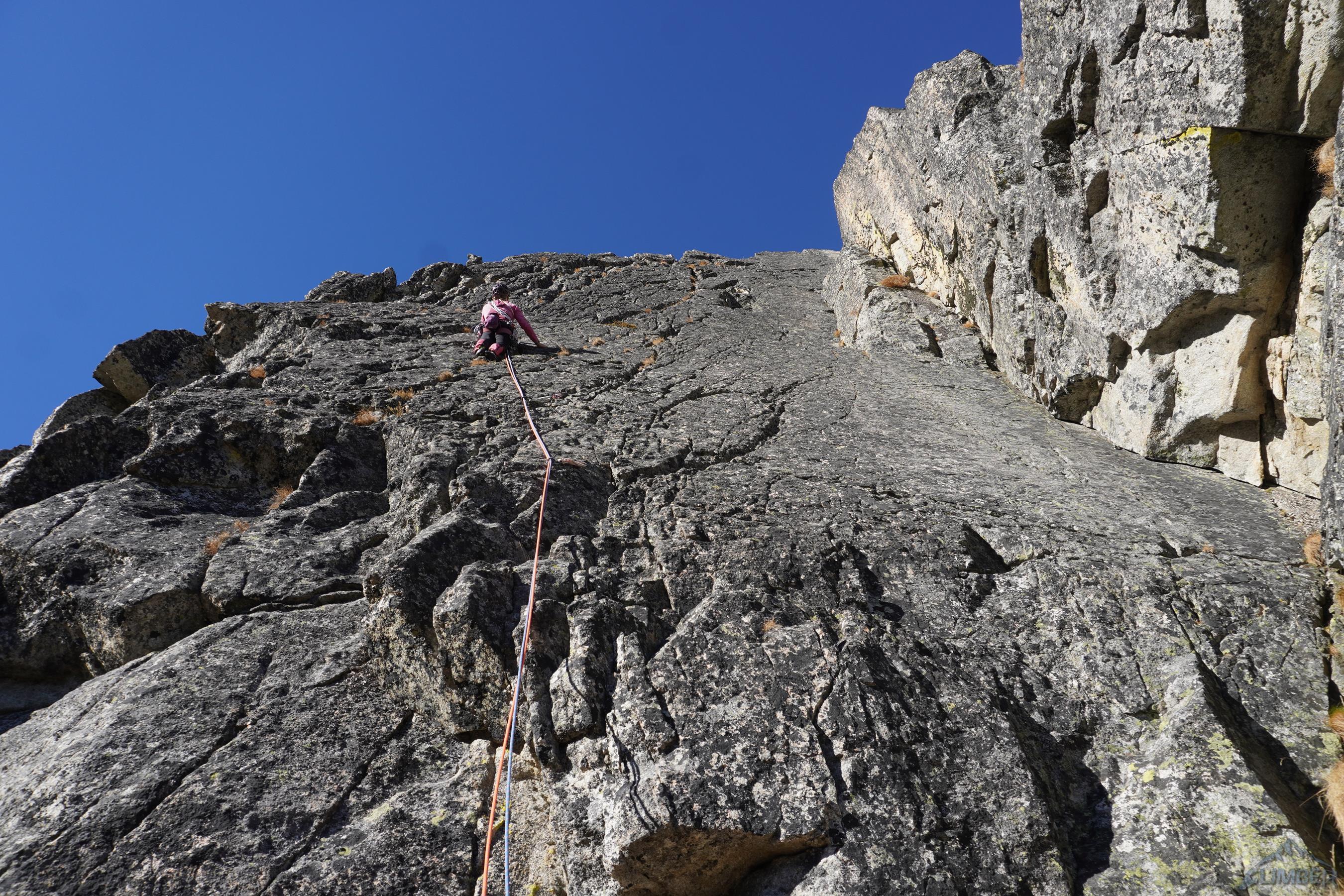 MNISZEK (E) – na mniejszym i rzadziej odwiedzanym „bracie” Mnicha z pewnością warto zrobić Direttissimę (VI R2 190m), oferującą zróżnicowane wspinanie o górskim charakterze.