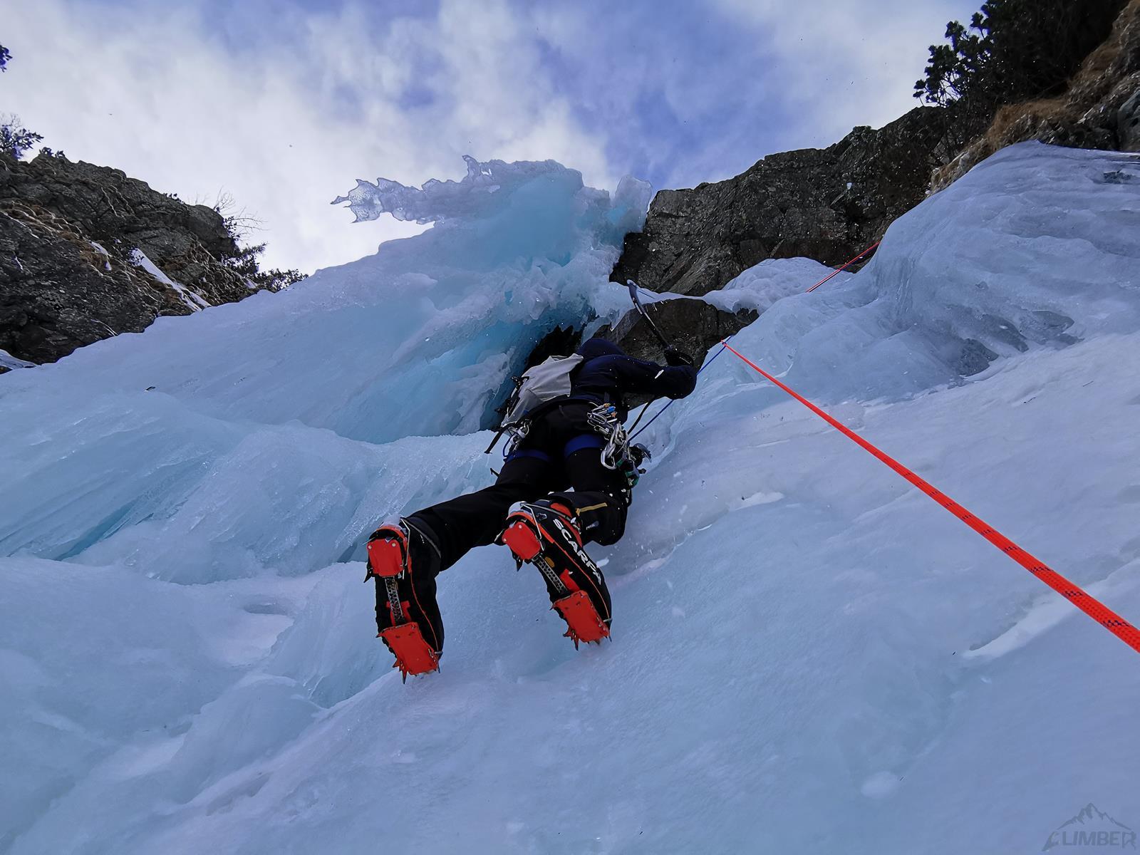 Pierwszy wyciąg ma ok. 50 metrów i przy dobrym wylodzeniu oferuje przyjemne wspinanie w trudnościach do WI3. Jeżeli skała będzie odkryta, na wyższym progu czekać może krótki odcinek drytoolowy (ok. M3-M4), warto w tym przypadku zabrać 2-3 średnie friendy (camy 0,5 do 1) lub haki. Inną atrakcją mogą być mostki lodowe nad płynącą pod spodem wodą, generalnie nie mając potwierdzonych warunków trzeba być gotowym na różne opcje. Stanowisko (haki + repy, mailony) znajduje się na skale po lewej stronie. Planując wspinanie na drugim wyciągu trudniejszym wariantem, warto rozważyć jednak własny stan po prawej – w skale lub w lodzie tuż pod górnym spiętrzeniem.
