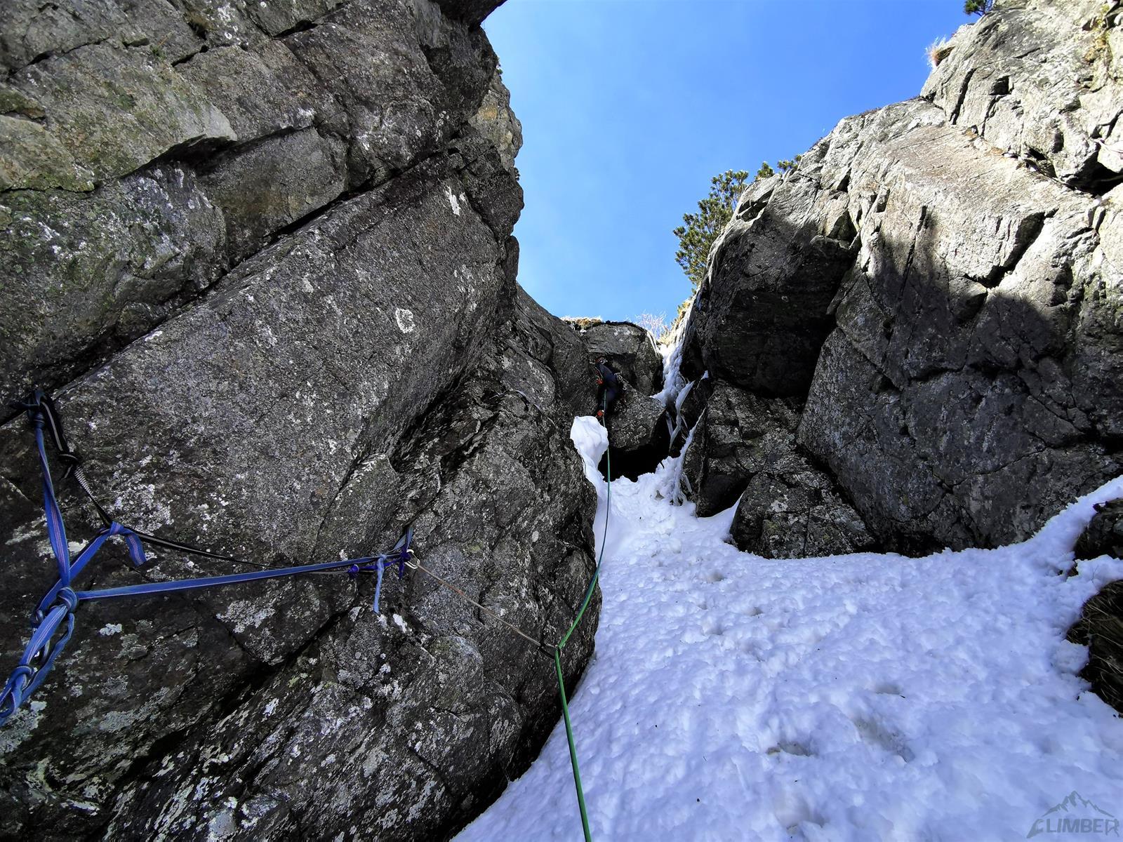 Wspinanie rozpoczynamy na wysokości ok. 1560 metrów, od pokonania ścianki znajdującej się pod Wielkim Kominem. Istnieje kilka sposobów jej przejścia, my wybieramy ten najbardziej narzucający się – wprost, oznaczony jako 1C w Mastertopo. Prowadzący dolną część drogi Michał sprawnie pokonuje zacięcie oraz płytkę (bardzo fajne wspinanie za ok. M5 z dobrą asekuracją) i łatwym już terenem dochodzi do gotowego stanowiska u wylotu żlebu opadającego spod komina. Początkowo asekurujemy go na kolejnym odcinku stąd, finalnie jednak podchodzimy kilkanaście metrów pod sam komin by lina nie dyndała w powietrzu oraz by łatwiej reagować na poczynania drugiego zespołu, który od dłuższego czasu walczy powyżej. Chłopaki odpuszczają gdy prowadzący zalicza nieprzyjemny lot i po chwili zostajemy sami.