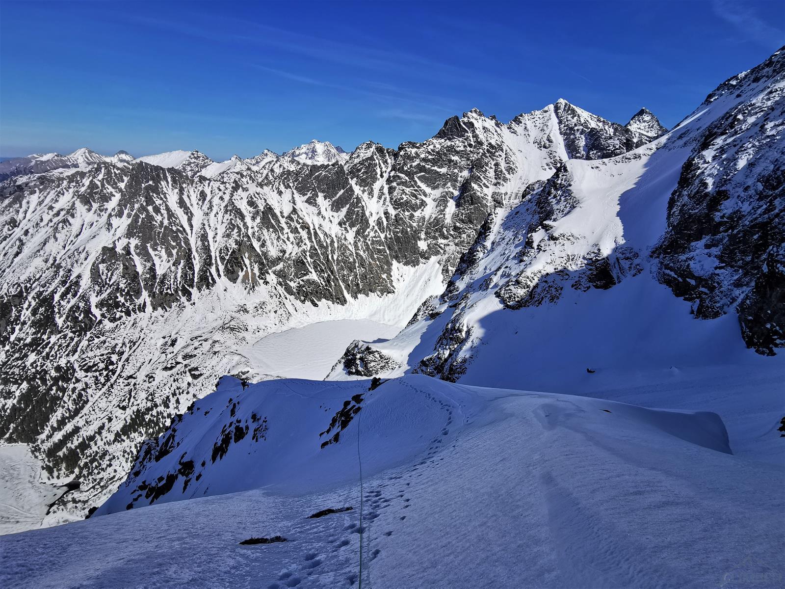 Chowamy jedną linę do plecaka, wiążemy się w trójkę do drugiej i ruszamy – idę pierwszy, podejmując się szukania linii drogi. Miejscami jest to ułatwione - dzięki pozostałościom po śladach innego zespołu, który podjął próbę przejścia Filara trzy tygodnie wcześniej. Po ostatnim opadzie śnieg nie jest jednak zbyt dobry i o betonach możemy tylko pomarzyć. Na szczęście przebieg drogi jest świetnie rozrysowany w Mastertopo, a wątpliwości dotyczą tylko pojedynczych miejsc oraz dojścia w okolice Bandziochowej Strażnicy, gdzie jest sporo opcji. Cały teren od Trawnika do grani jest w większości jedynkowo-dwójkowy, miejsca trójkowe zdarzają się sporadycznie i wynikają raczej z wyboru mniej optymalnej konfiguracji przejścia. Zdarza mi się to już na dojściu do Siodełka nad Czołówką (ok. 1790 m.), gdzie z powodu słabego śniegu wspinam się w załupie tuż przy Górnej Ścianie.