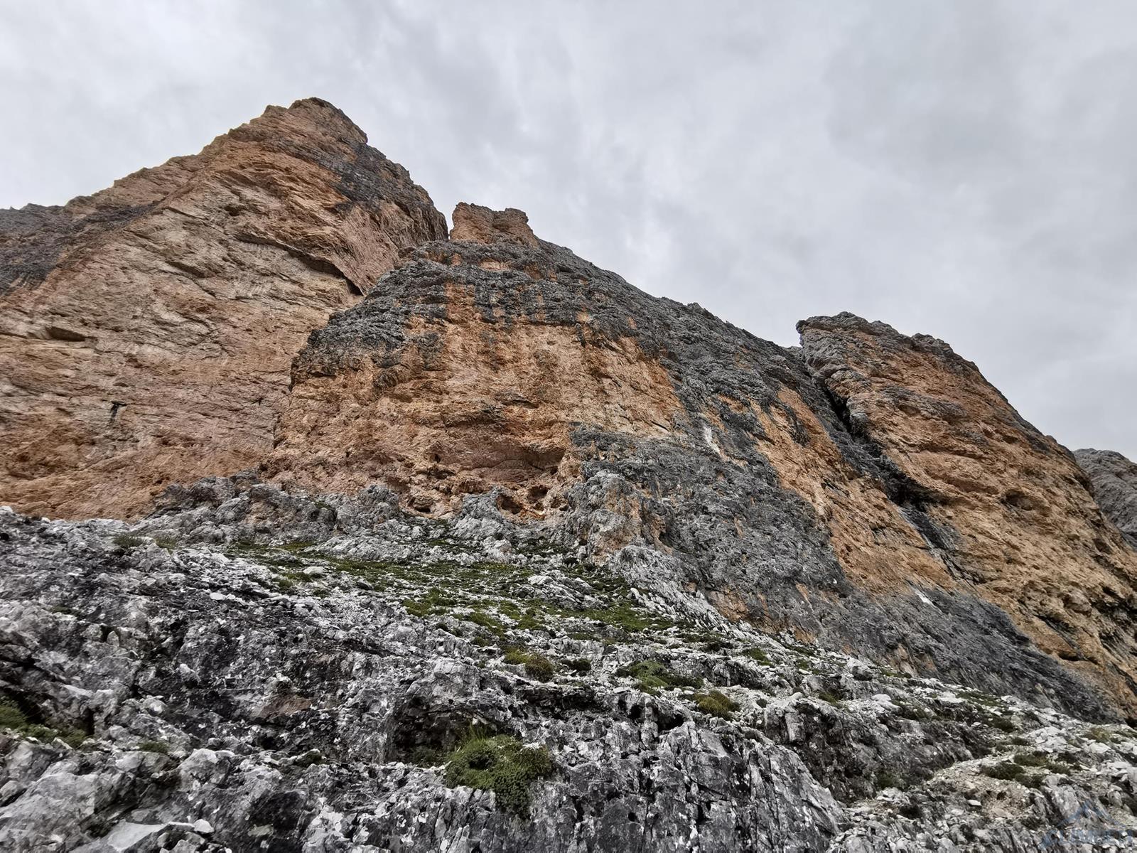 Kolejny wyciąg to wspinanie zupełnie inne niż do tej pory – pokonujemy ciąg zacięć po prawej stronie (haki i własna, ok. 6a), mijamy małą grotę i po 50 metrach wychodzimy na wygodną półkę po lewej stronie (miały być dwa haki ale nie namierzyłem). Wyciąg następny to mała łamigłówka – ciężko zlokalizować opisywaną w topo płytę bo teren jest bardzo rozległy. Generalnie kierujemy się skośnie w lewo, celując w przełamanie ściany nad wyraźnym zacięciem po lewej i staramy się by trudności nie przekroczyły V+. Tutaj można już odetchnąć – łączymy się z drogą Alverà-Pompanin/Primo Spigolo i do końca pozostają nam dwa łatwe (IV+) i przyjemne wyciągi – my pokonujemy je na lotnej. Idziemy zacięciami na prawo od ostrza filara, po drodze pokonując uklamione przewieszki. Ostatni fragment to już łatwa rampa kierująca nas do charakterystycznego okna skalnego, za którym wychodzimy w łatwy teren. Ewidentna ścieżka w poprzek zbocza prowadzi nas w kierunku urwiska, które opisywałem w relacji z Constantini-Ghedina - po tym fragmencie już całkiem bezpiecznie kontynuujemy do ruin starego schroniska (w sumie ok. 30 minut) i szlaku prowadzącego do Rifugio Dibona (dodatkowe 45 minut). Warto jednak minąć ruiny i w kilka minut podejść do schroniska Giussani na zasłużonego, pysznego weissbier'a 😊.