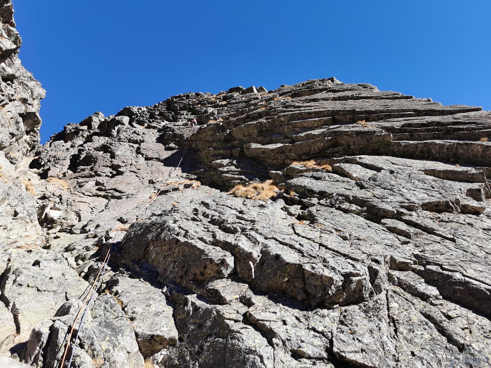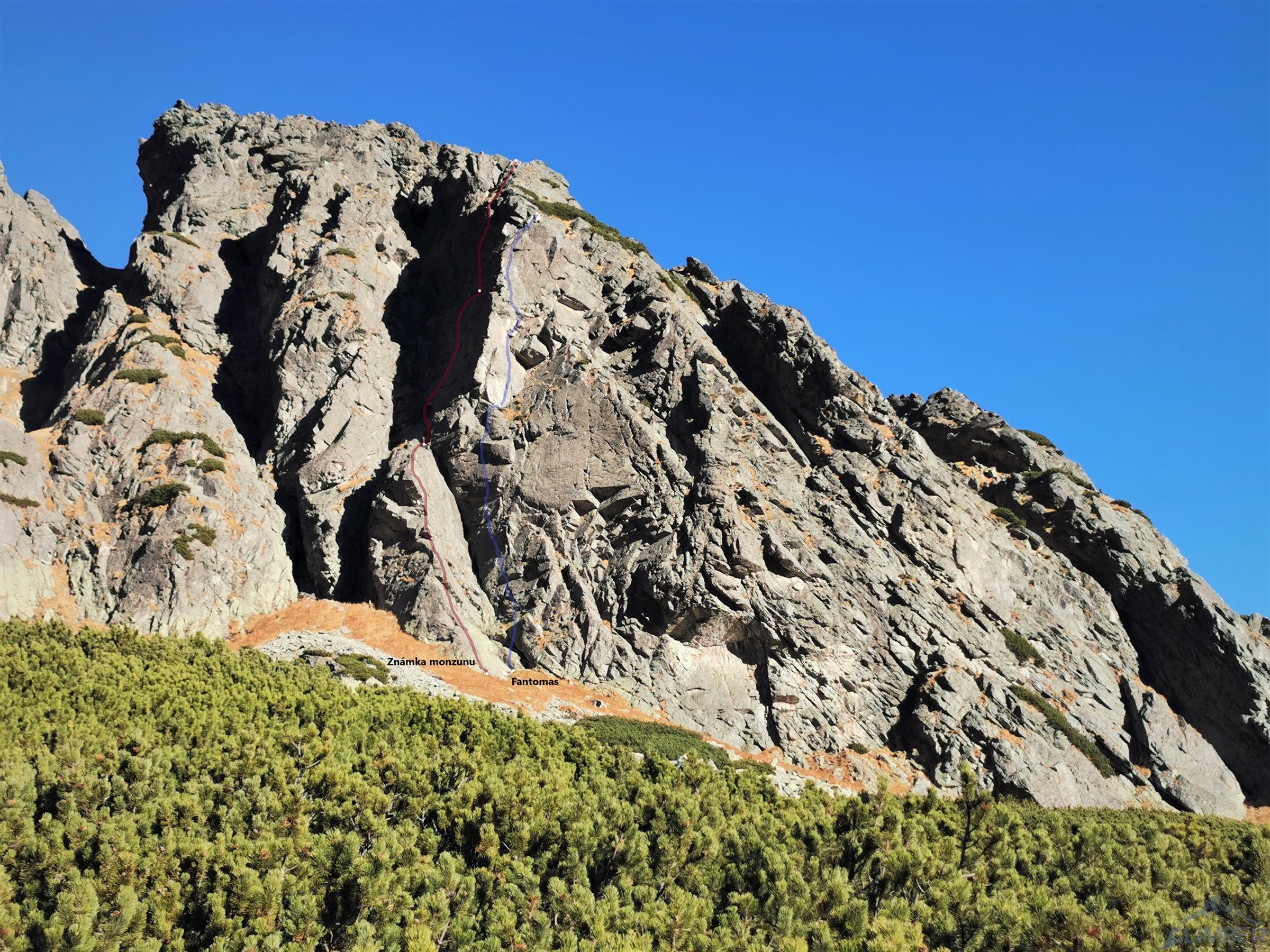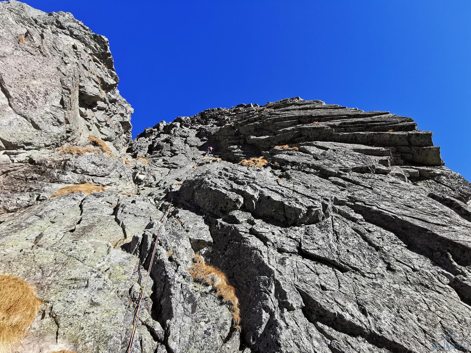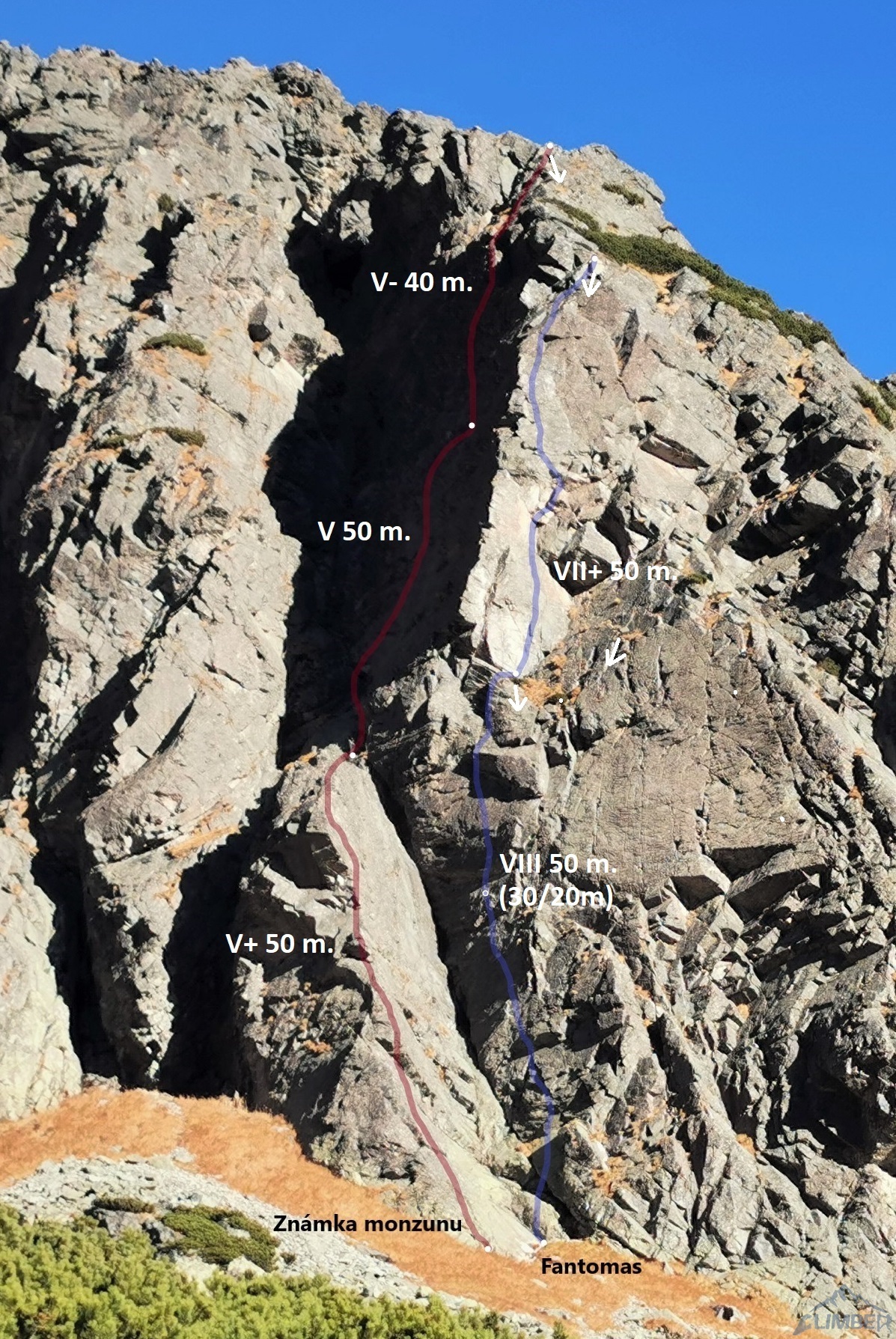 Na drugim wciągu (V) przechodzimy w lewo i wspinamy się płytami wypatrując pierwszego spita, po dojściu do kolejnego skręcamy w prawo, przechodzimy uklamiony okapik. Nad nim trawersujemy mocno w lewo (trzeci spit) aż do stanowiska. Trzeci odcinek (V-) zaczyna się świetnie urzeźbioną ścianką po lewej, z której wchodzimy do podciętego zacięcia (hak). Po wyjściu w łatwy teren przechodzimy na żebro, którym kontynuujemy aż do finalnego stanowiska z taśmami i mailonami. Stąd czeka nas ok. 20 metrów zjazdu/zejścia granią do łańcucha i dwa dłuższe zjazdy - Korsvoldovem lub Fantomasem. Známkę robiłem dodatkowo w 2014 roku, po innym klasyku, drodze Cez Knihu - relacja TUTAJ.