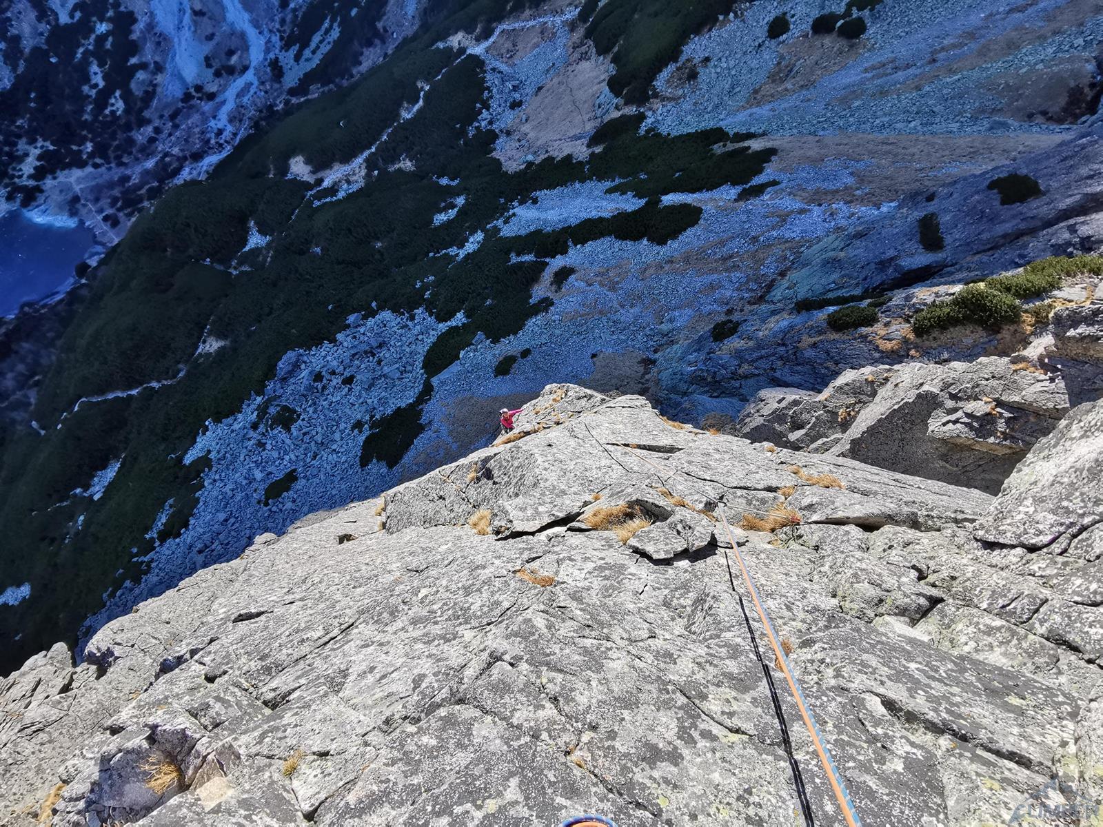 Kolejny wyciąg (VII+) w dolnej części ma zdecydowanie inny, bardziej siłowy charakter od poprzedniego, ale jest co najmniej równie ładny. Zaraz nad stanowiskiem czeka nas przewieszona ścianka z ciekawym przewinięciem, a trochę wyżej – efektowne ruchy między okapami. Na szczęście udaje się za pierwszym razem, asekurującą partnerkę dopadł już bowiem cień i momentalnie robi się zimno. Trudności są obite (generalnie większość drogi to S2), po przejściu na górne płyty czeka nas jeszcze ok. 20 metrów do stanowiska – jeden/dwa friendy mogą się przydać. Trzymamy się lewej strony, po prawej rysami kończy Korsvoldov, dalej zacięciem inny klasyk – Čepela (VI+). Po dwóch szybkich zjazdach jesteśmy z powrotem pod ścianą i zadowoleni z kolejnego udanego dnia w Tatrach schodzimy w dół, podziwiając mroczną i mroźną już ścianę Małego Kieżmarskiego Szczytu.