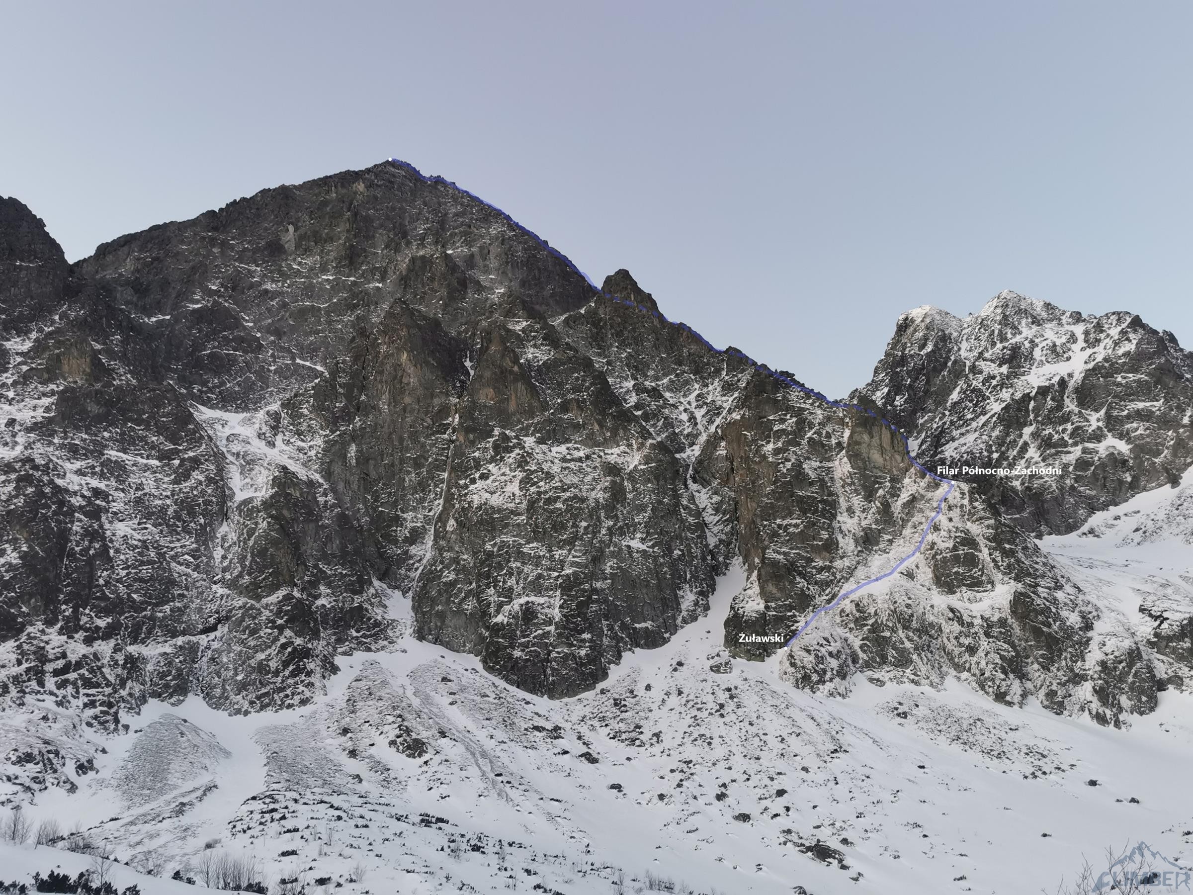 Tym razem z koordynowanym przeze mnie klubowym obozem zawitaliśmy do Doliny Kieżmarskiej. Pierwszego dnia pobytu, z okazji urodzin Ani, proponuję jej piękną i długą alpiniadę – Północno-Zachodni Filar (Grań) Małego Kieżmarskiego Szczytu, zwany potocznie Filarem Grosza. Wspinaczkę postanawiamy dodatkowo wydłużyć – zamiast podchodzić przez Dolinę Dziką, startujemy od podstawy ściany Żuławskim. Pogoda i warunki śniegowe są bardzo dobre – dzięki temu prawie całość pokonujemy na lotnej asekuracji. Filara nie należy jednak lekceważyć – do przejścia jest ponad kilometr, co wymaga odpowiedniego zapasu sił jak i sprawnego poruszania się zespołu w zróżnicowanym terenie mikstowym i skalnym.