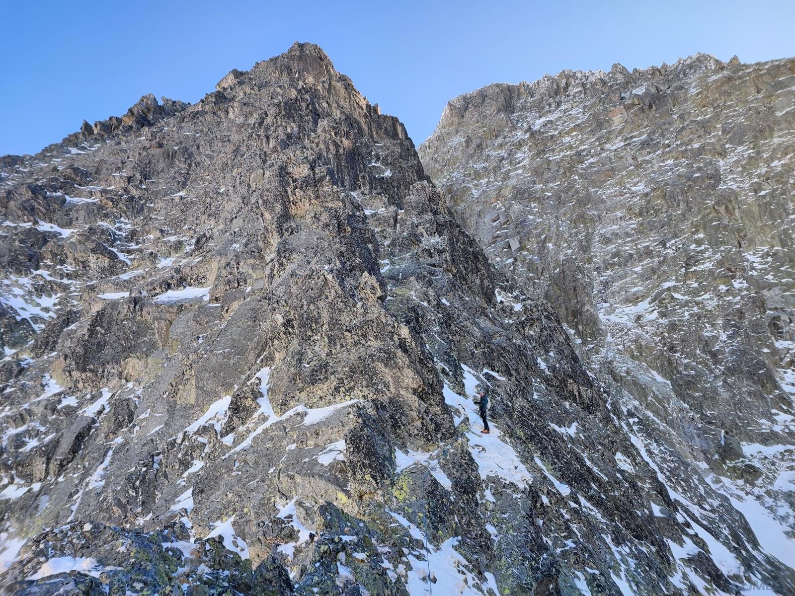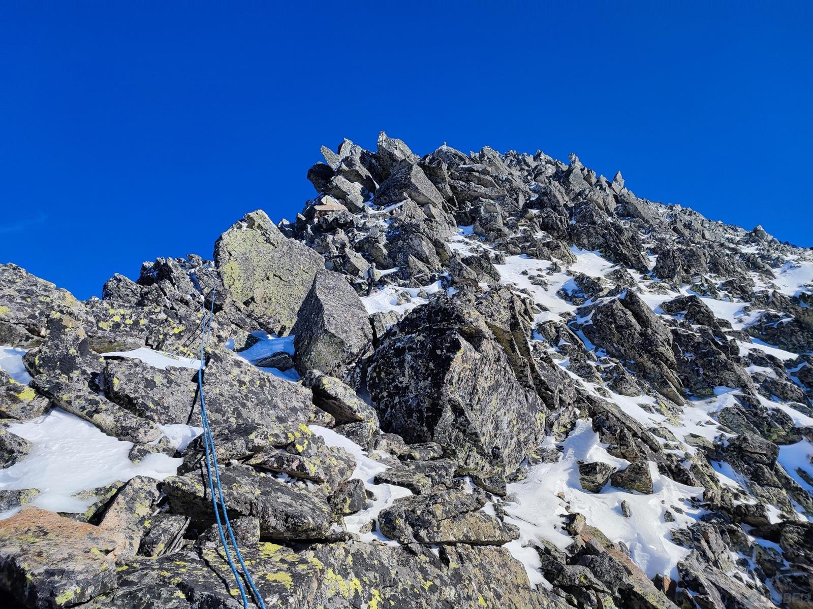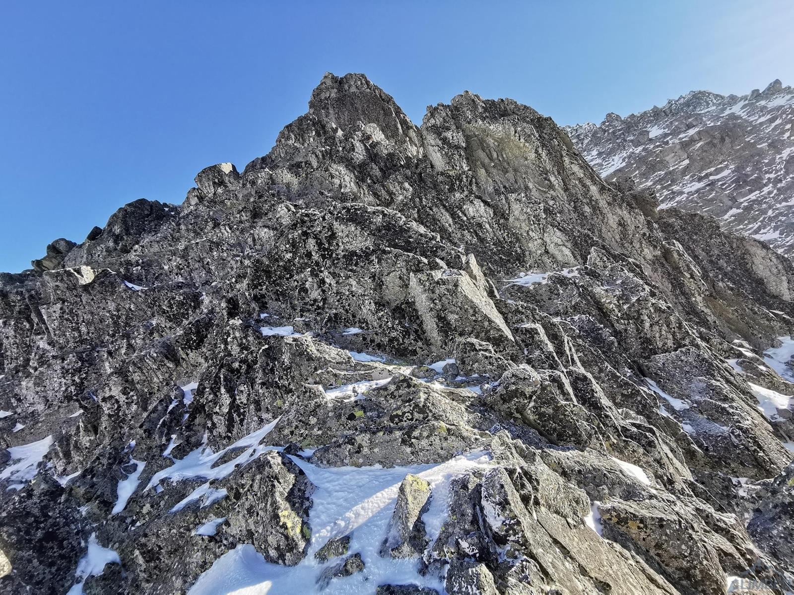 Z przełączki (znajdziemy na niej stanowisko z łańuchem) ruszamy wprost do góry, szukając słabych punktów na żebrze/grani – z dołu wydaje się trudniej niż jest w rzeczywistości (letnie II-III). Idziemy kilka długości liny, pokonując na przemian skalne ścianki i niewielkie depresje pomiędzy nimi – w naszym przypadku wypełnione świetnym firnem. Kierujemy się cały czas z odchyleniem w lewą stronę i w pewnym momencie wychodzimy na wyraźne wypłaszczenie. Lawirując pomiędzy skalnymi blokami idziemy w kierunku najwyższego punktu grani i po jej przełamaniu wierzchołek mamy już na wyciągnięcie ręki. Gratuluję solenizantce wytrwałości, którą wykazać musiała się by w dniu urodzin przejść ponad kilometrową drogę i podziwiamy widoki.
