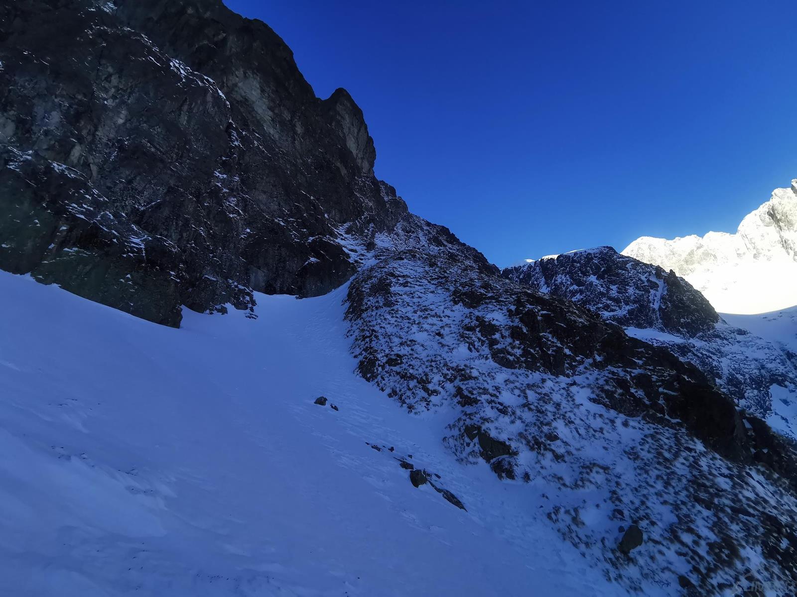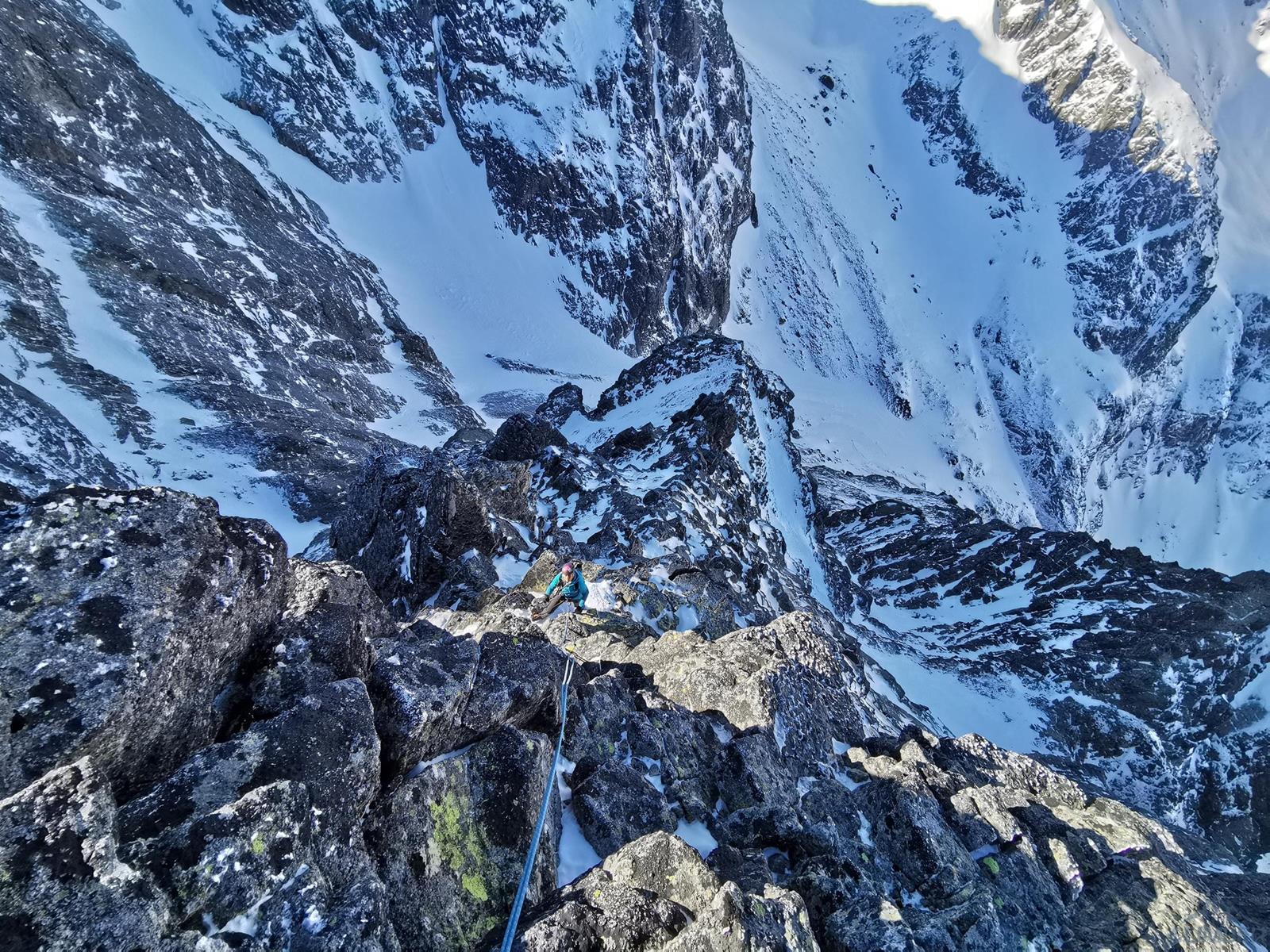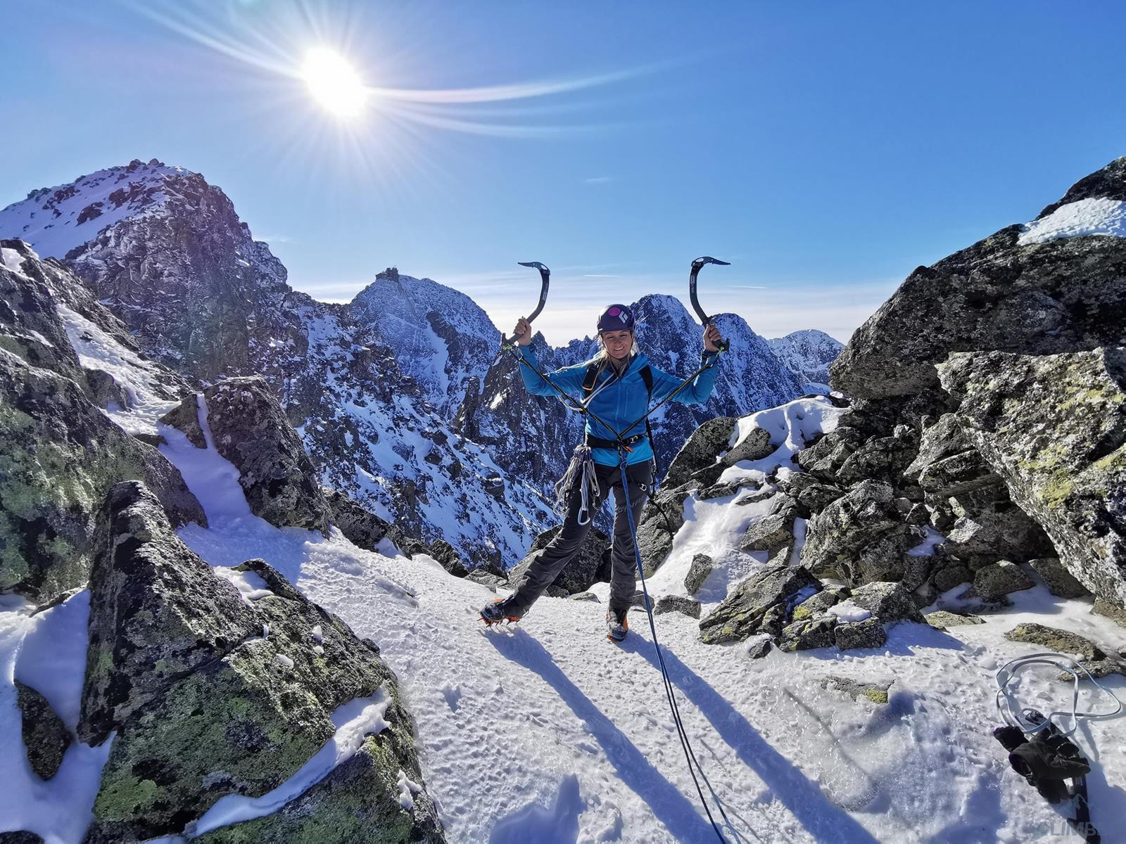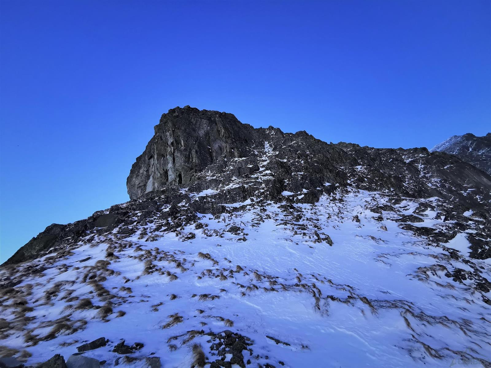 Z przełączki (znajdziemy na niej stanowisko z łańuchem) ruszamy wprost do góry, szukając słabych punktów na żebrze/grani – z dołu wydaje się trudniej niż jest w rzeczywistości (letnie II-III). Idziemy kilka długości liny, pokonując na przemian skalne ścianki i niewielkie depresje pomiędzy nimi – w naszym przypadku wypełnione świetnym firnem. Kierujemy się cały czas z odchyleniem w lewą stronę i w pewnym momencie wychodzimy na wyraźne wypłaszczenie. Lawirując pomiędzy skalnymi blokami idziemy w kierunku najwyższego punktu grani i po jej przełamaniu wierzchołek mamy już na wyciągnięcie ręki. Gratuluję solenizantce wytrwałości, którą wykazać musiała się by w dniu urodzin przejść ponad kilometrową drogę i podziwiamy widoki.