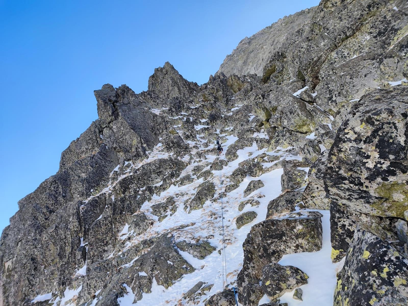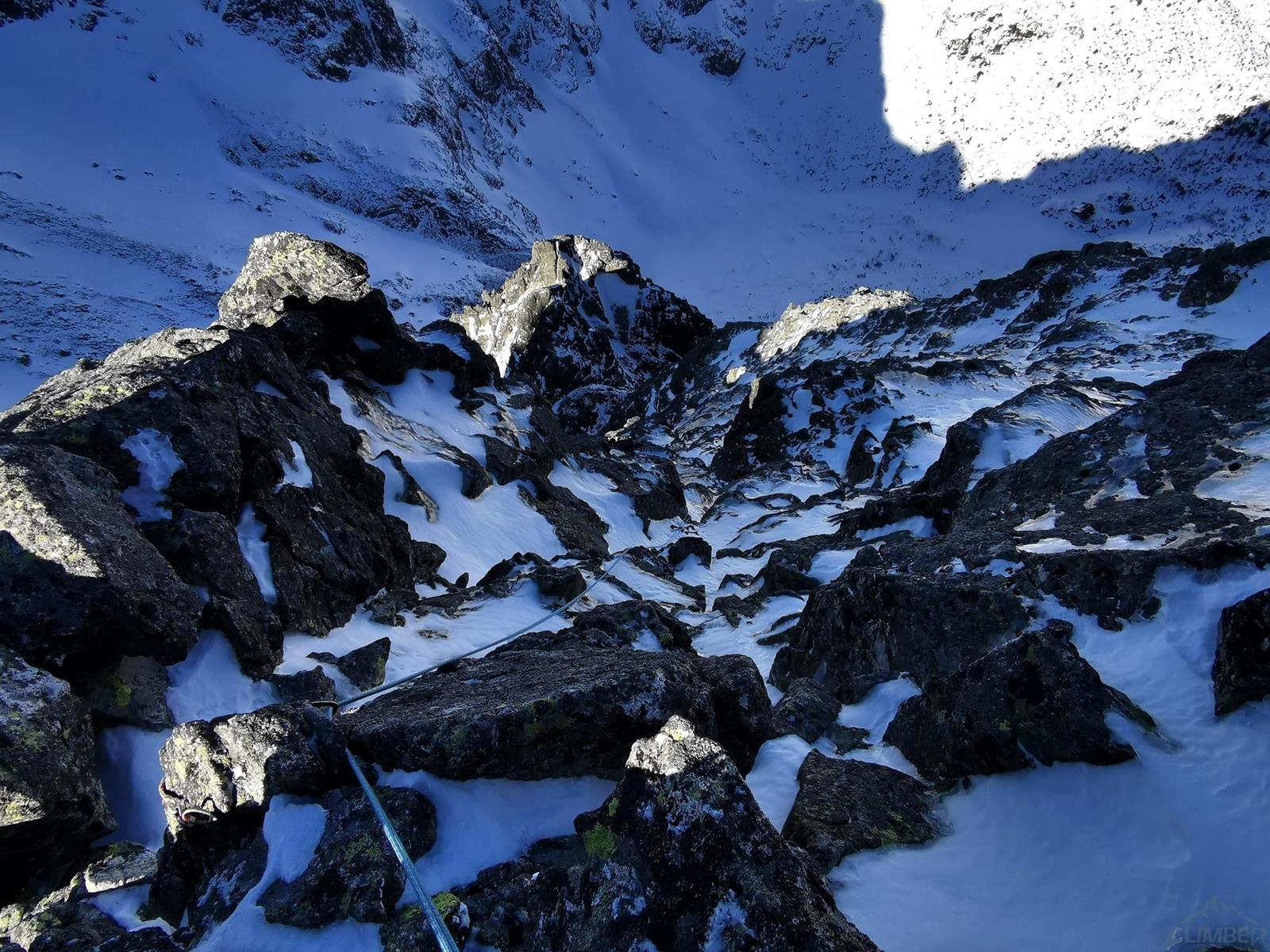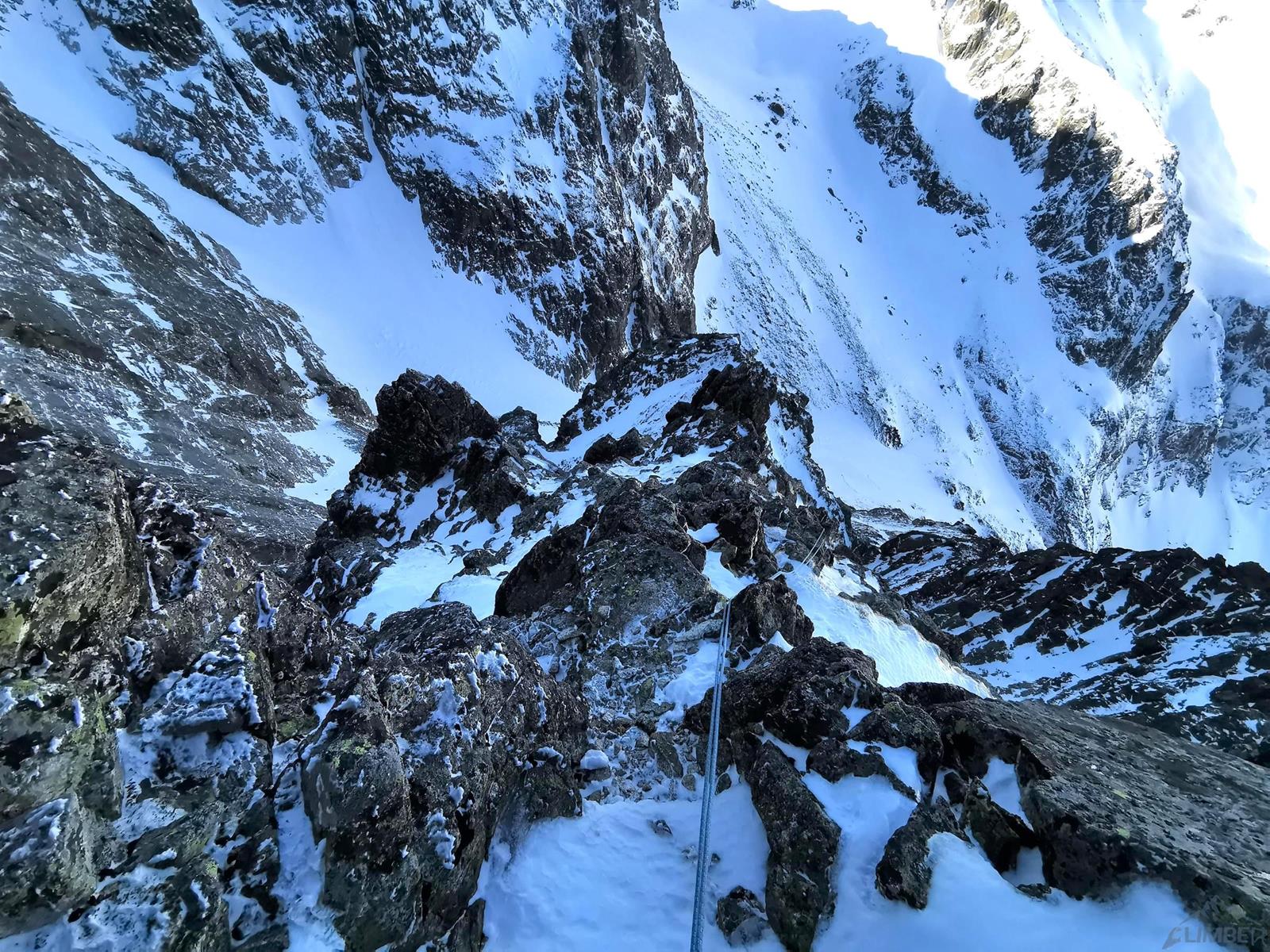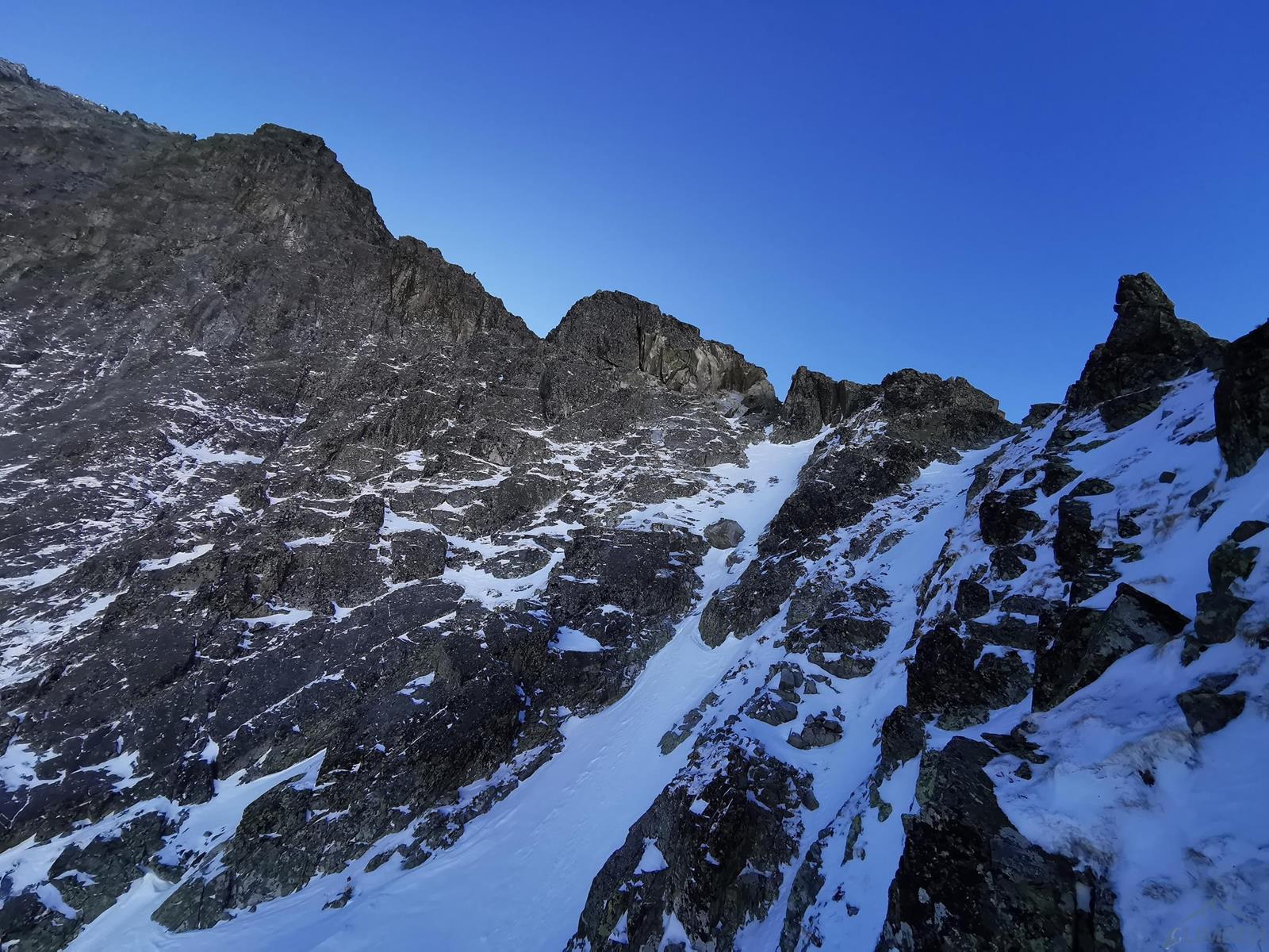 Tutaj trzeba podjąć decyzję czy idziemy dalej czy schodzimy (w lewo) Niemiecką Drabiną do Doliny Kieżmarskiej. Wydaje się, że jesteśmy już wysoko ale do szczytu pozostaje jeszcze 300 metrów przewyższenia, co przekłada się na 400-500 metrów terenu o charakterze graniowym, do tego dodać trzeba żmudne zejście przez Dolinę Huńcowską. W naszym przypadku zarówno pogoda jak i czas sprzyjają, po krótkiej przerwie ruszamy wiec do góry. Ponownie wybieramy zimowy wariant opisany również na Drytoolingu – oryginalnie Grosz wspinał się w 1912 do góry żebrem nad Złotą Przełączką, my tymczasem wybieramy to z prawej, nad Miedzianym Przechodem – jak dwadzieścia lat później poszli Szczepański i Perlberżanka (ponownie odsyłam do topo).