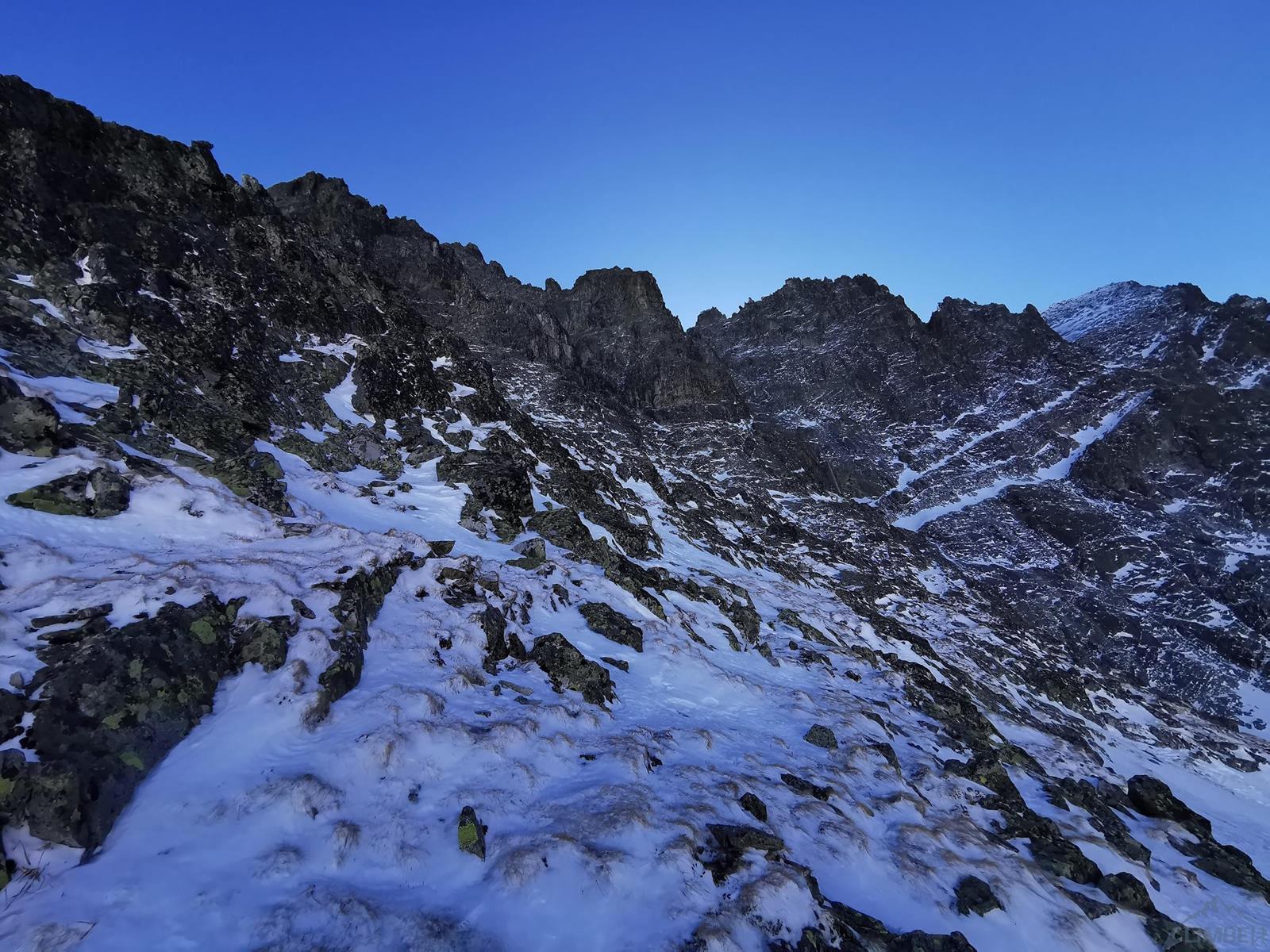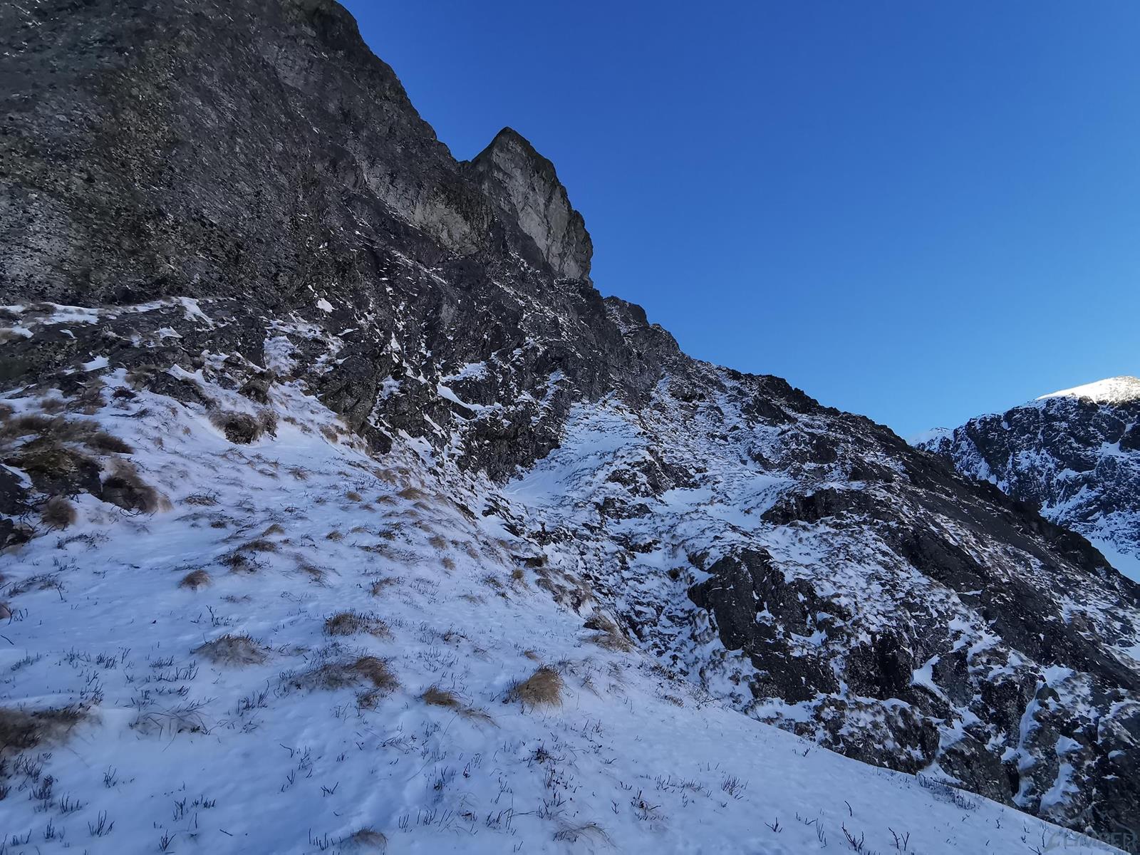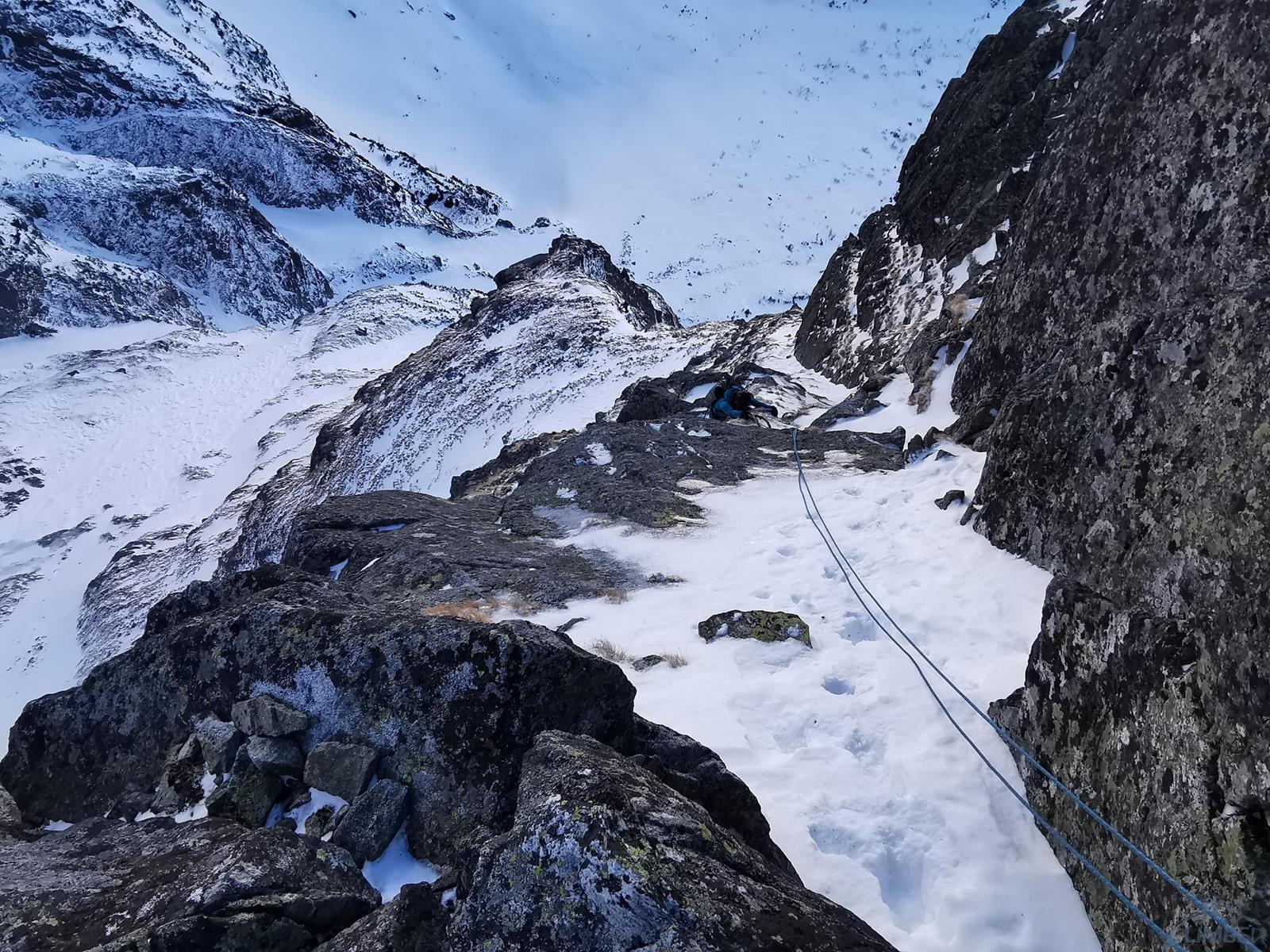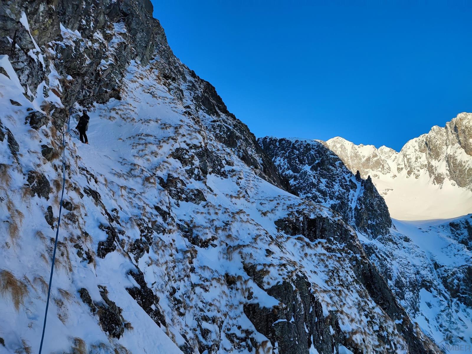 Tutaj trzeba podjąć decyzję czy idziemy dalej czy schodzimy (w lewo) Niemiecką Drabiną do Doliny Kieżmarskiej. Wydaje się, że jesteśmy już wysoko ale do szczytu pozostaje jeszcze 300 metrów przewyższenia, co przekłada się na 400-500 metrów terenu o charakterze graniowym, do tego dodać trzeba żmudne zejście przez Dolinę Huńcowską. W naszym przypadku zarówno pogoda jak i czas sprzyjają, po krótkiej przerwie ruszamy wiec do góry. Ponownie wybieramy zimowy wariant opisany również na Drytoolingu – oryginalnie Grosz wspinał się w 1912 do góry żebrem nad Złotą Przełączką, my tymczasem wybieramy to z prawej, nad Miedzianym Przechodem – jak dwadzieścia lat później poszli Szczepański i Perlberżanka (ponownie odsyłam do topo).