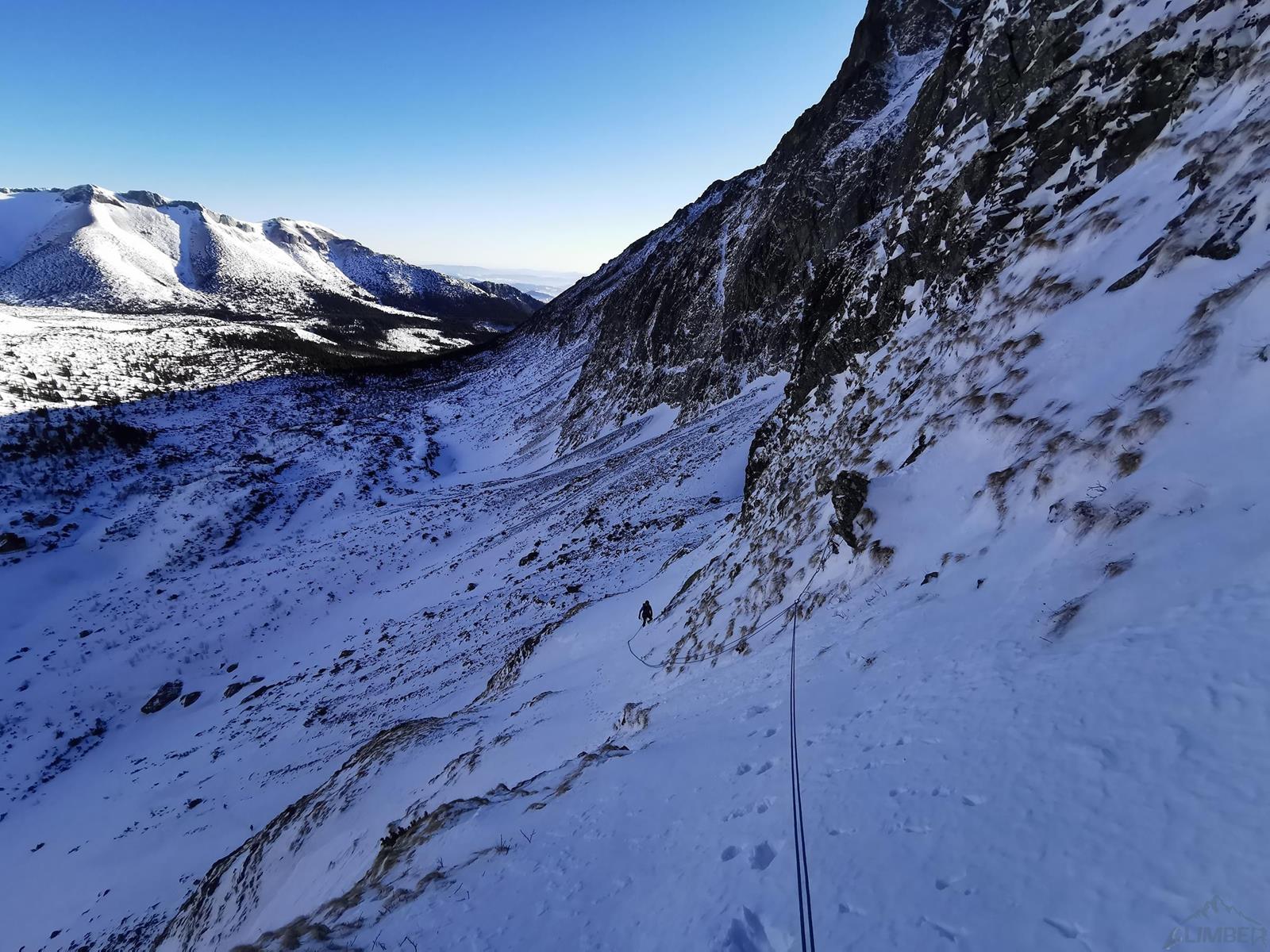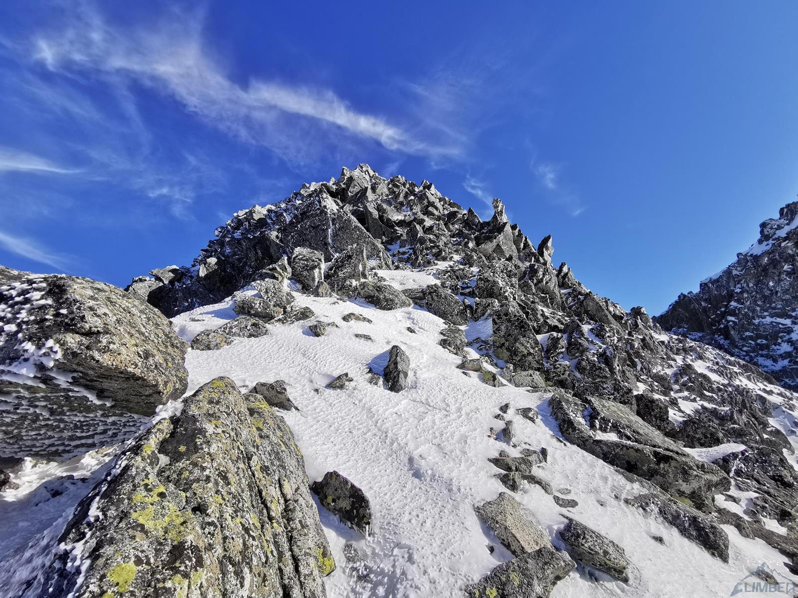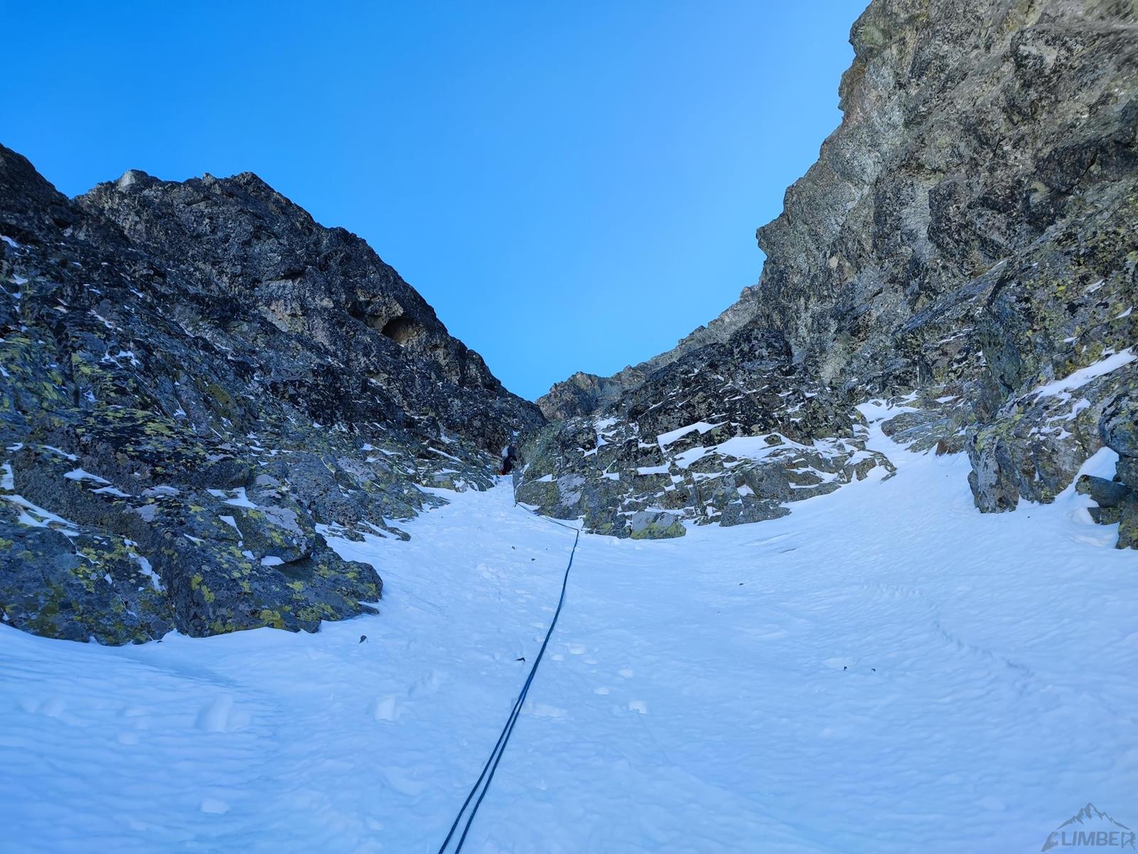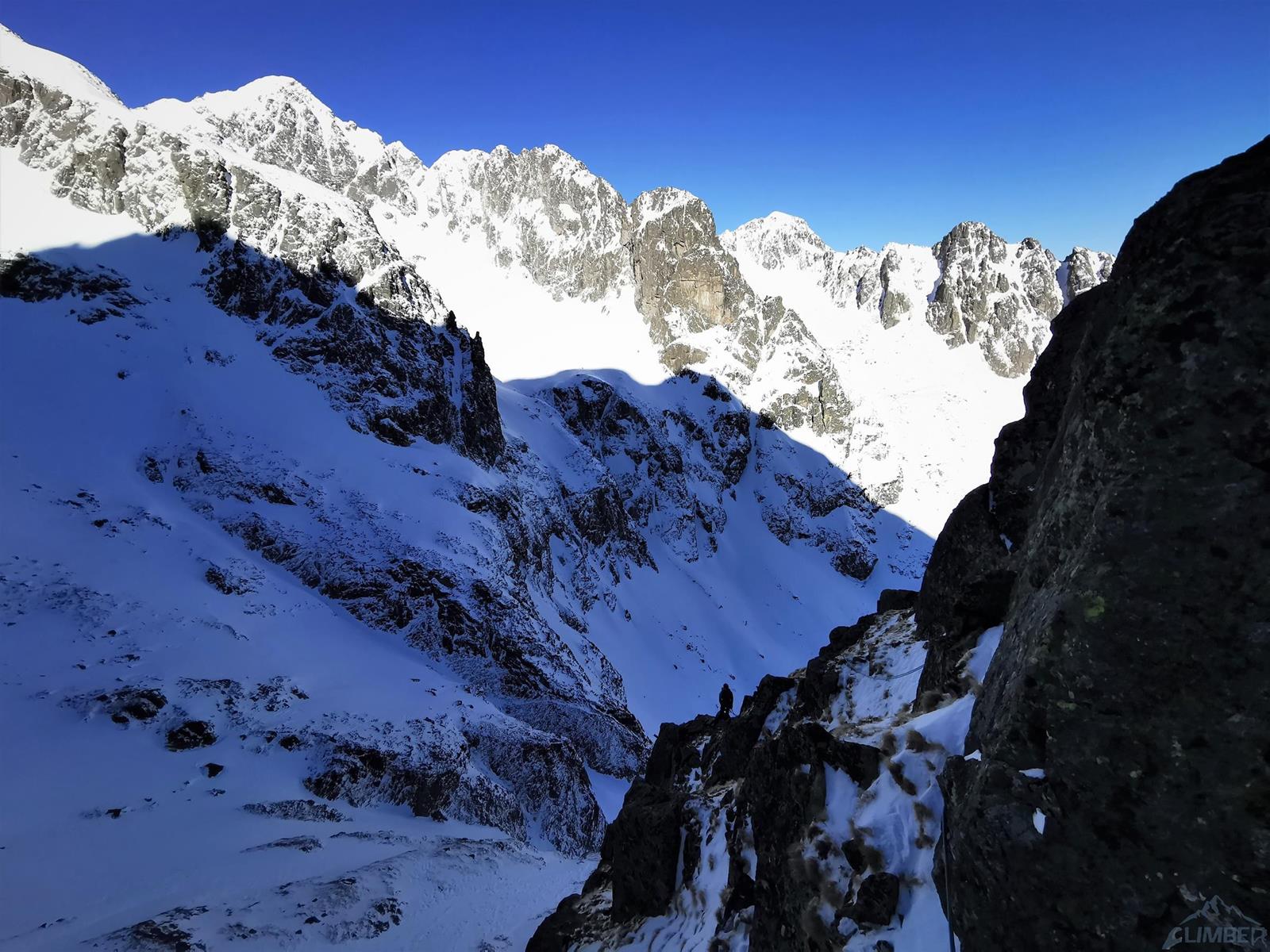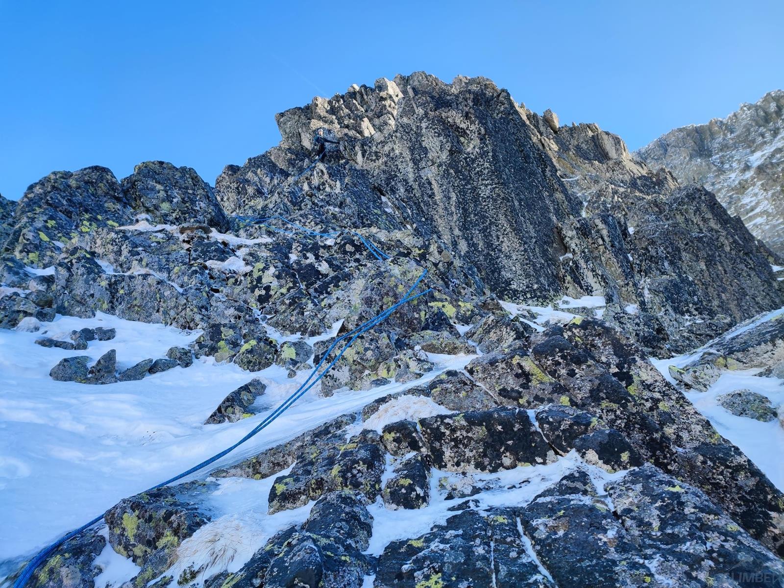 Tutaj trzeba podjąć decyzję czy idziemy dalej czy schodzimy (w lewo) Niemiecką Drabiną do Doliny Kieżmarskiej. Wydaje się, że jesteśmy już wysoko ale do szczytu pozostaje jeszcze 300 metrów przewyższenia, co przekłada się na 400-500 metrów terenu o charakterze graniowym, do tego dodać trzeba żmudne zejście przez Dolinę Huńcowską. W naszym przypadku zarówno pogoda jak i czas sprzyjają, po krótkiej przerwie ruszamy wiec do góry. Ponownie wybieramy zimowy wariant opisany również na Drytoolingu – oryginalnie Grosz wspinał się w 1912 do góry żebrem nad Złotą Przełączką, my tymczasem wybieramy to z prawej, nad Miedzianym Przechodem – jak dwadzieścia lat później poszli Szczepański i Perlberżanka (ponownie odsyłam do topo).