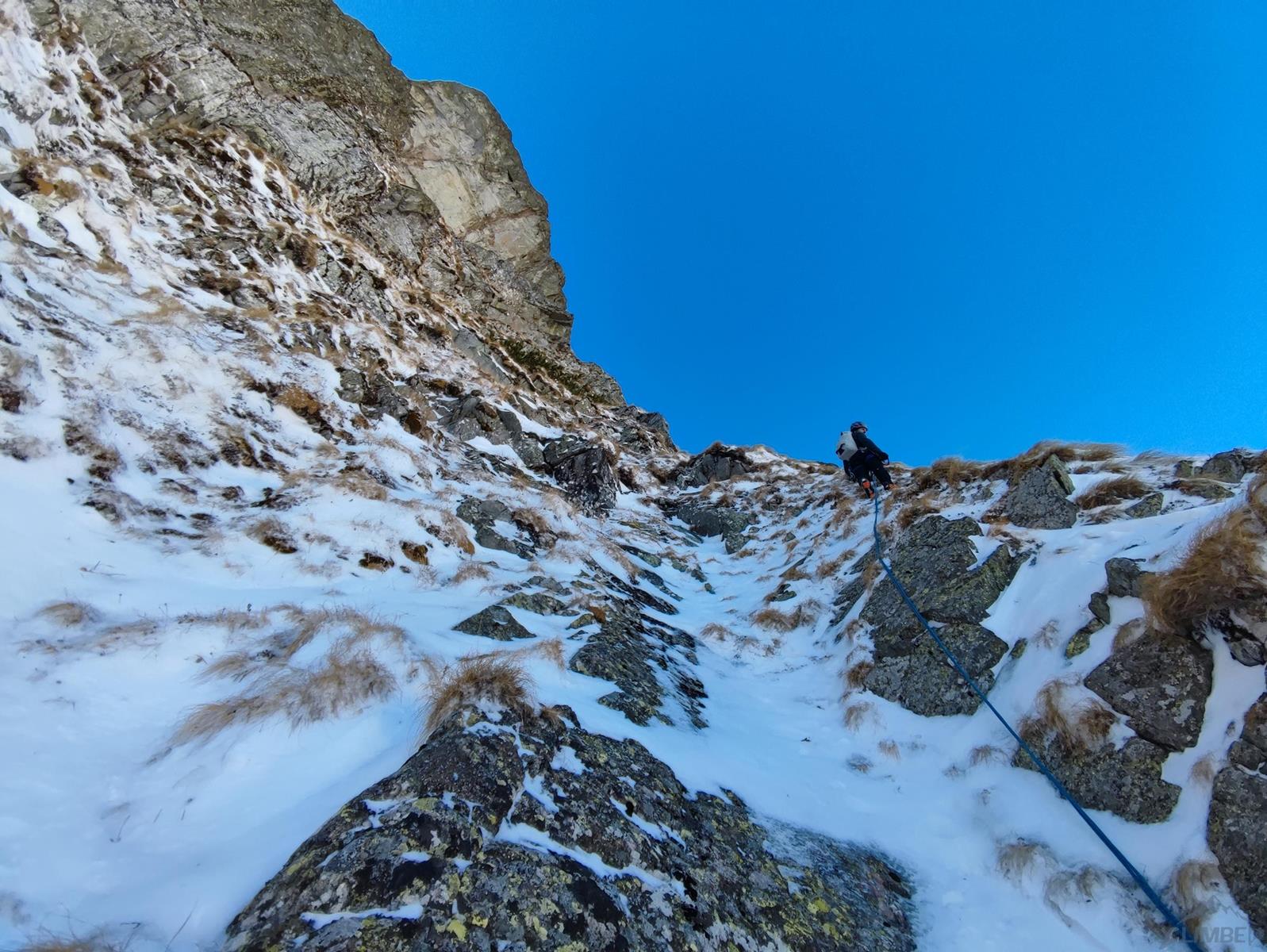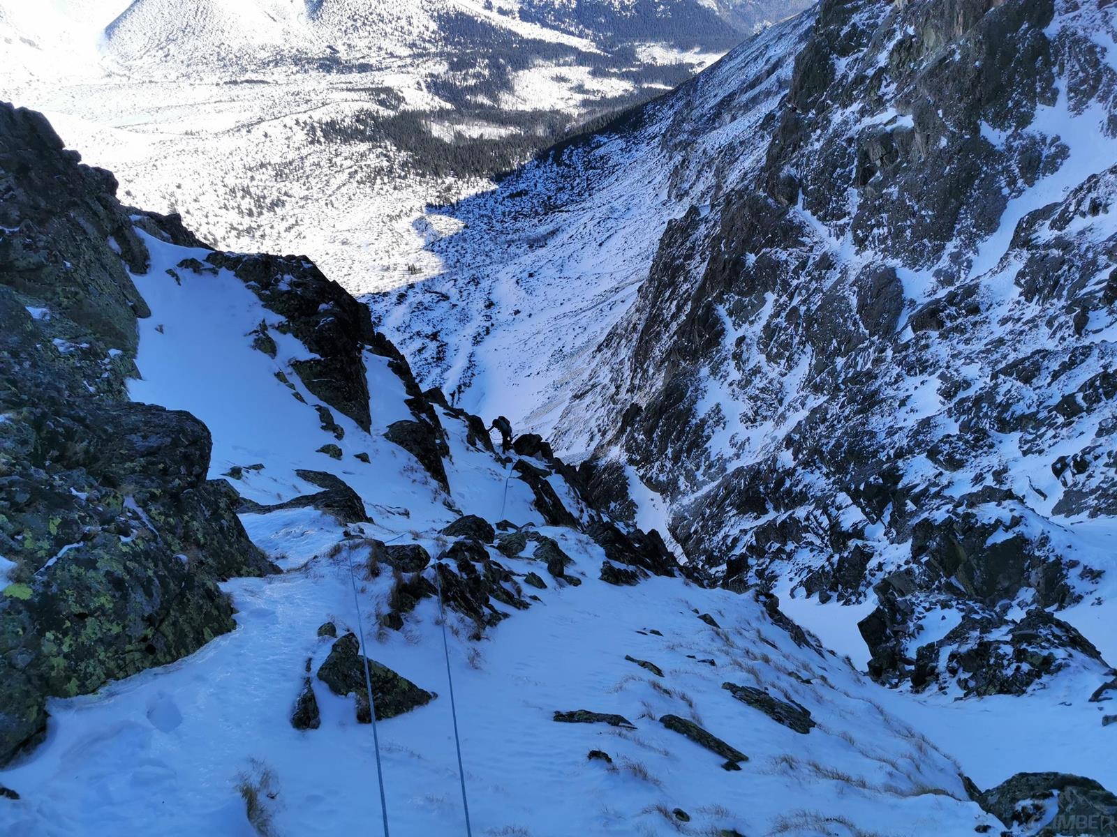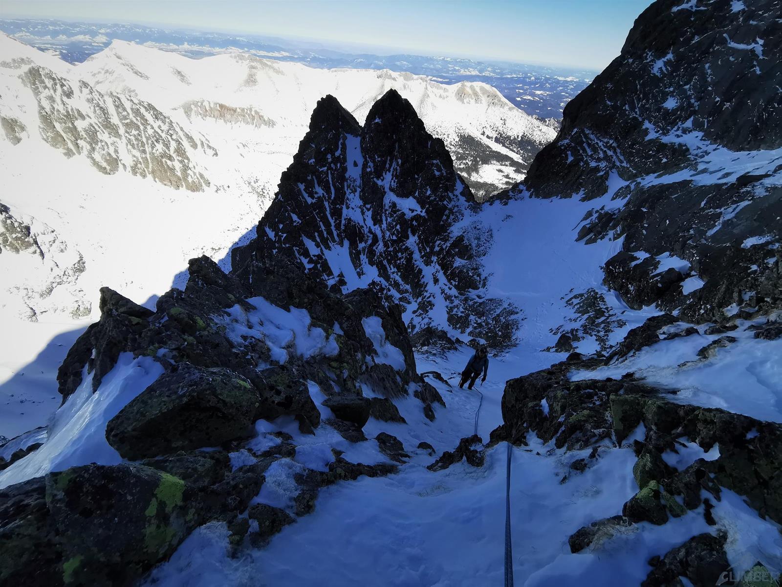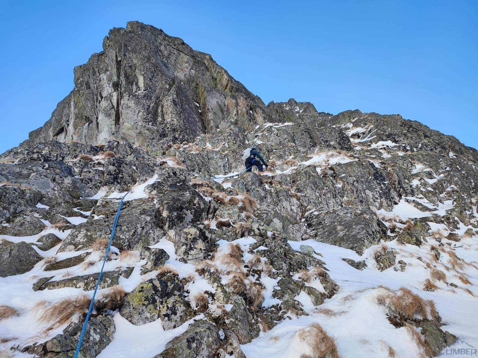 Tutaj trzeba podjąć decyzję czy idziemy dalej czy schodzimy (w lewo) Niemiecką Drabiną do Doliny Kieżmarskiej. Wydaje się, że jesteśmy już wysoko ale do szczytu pozostaje jeszcze 300 metrów przewyższenia, co przekłada się na 400-500 metrów terenu o charakterze graniowym, do tego dodać trzeba żmudne zejście przez Dolinę Huńcowską. W naszym przypadku zarówno pogoda jak i czas sprzyjają, po krótkiej przerwie ruszamy wiec do góry. Ponownie wybieramy zimowy wariant opisany również na Drytoolingu – oryginalnie Grosz wspinał się w 1912 do góry żebrem nad Złotą Przełączką, my tymczasem wybieramy to z prawej, nad Miedzianym Przechodem – jak dwadzieścia lat później poszli Szczepański i Perlberżanka (ponownie odsyłam do topo).