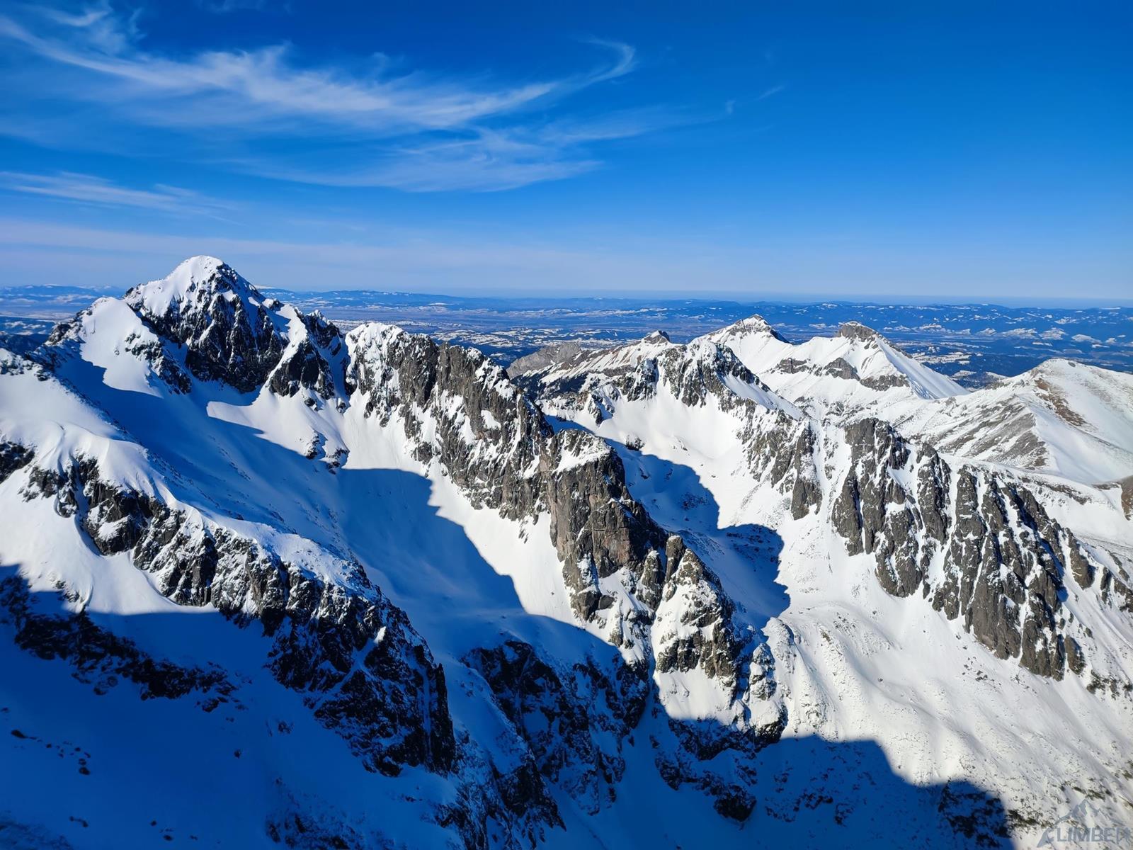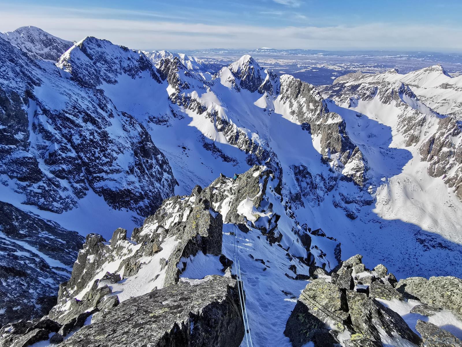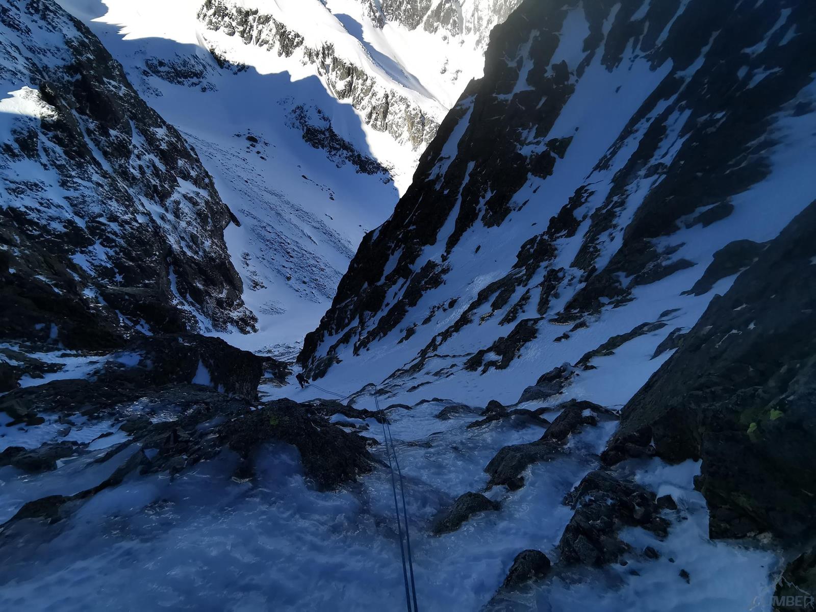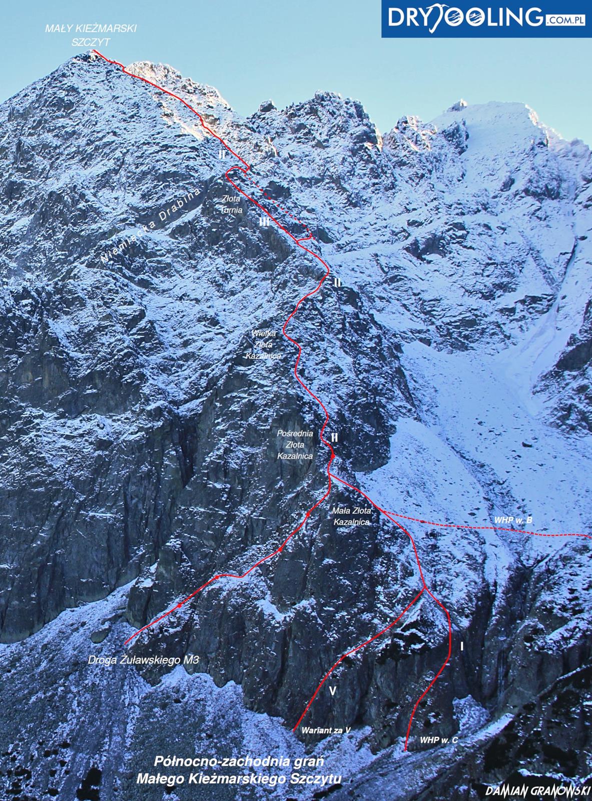 Tutaj trzeba podjąć decyzję czy idziemy dalej czy schodzimy (w lewo) Niemiecką Drabiną do Doliny Kieżmarskiej. Wydaje się, że jesteśmy już wysoko ale do szczytu pozostaje jeszcze 300 metrów przewyższenia, co przekłada się na 400-500 metrów terenu o charakterze graniowym, do tego dodać trzeba żmudne zejście przez Dolinę Huńcowską. W naszym przypadku zarówno pogoda jak i czas sprzyjają, po krótkiej przerwie ruszamy wiec do góry. Ponownie wybieramy zimowy wariant opisany również na Drytoolingu – oryginalnie Grosz wspinał się w 1912 do góry żebrem nad Złotą Przełączką, my tymczasem wybieramy to z prawej, nad Miedzianym Przechodem – jak dwadzieścia lat później poszli Szczepański i Perlberżanka (ponownie odsyłam do topo).