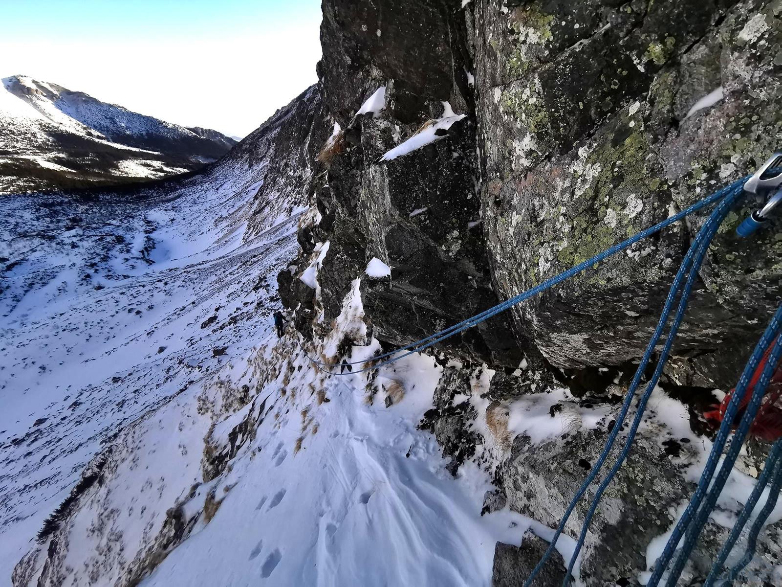 Droga Żuławskiego prowadzi ewidentnym trawiastym zachodem, do którego dostajemy się z zatoczki na prawo od podstawy filara Pośredniej Złotej Kazalnicy. Pokonujemy pierwszy próg i kierujemy się w stronę skał, pod którymi trawersujemy w prawo – po drodze mijamy dwa stanowiska z haków, z których można skorzystać jeżeli chcemy ściągać drugiego na sztywno. Następnie czeka nas ok. 100 metrów łatwego, śnieżnego terenu – docieramy nim pod ostatnie spiętrzenie. Trudności są w dolnej części progu (ok. M3, max M4 przy gorszych warunkach), wyżej pojawiają się już dobre trawy, które wyprowadzają w łatwy teren nad Małą Złotą Kazalnicą. W dobrych warunkach jakie mieliśmy i płynnie przechodząc z asekuracji sztywnej na lotną Żuławski zajął nam około godzinę. Po wyjściu na siodełko Ania pomimo wcześniejszego kryzysu potwierdza, że chce kontynuować urodzinową przygodę – ruszamy więc na Filar MKS 😊.