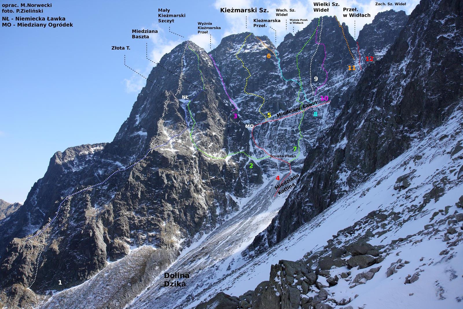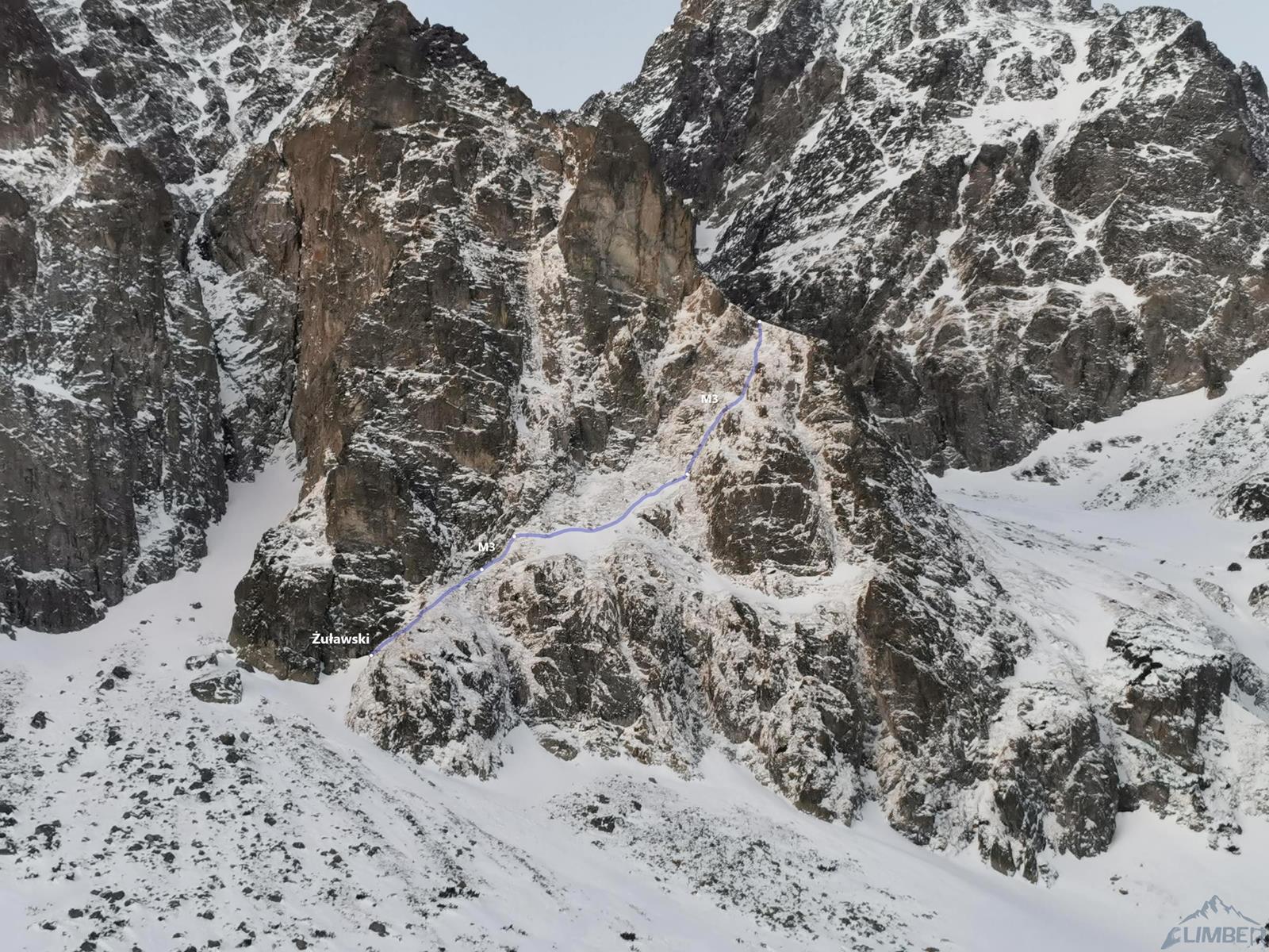 Oryginalna letnia droga wiedzie dalej ściśle granią, zimą większość przejść odbywa się jednak wariantem zimowym, omijającym skalne spiętrzenie Złotej Turni po prawej stronie – wrysowana niebieska linia na foto-topo z Taternika. Idziemy skośnie w górę pod skały i w dogodnym miejscu przewijamy się do stromego żlebu po prawej – tutaj czeka nas ok. 150 metrów wspinania w śniegu i firnie, z zalodzonymi płytami pod koniec. Wypłaszczenie, na które wychodzimy (ring na skałach wprost) to tzw. Niemiecka Ławka – po lewej widzimy siodełko (Złota Przełączka) pod Złotą Turnią, po prawej – pod Miedzianą Basztą (Miedziany Przechód).