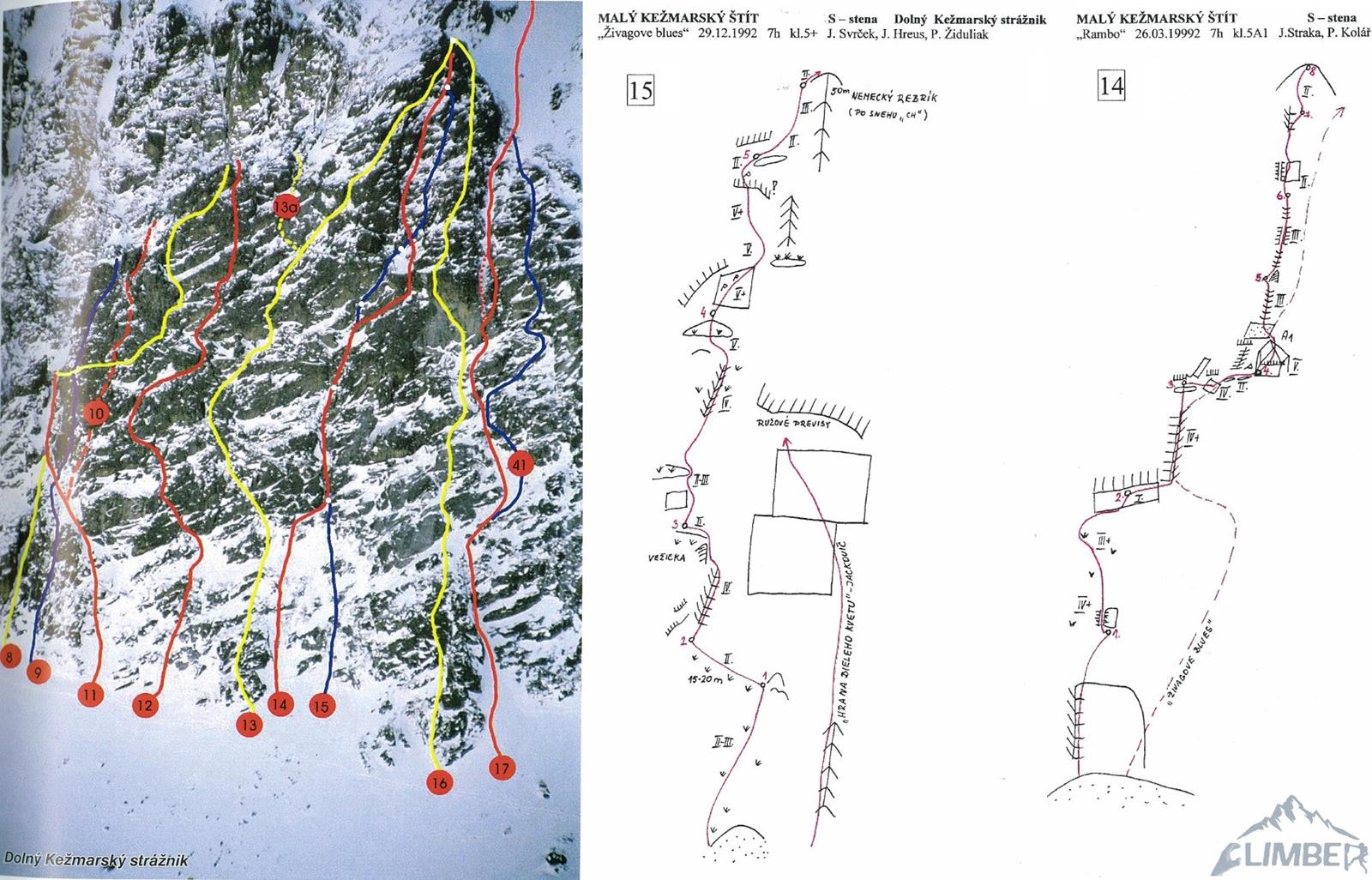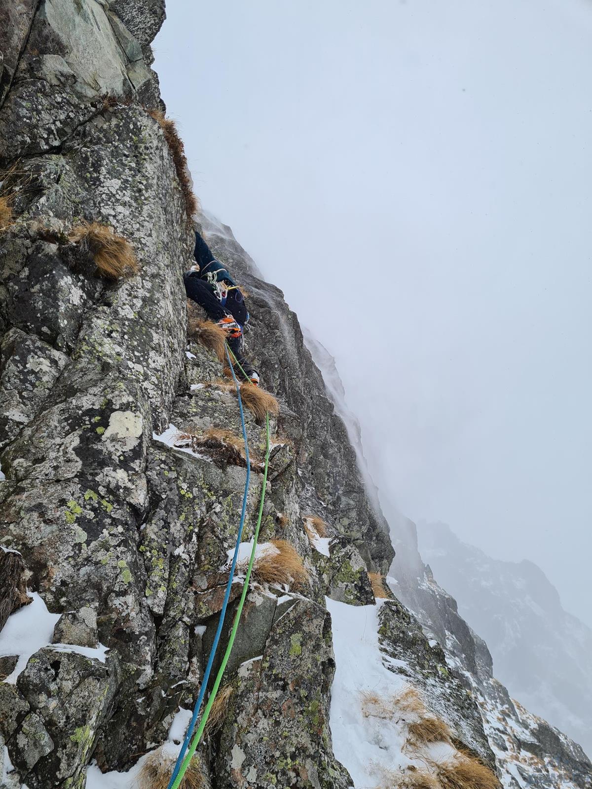Drugiego dnia obozu pogoda znacznie się pogarsza – mrozi, wieje i sypie. Pocieszam się, że przynajmniej nie trzeba iść na nic długiego – kilkanaście godzin po powrocie z długiej alpiniady (Filara MKW) szybka i krótka droga będzie w sam raz 😉. Na szczęście w Kieżmarskiej propozycji na taką okazję nie brakuje – tym razem decydujemy się na Skrajnego Strażnika i jedną z dwóch dróg częściowo się pokrywających – Rambo lub Živagove blues. Pod ścianą stawiamy się w trójkowym zespołu już po 20 minutach od wyjścia ze schroniska i zgodnie stwierdzamy, że druga linia prezentuje się ciekawiej.