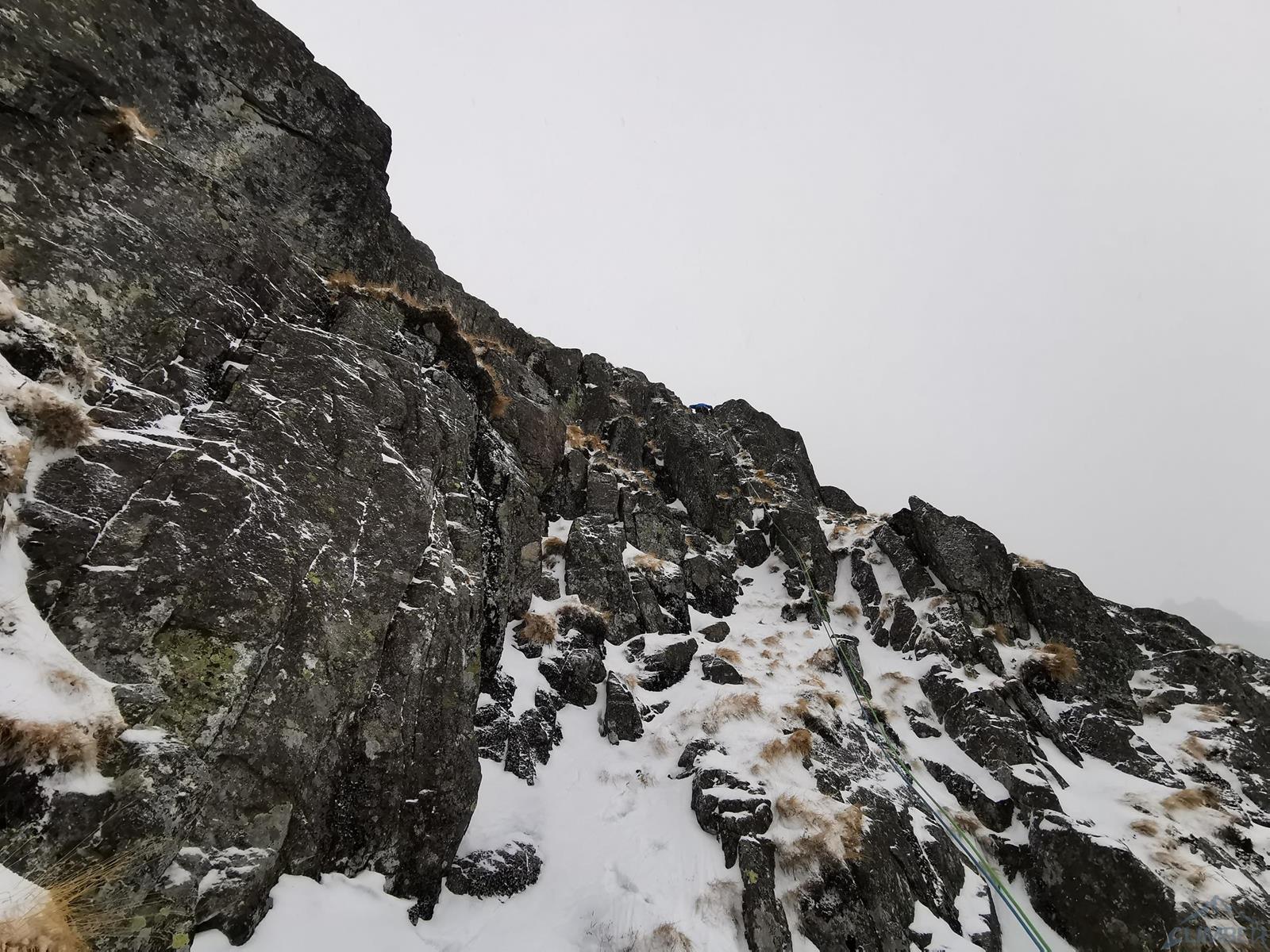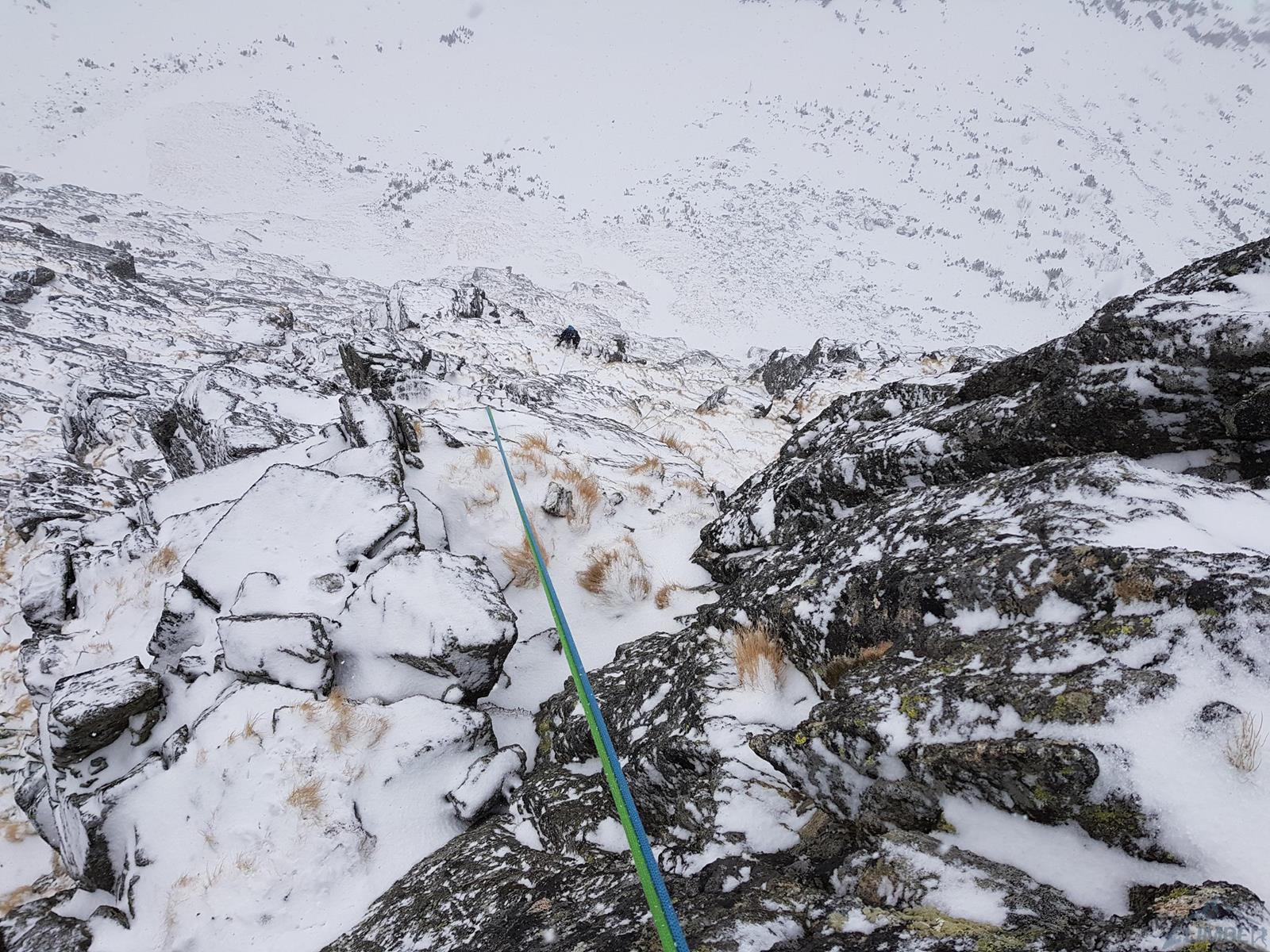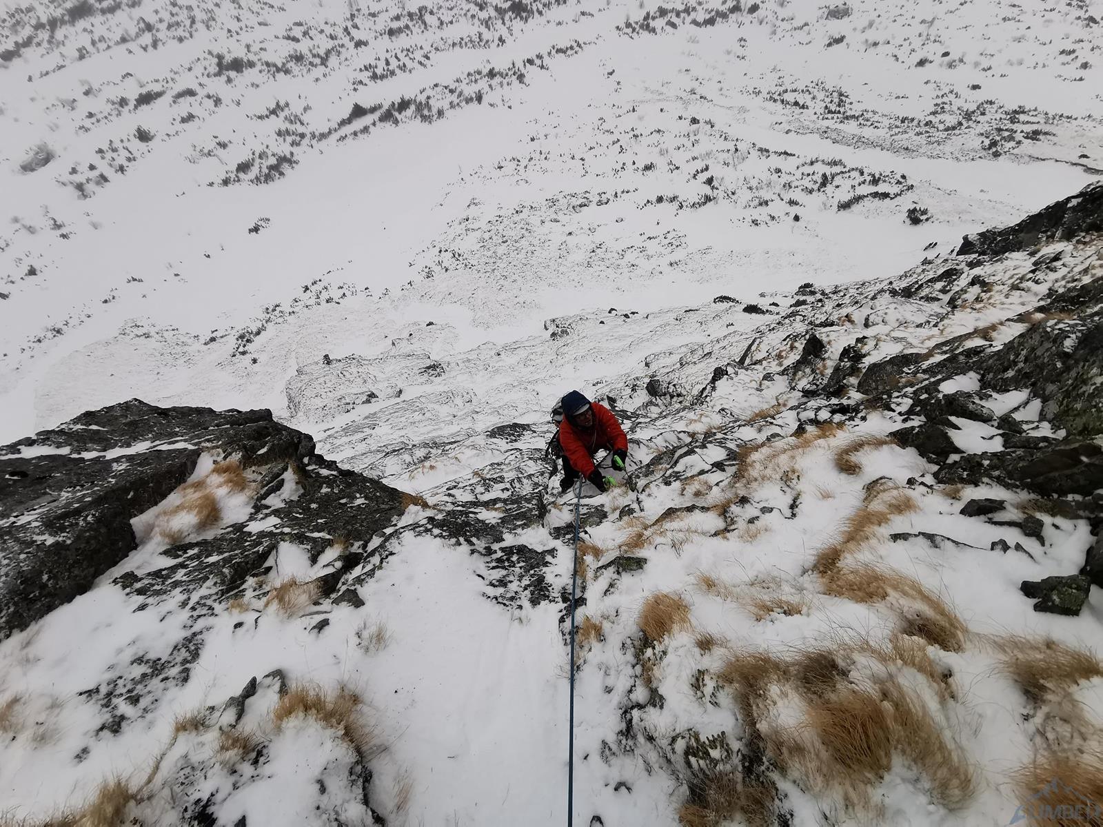 Pierwszą część drogi prowadzi Mateusz – zaczyna wprost do góry trawiasto-skalnym terenem (M3) i po wyjściu w łatwy teren kieruje się skośnie w lewo na półkę pod wyraźnym zacięciem (haki i pętle). Dwa pierwsze wyciągi można łatwo połączyć – trzeba wtedy podejść kawałek na lotnej. Kolejny odcinek jest już bardziej wspinaczkowy (M4) i bardzo fajny – wchodzimy do skalnego zacięcia i po jego przejściu przechodzimy w lewo, po czym przez kominek do góry na półkę z kolejnym stanem (hak). Kolejny wyciąg przypada w prowadzeniu mnie – zaczynamy trawiastą załupą (M4), która wyżej nabiera skalnego charakteru z krótkim trudniejszym odcinkiem na wyjściu (M5). Trawersujemy łatwo do stanowiska pod połogą płytą (hak).