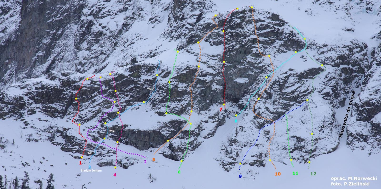 Wspinanie rozpoczynamy od pokonania progu skalnego wyraźnym przewężeniem ograniczającym go z prawej strony. Choć ścianka ma zaledwie 2-3 metry, jest przewieszona i przy luźnym śniegu na wyjściu mimo niskich trudności (ok. M4) może być dość czujnie, a z powodu nisko zakładanej asekuracji ewentualny lot skończy się powrotem na start drogi 😊. Po przewinięciu w łatwy teren podchodzimy kilkanaście metrów pod kolejne trudności, gdzie znajdziemy spita. Drugi wyciąg to bardzo ładne czysto-skalne zacięcie, idąc na samych dziabach ma ok. M5/M5+, komfortową asekurację zapewniają stałe haki. Stanowisko założyć możemy na skałach wprost lub idąc dalej w prawo.