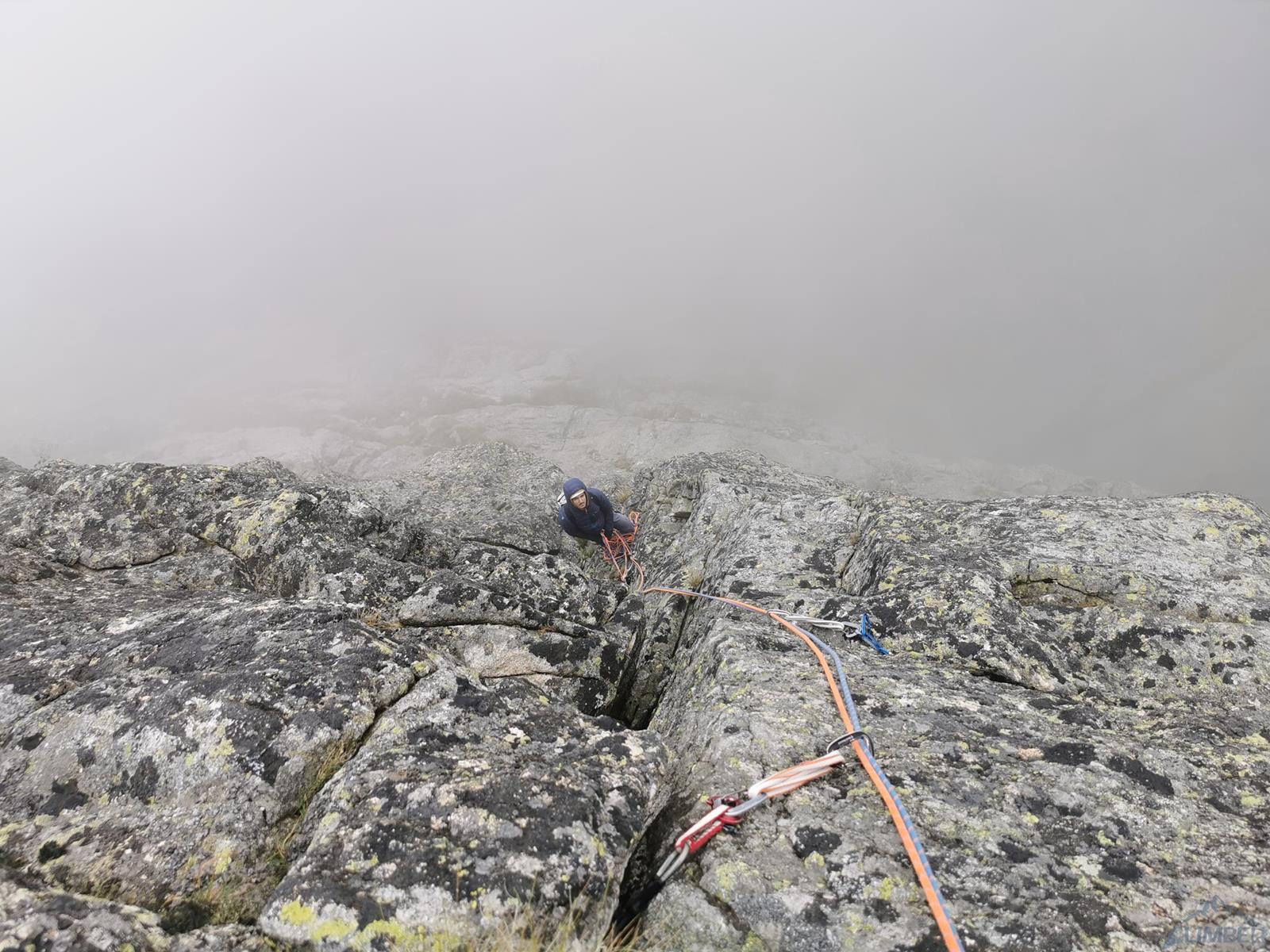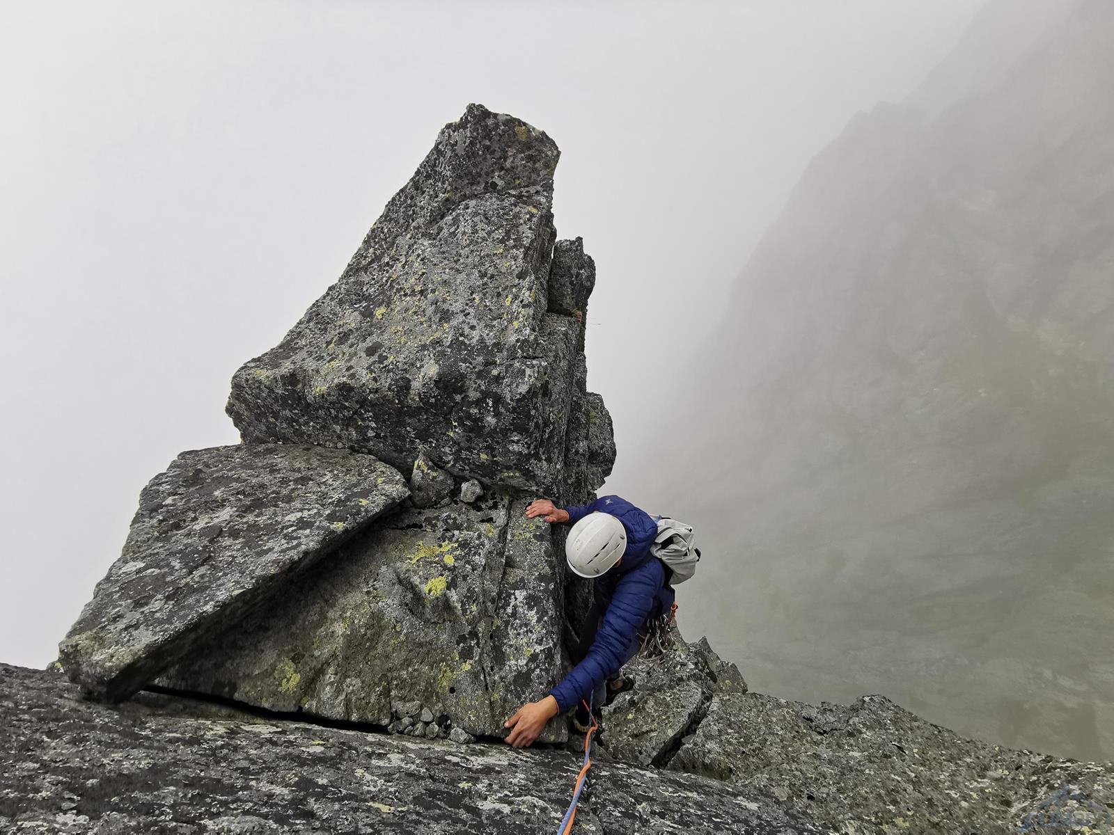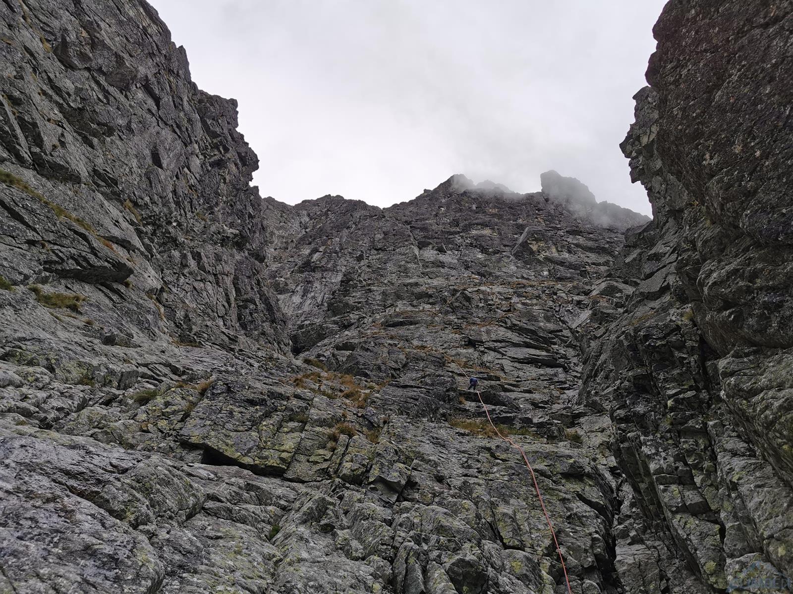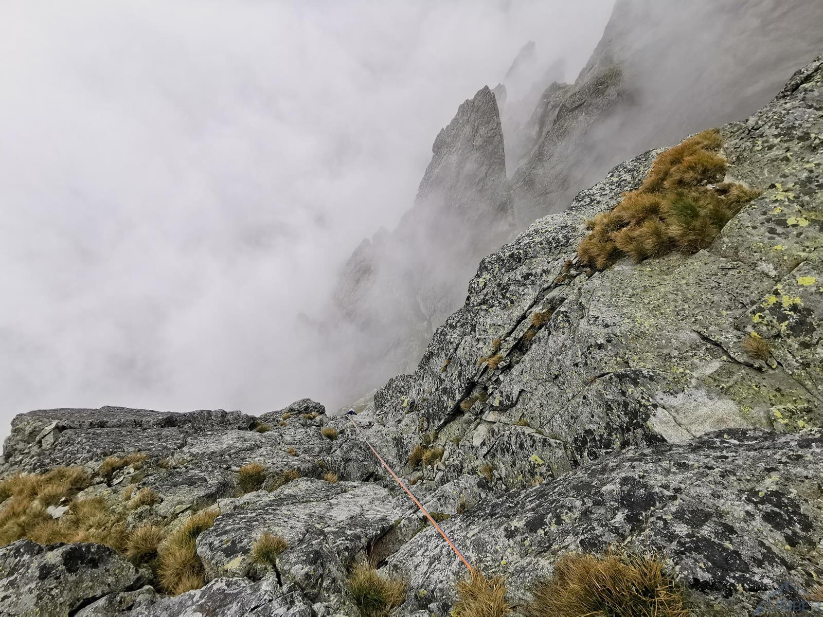 Gdy docieramy pod ścianę niebo jest jeszcze niebieskie, już godzinę później napływają jednak gęste chmury, które towarzyszą nam przez resztę dnia. Od początku obawiamy się czy i kiedy zacznie padać, na szczęście kończy się na zimnie i wilgotnej skale oraz momentami na kilkumetrowej widoczności – wspinanie jest przez to mniej przyjemne, ale drogę udaje się zrobić. Rozlúčka startuje płytami kilka metrów na prawo od charakterystycznej, wyprowadzającej do Kotła depresji, którą swoją drogę zaczynają Ania z Mateuszem. Namierzamy pierwszego spita i kierujemy się w stronę zacięcia (V+), którym wychodzimy do stanowiska pod przewieszeniami (ok. 35m). Ku naszemu zdziwieniu na skale jest sporo śladów magnezji – jak się potem okaże kilka dni przed nami rzadko powtarzaną drogę przeszli Adam z Damianem 😊. Na początku drugiego wyciągu czeka nas dobrze obity ale wymagający (mocne VII+) okap – nie trafiając do odpowiedniego chwytu łatwo spalić OS-a, co też przytrafia się prowadzącemu ten fragment Dawidowi. Po powrocie do stanowiska i przewiązaniu druga próba jest już jednak skuteczna, po wyjściu z trudności czeka już łatwiejsza płyta, idziemy jej środkiem wzdłuż pęknięć i po ok. 40 metrach dochodzimy do stanu.