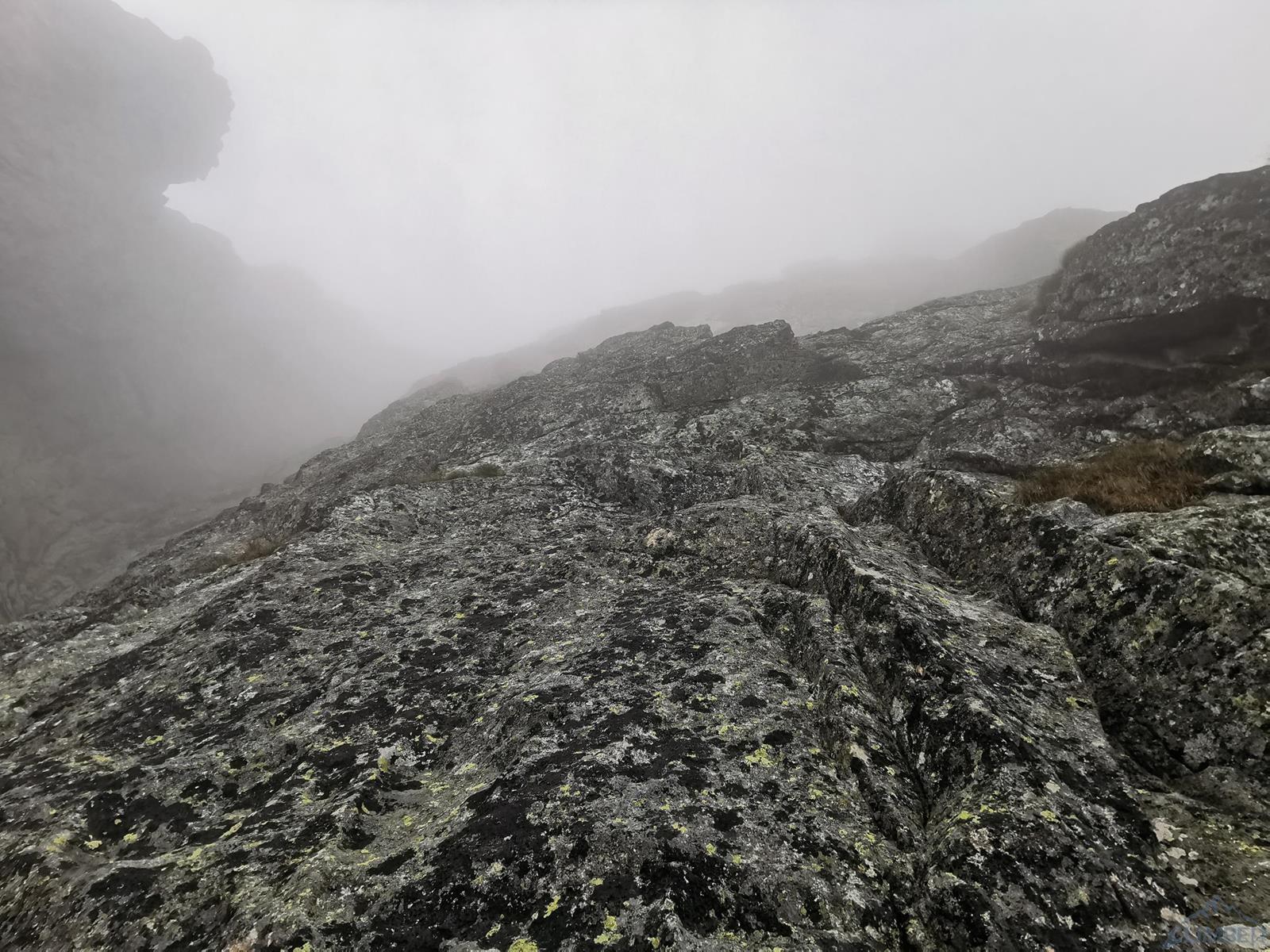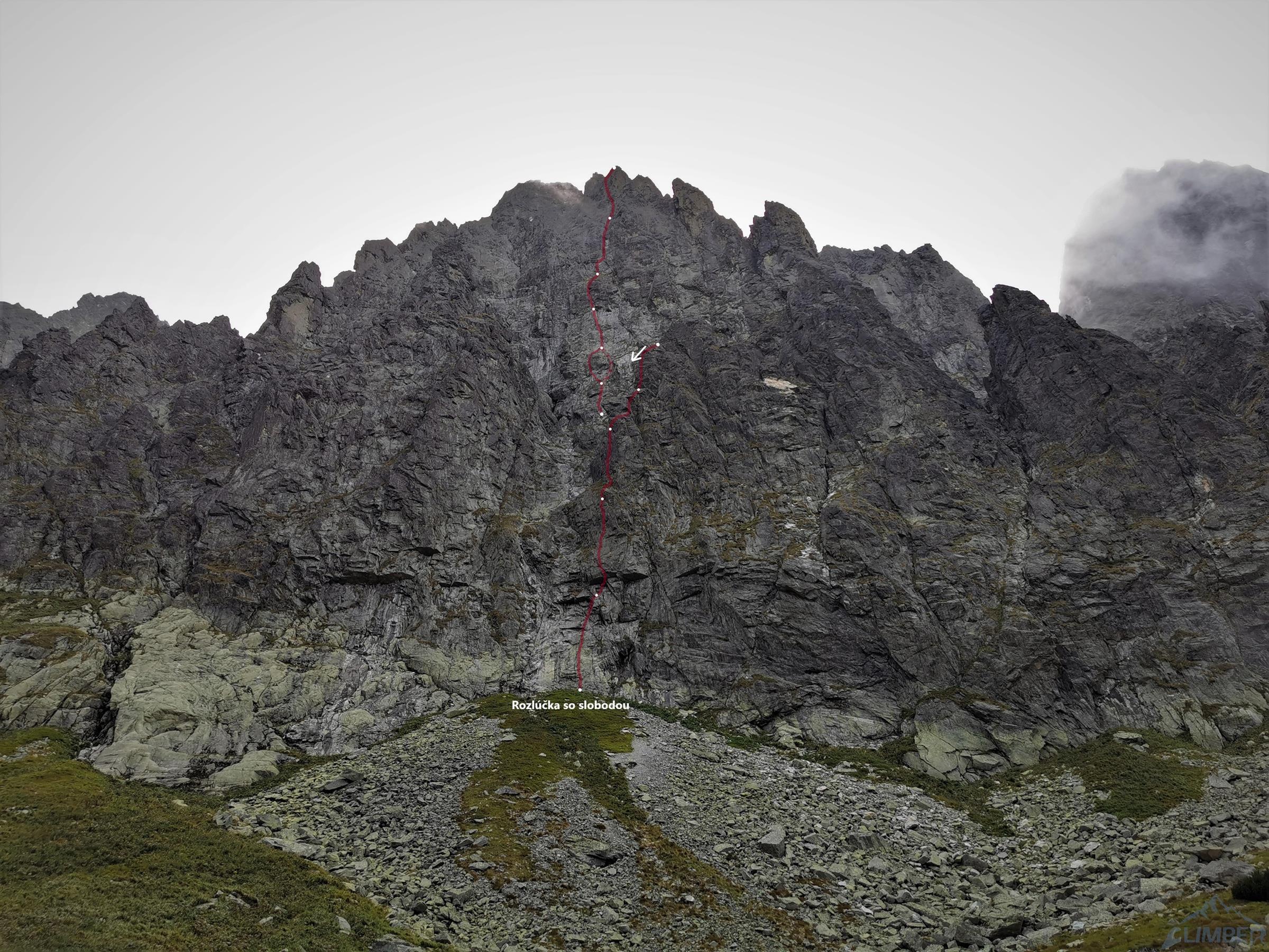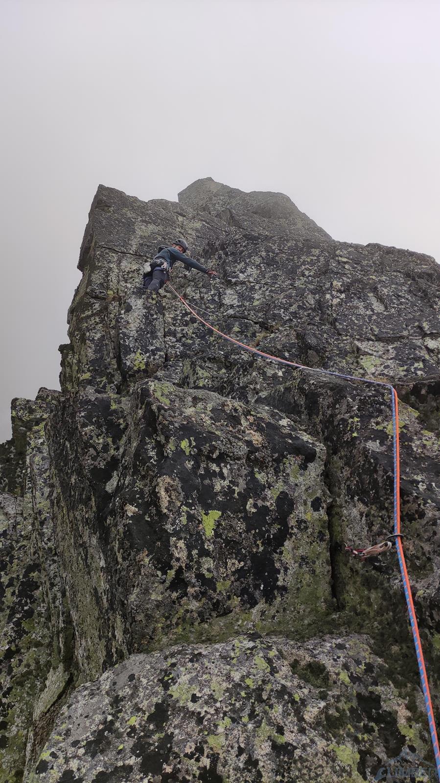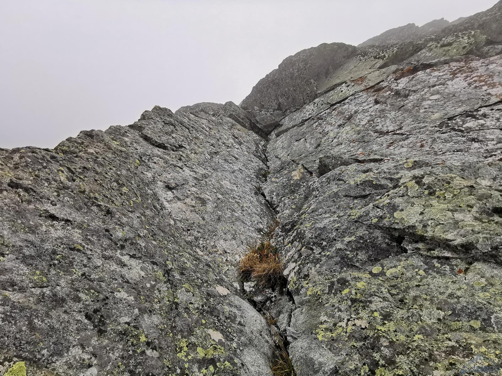 Gdy docieramy pod ścianę niebo jest jeszcze niebieskie, już godzinę później napływają jednak gęste chmury, które towarzyszą nam przez resztę dnia. Od początku obawiamy się czy i kiedy zacznie padać, na szczęście kończy się na zimnie i wilgotnej skale oraz momentami na kilkumetrowej widoczności – wspinanie jest przez to mniej przyjemne, ale drogę udaje się zrobić. Rozlúčka startuje płytami kilka metrów na prawo od charakterystycznej, wyprowadzającej do Kotła depresji, którą swoją drogę zaczynają Ania z Mateuszem. Namierzamy pierwszego spita i kierujemy się w stronę zacięcia (V+), którym wychodzimy do stanowiska pod przewieszeniami (ok. 35m). Ku naszemu zdziwieniu na skale jest sporo śladów magnezji – jak się potem okaże kilka dni przed nami rzadko powtarzaną drogę przeszli Adam z Damianem 😊. Na początku drugiego wyciągu czeka nas dobrze obity ale wymagający (mocne VII+) okap – nie trafiając do odpowiedniego chwytu łatwo spalić OS-a, co też przytrafia się prowadzącemu ten fragment Dawidowi. Po powrocie do stanowiska i przewiązaniu druga próba jest już jednak skuteczna, po wyjściu z trudności czeka już łatwiejsza płyta, idziemy jej środkiem wzdłuż pęknięć i po ok. 40 metrach dochodzimy do stanu.