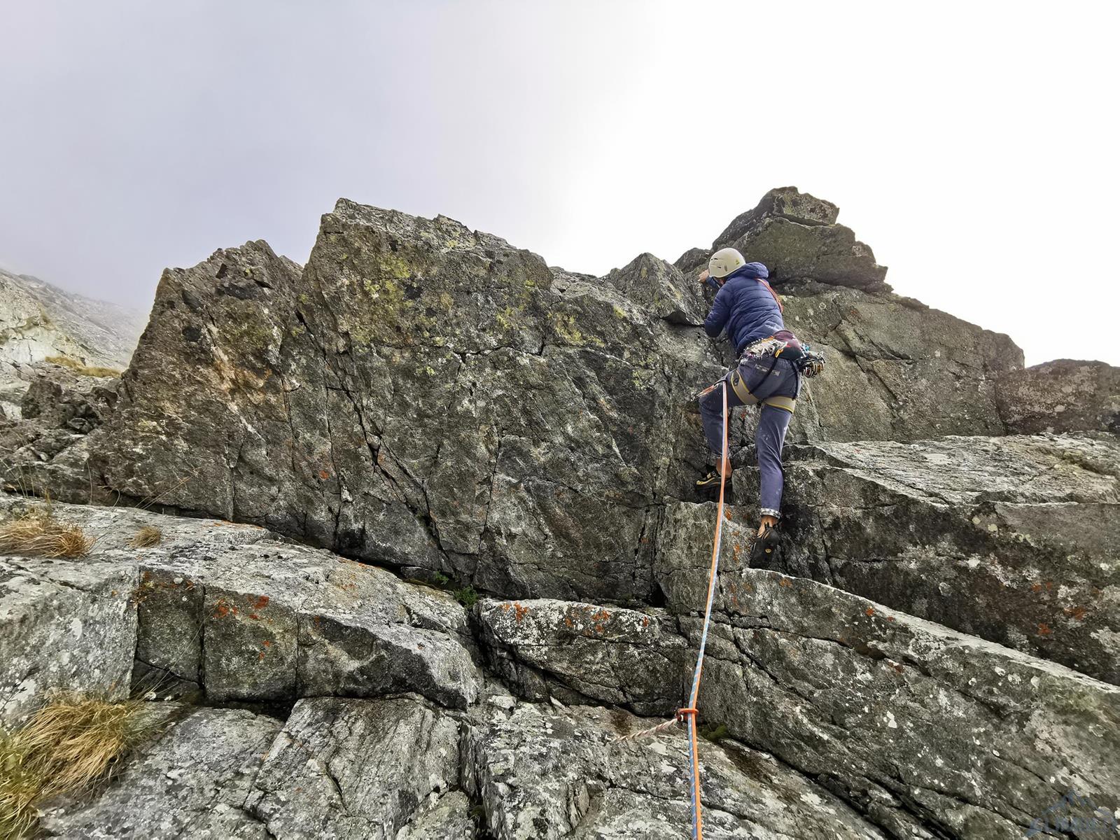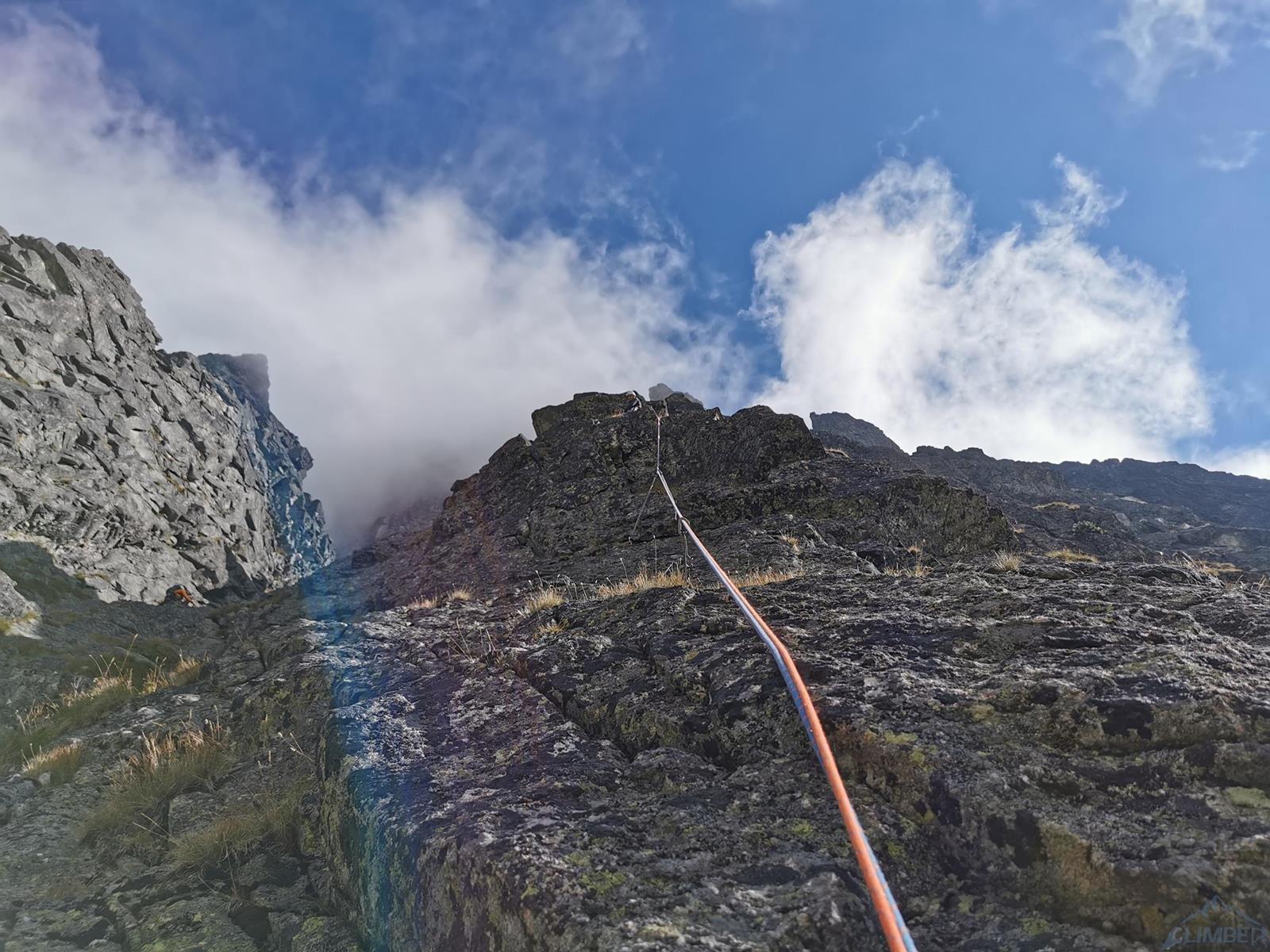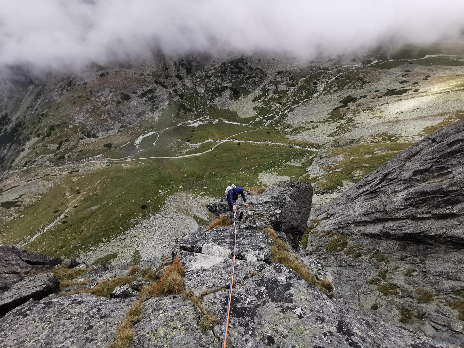 Trzy kolejne wyciągi to łatwiejsze wspinanie na własnej asekuracji w depresjach prowadzących filarem – przejmuję prowadzenie i staram się w tym terenie trochę podgonić. Po wyjściu na trawiastą półkę wchodzimy do zacięcia po prawej i nad wyraźną turnicą skręcamy w lewo do rynny doprowadzającej pod ostrze filara (V, 45m). Kolejny odcinek to łatwe (IV) wspinanie po grani, stanowisko jest na półce po ok. 40 metrach. Piąty wyciąg (V+, 35m) startuje ciekawą szeroką rysą wprost (można też łatwo obejść po lewej), dalej idziemy wzdłuż rysy w lewo i po przejściu za kant filara skręcamy do zacięcia w prawo by ponownie wrócić na grań – tuż pod nią czeka stanowisko. Co ciekawe o ile wszystkie pozostałe stany zbudowane są z dwóch stałych punktów, tutaj znajdziemy spita połączonego z repikiem zaczepionym o skałę – dziwi to tym bardziej, że z tego miejsca czeka nas ok. 40-metrowy zjazd. Druga część drogi prowadzi bowiem ścianą czołową która wypiętrza się z Kotła na lewo od filara, na którym jesteśmy (dalej do góry idzie nim czwórkowa droga Tatarki, całkiem zresztą fajna).