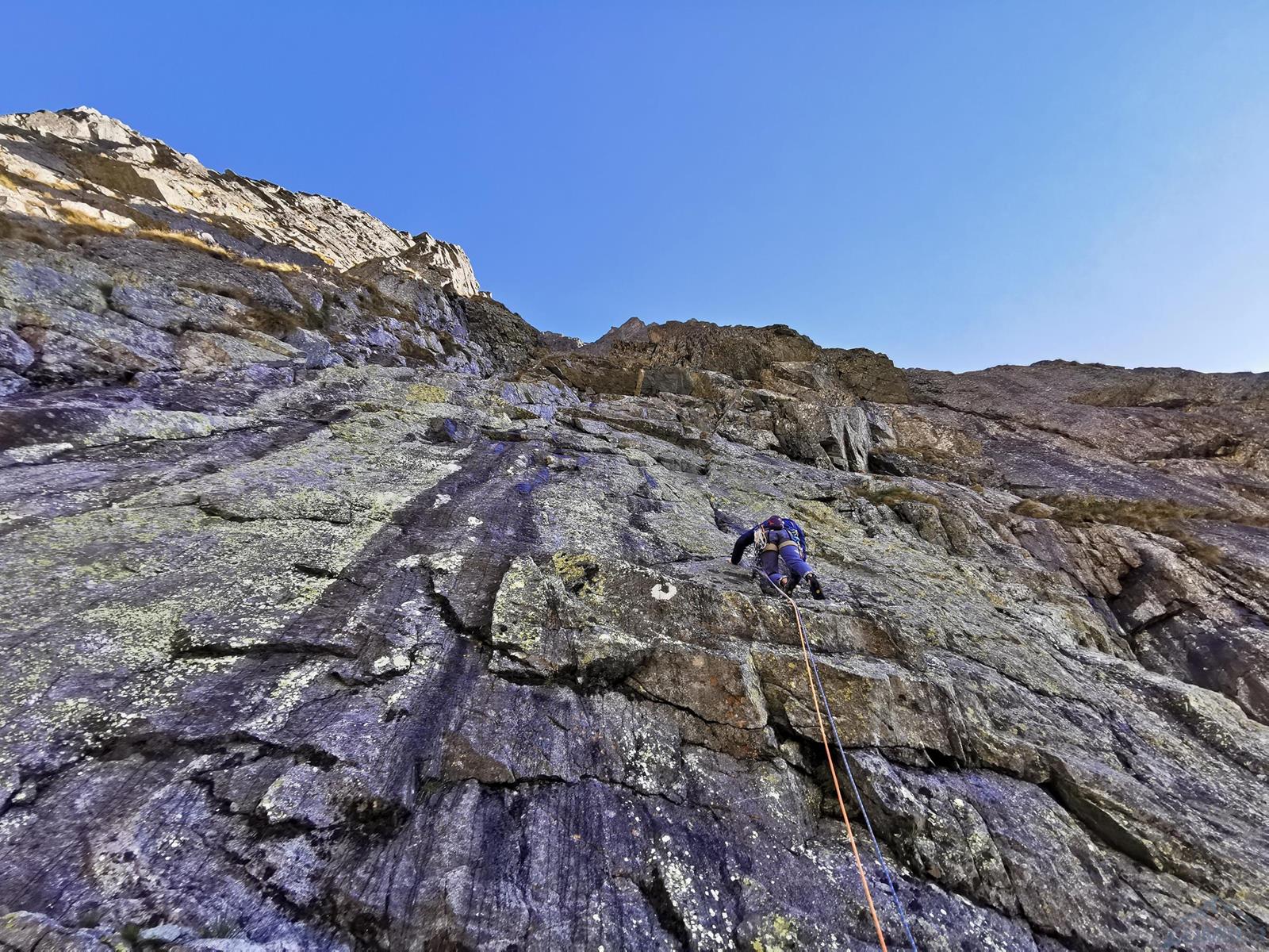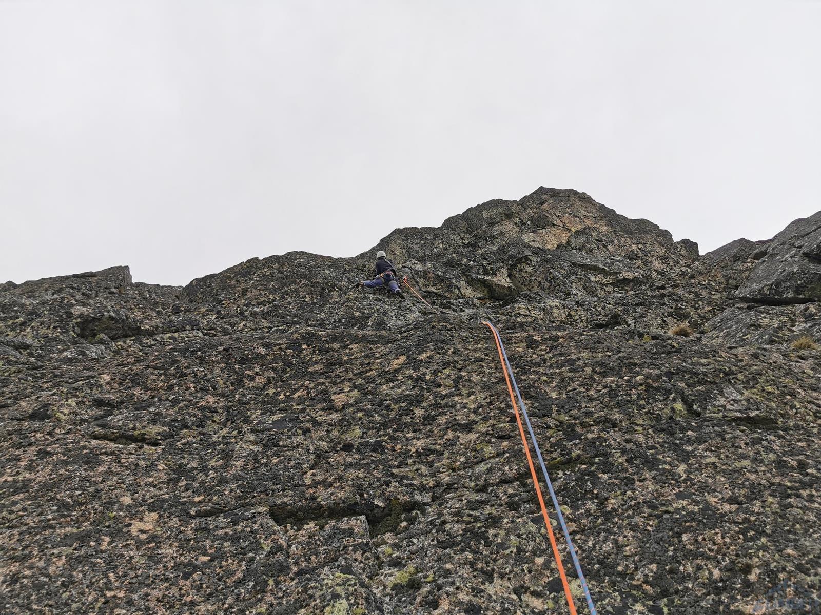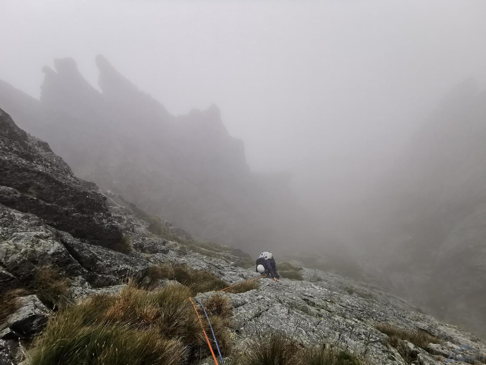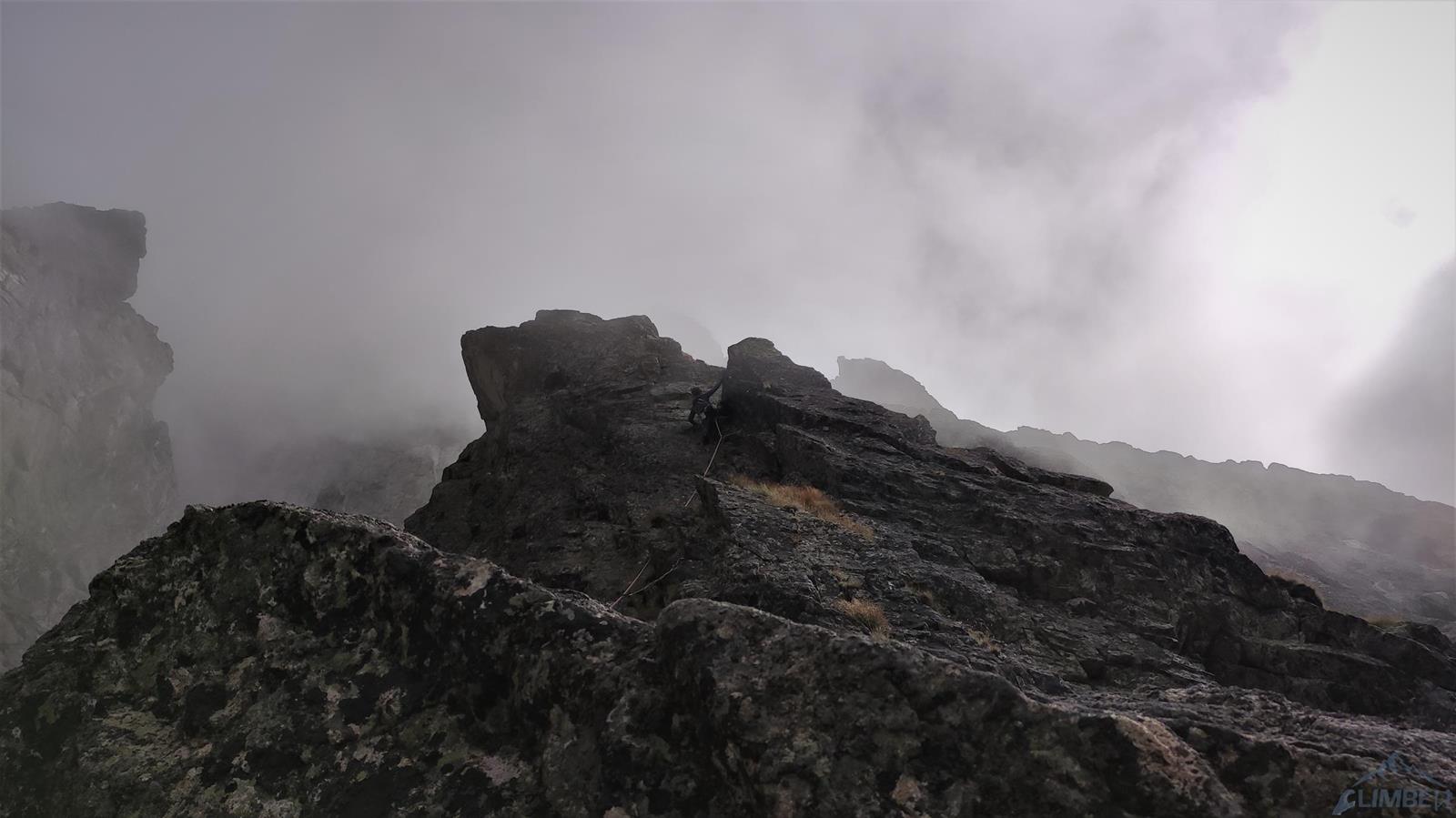Trzy kolejne wyciągi to łatwiejsze wspinanie na własnej asekuracji w depresjach prowadzących filarem – przejmuję prowadzenie i staram się w tym terenie trochę podgonić. Po wyjściu na trawiastą półkę wchodzimy do zacięcia po prawej i nad wyraźną turnicą skręcamy w lewo do rynny doprowadzającej pod ostrze filara (V, 45m). Kolejny odcinek to łatwe (IV) wspinanie po grani, stanowisko jest na półce po ok. 40 metrach. Piąty wyciąg (V+, 35m) startuje ciekawą szeroką rysą wprost (można też łatwo obejść po lewej), dalej idziemy wzdłuż rysy w lewo i po przejściu za kant filara skręcamy do zacięcia w prawo by ponownie wrócić na grań – tuż pod nią czeka stanowisko. Co ciekawe o ile wszystkie pozostałe stany zbudowane są z dwóch stałych punktów, tutaj znajdziemy spita połączonego z repikiem zaczepionym o skałę – dziwi to tym bardziej, że z tego miejsca czeka nas ok. 40-metrowy zjazd. Druga część drogi prowadzi bowiem ścianą czołową która wypiętrza się z Kotła na lewo od filara, na którym jesteśmy (dalej do góry idzie nim czwórkowa droga Tatarki, całkiem zresztą fajna).