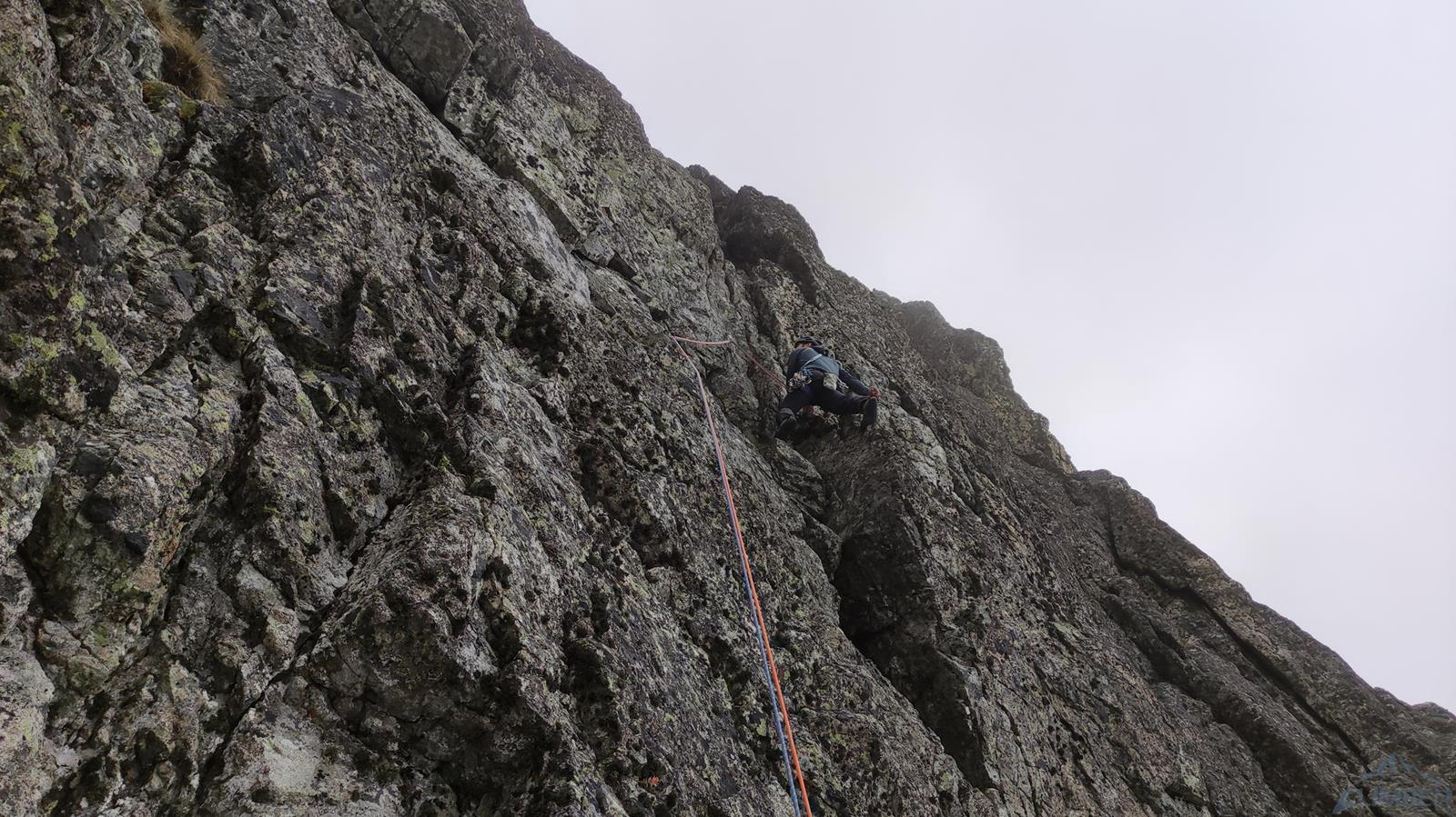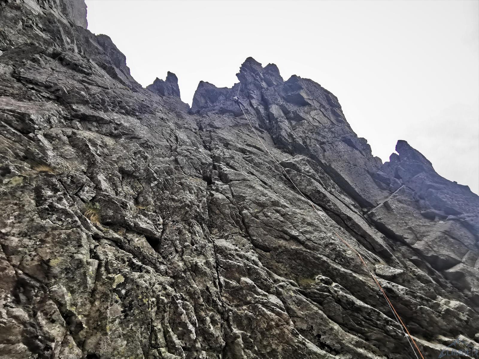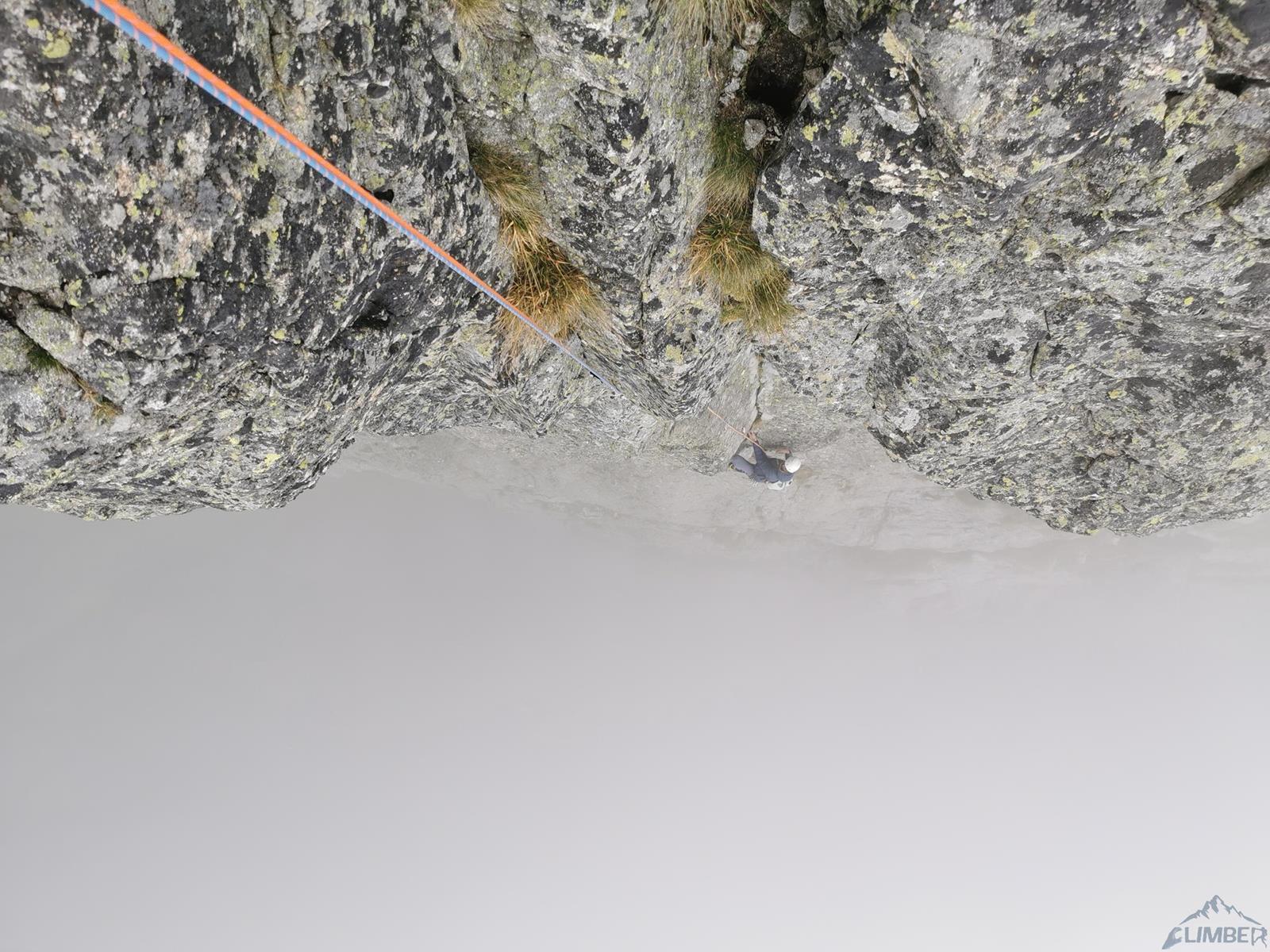 Po zjeździe w kierunku Kotła lądujemy na jednej z półek i po ponownym związaniu się, łatwym terenem (III) wspinamy się płytami do góry i w lewo – po 20-40 metrach (w zależności od tego jak nisko zjechaliśmy) docieramy do stanowiska na trawiastej półce. Stąd ruszamy płytą (IV+) skośnie w lewo i przy spicie odbijamy w prawo i do góry – kolejny stan jest po ok. 30 metrach. Wyciąg ósmy (VI-, 30m) prowadzi fajną płytą z wymyciami po lewej stronie (widać haka w rysie), my sugerując się błędnie wrysowaną linią na zdjęciu z tatrynfo poszliśmy kominem wprost – oba warianty schodzą się jednak na półce nad przewieszką. Kolejny odcinek (VII, 35m) jest bardzo ładny – idziemy najpierw płytą, potem wzdłuż rysy i dochodzimy do przewieszającego się zacięcia, z którego przewijamy się pod okapem w lewo. Wspinanie jest mocno techniczne, dodatkowo z powodu wilgotnej skały jest dość czujnie i na prowadzeniu schodzi mi sporo czasu, na szczęście asekuracja jest dobra (3 ringi + małe i średnie friendy).