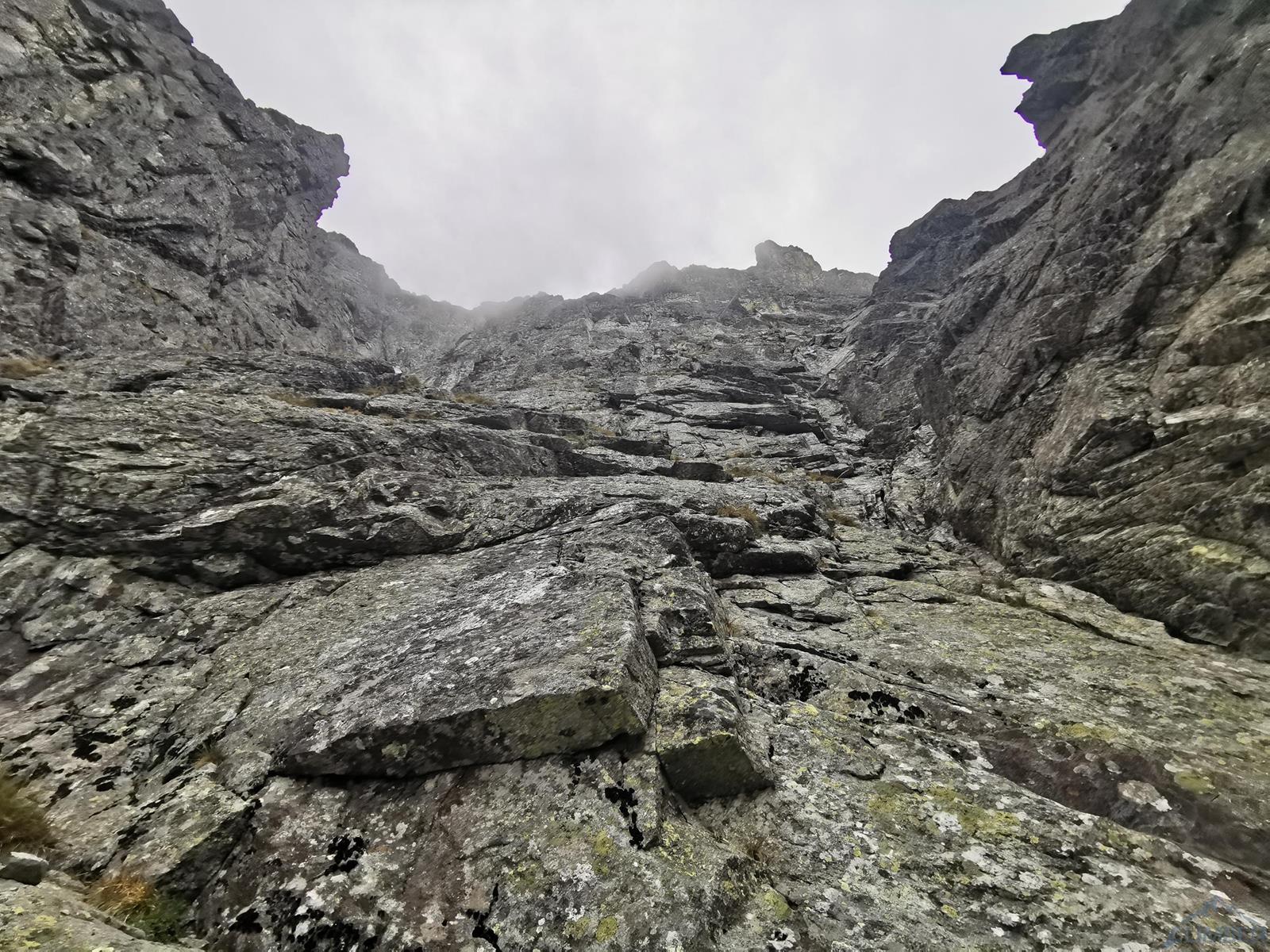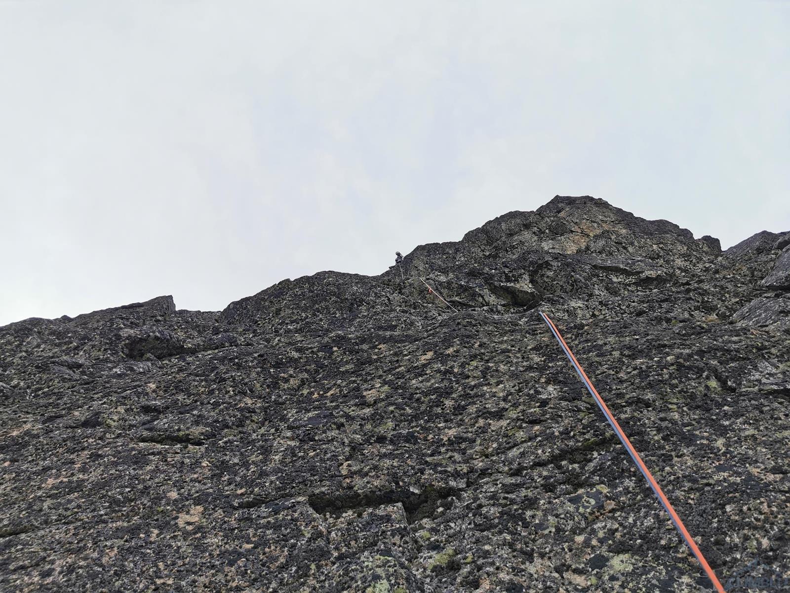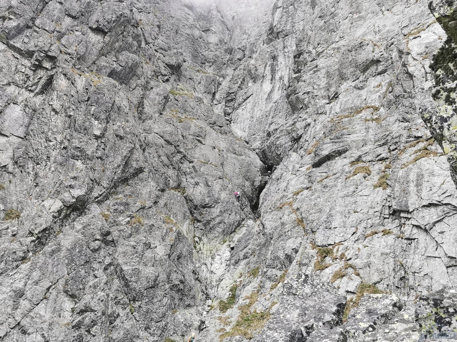 Po zjeździe w kierunku Kotła lądujemy na jednej z półek i po ponownym związaniu się, łatwym terenem (III) wspinamy się płytami do góry i w lewo – po 20-40 metrach (w zależności od tego jak nisko zjechaliśmy) docieramy do stanowiska na trawiastej półce. Stąd ruszamy płytą (IV+) skośnie w lewo i przy spicie odbijamy w prawo i do góry – kolejny stan jest po ok. 30 metrach. Wyciąg ósmy (VI-, 30m) prowadzi fajną płytą z wymyciami po lewej stronie (widać haka w rysie), my sugerując się błędnie wrysowaną linią na zdjęciu z tatrynfo poszliśmy kominem wprost – oba warianty schodzą się jednak na półce nad przewieszką. Kolejny odcinek (VII, 35m) jest bardzo ładny – idziemy najpierw płytą, potem wzdłuż rysy i dochodzimy do przewieszającego się zacięcia, z którego przewijamy się pod okapem w lewo. Wspinanie jest mocno techniczne, dodatkowo z powodu wilgotnej skały jest dość czujnie i na prowadzeniu schodzi mi sporo czasu, na szczęście asekuracja jest dobra (3 ringi + małe i średnie friendy).