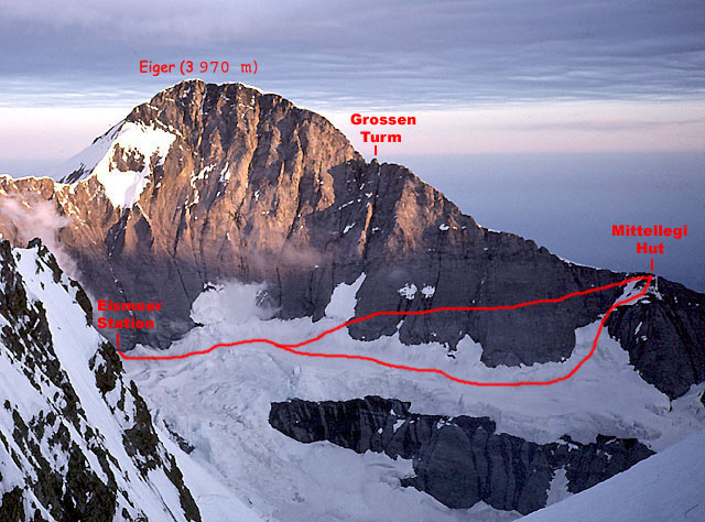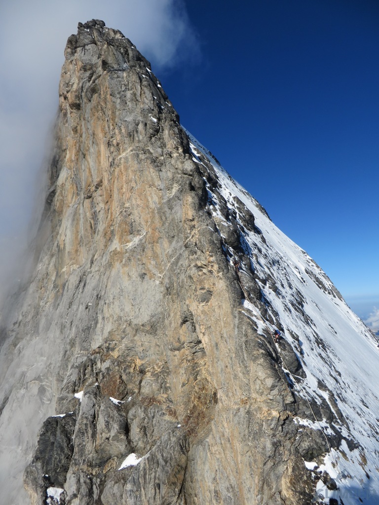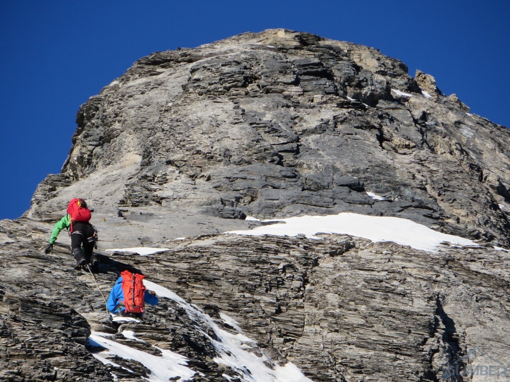 Związany jestem z Ryśkiem i cały czas idziemy tylko na lotnej, zmieniając się na prowadzeniu. Arek z Adamem asekurują się na bardziej wymagających ściankach. Jak tylko wychodzi Słońce od razu jest lepiej, rozgrzewamy się i wpadamy w trans wspinania – jest pięknie, droga jest oczywista, ekspozycja niesamowita, trudności niezbyt wygórowane (pionowe odcinki trójkowo-czwórkowe przeplatane zero-jedynkowymi odcinkami prostymi). Krótko mówiąc – piękna alpejska grań! Po pewnym czasie mieszamy w naszych zespołach, ja „biorę” zmęczonego najbardziej wysokością Arka, Rysiek Adama i prujemy dalej do góry, czasami czekając tylko aż Francuzi zwolnią drogę (Niemców udało się wyprzedzić). Na koniec jeszcze tylko dość psychiczny trawers po zmrożonych śniegach tuż nad ścianą północną i słynny Eiger (3970 m.) jest nasz!
