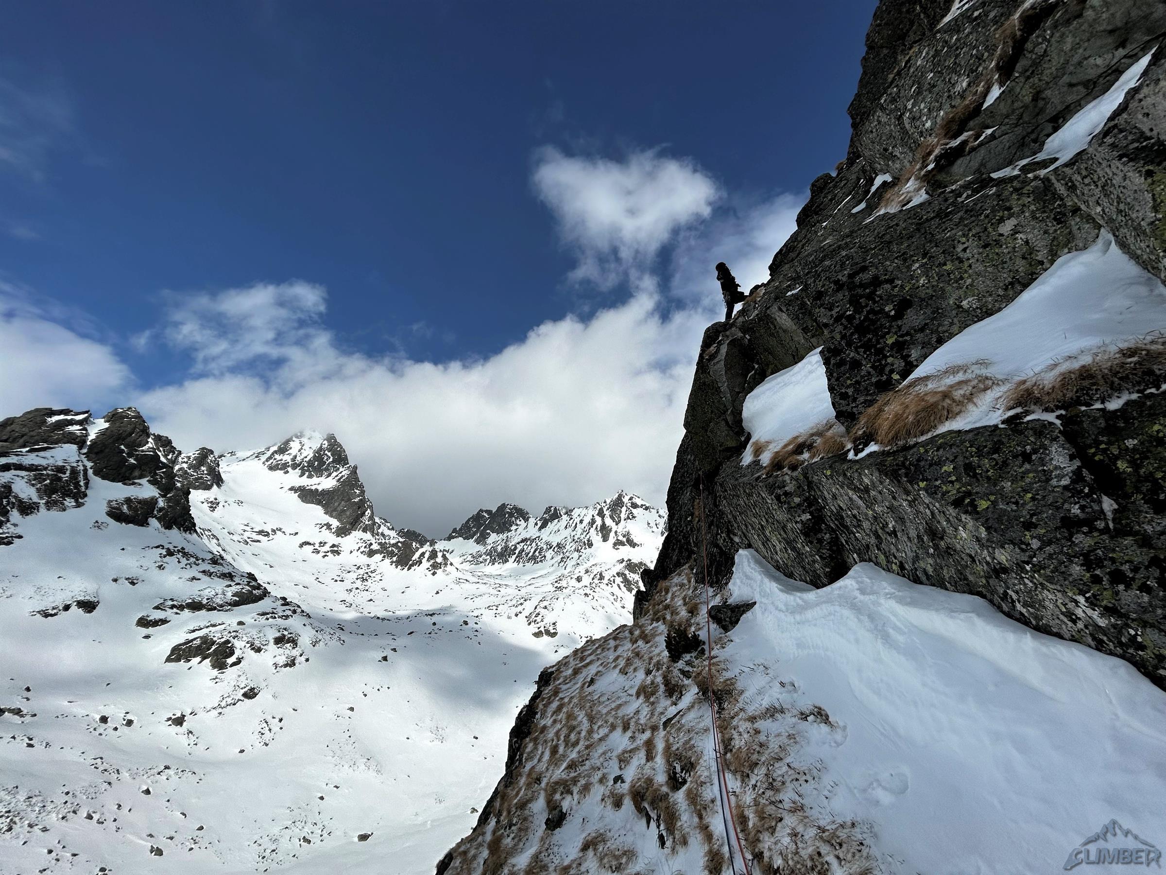 MARZEC. Skuszeni widokiem sprzed tygodnia jedziemy z Marcinem na Lód w Osterwie – ten na miejscu okazuje się jednak „niewspinalny”, zbiegamy więc w dół i przenosimy się do Staroleśnej na Veverkę (WI4) i ładne Chlapcom z Pumori (M5+ OS). Sezon zimowy „ratuje” kolejny weekend (pierwszy pogodny tej zimy!), który ambitnie przeznaczamy z Szymonem i Michałem na dwa główne cele sezonu. W sobotę próbujemy swoich sił na przepięknym Czarnym Zacięciu (M7+), którego kluczowy wyciąg ku naszemu zdziwieniu OS-em robi Michał i nam pozostaje w ten sam sposób rozprawić się z resztą drogi. Dzień później w końcu spełnia się jedno z marzeń – przechodzimy zimowo główne spiętrzenie Kazalnicy z wyjściem na szczyt. Ła-Pa (M7- RP) choć długa i poważna, w dobrych warunkach nie daje nam popalić – w kominach mamy lód, a na Ściance Problemowej świetną asekurację. Tydzień później idąc za ciosem odwiedzamy kolejną dużą północną ścianę – Jaworowy Mur, gdzie z Marcinem i Michałem robimy długo planowany, ale słabo niestety wylodzony Komin Navratov (M5 WI4).