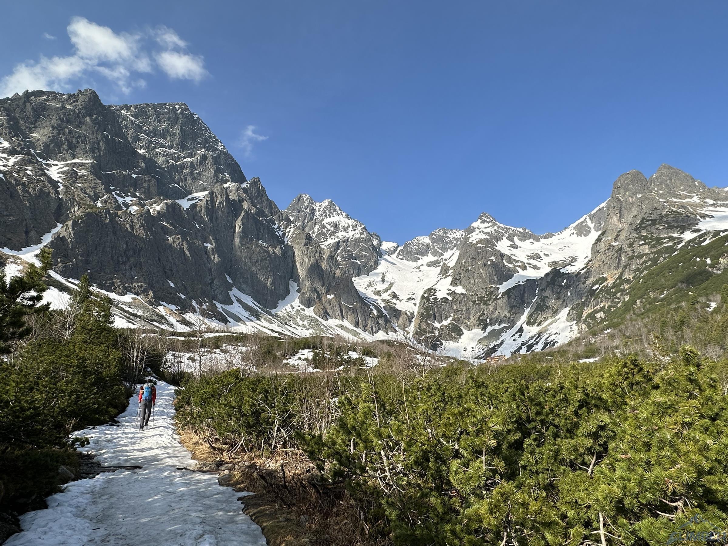Podejście nie należy do najkrótszych – normalnie zajmuje około 4 godzin, nam wydłuża go dodatkowo mokry śnieg zalegający już powyżej Schroniska nad Zielonym Stawem Kieżmarskim. W Dolinie Dzikiej obserwujemy jak na okolicznych ścianach lato zmaga się z zimą – w żlebach i na półkach śnieg, żebra i płyty suche jak pieprz. Klimat iście alpejski i podobny do tego z zeszłorocznego rozpoczęcia sezonu na Kopie Lodowej (Cesta k slnku).