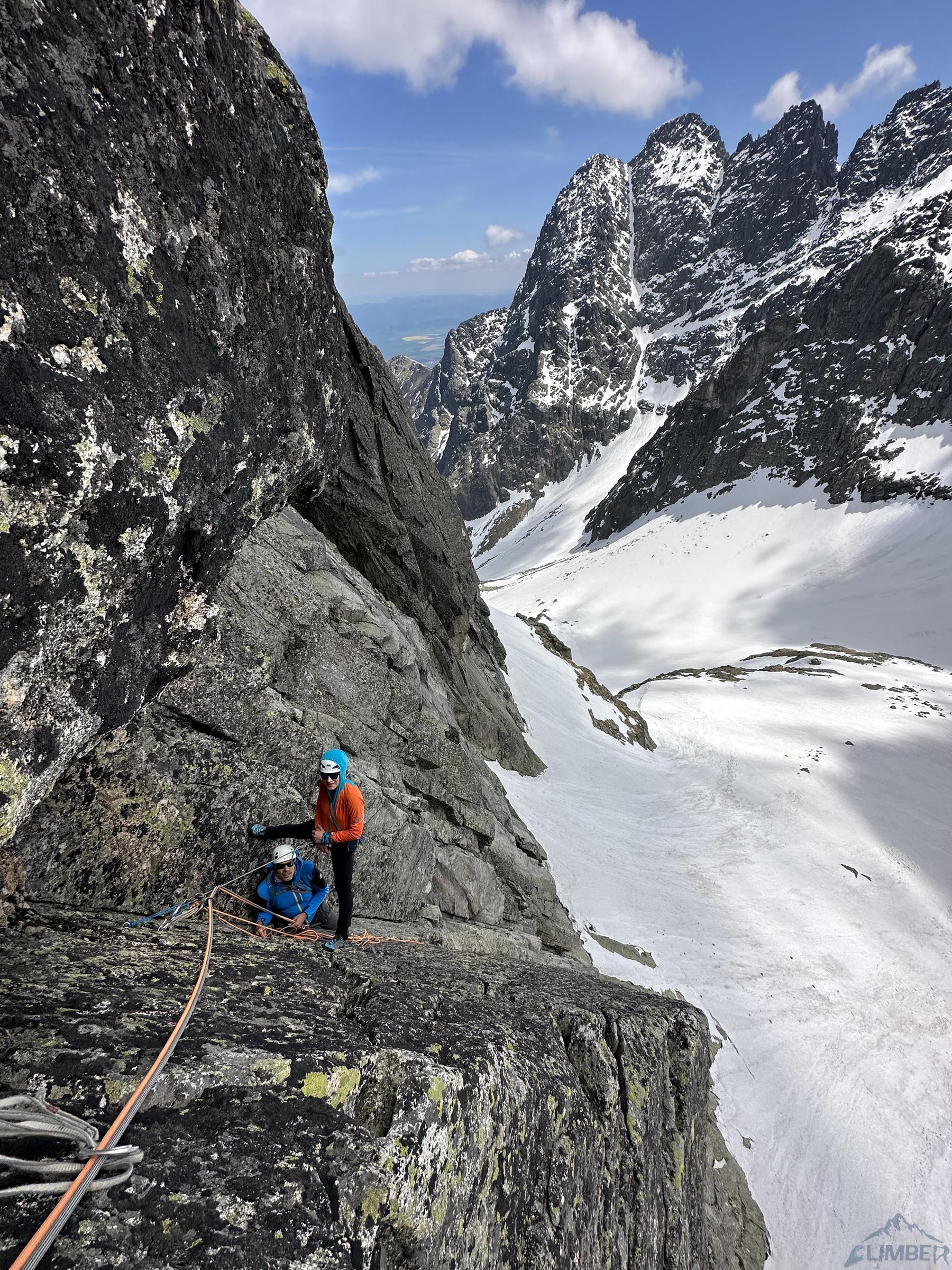 Ze szczytu można zejść lub zjechać – my z powodu śniegu wybieramy to drugie rozwiązanie. Pierwszy zjazd z powodu niefortunnie umieszczonego stanowiska jest nieprzyjemny i trzeba dobrze poprowadzić linę, drugi jest już lepszy, a dwa ostatnie szybkie i komfortowe. Po powrocie pod ścianę zastanawiamy się czy nie zrobić jeszcze drogi Stanisławskiego, dobrze wygląda jednak tylko jej pierwszy wyciąg (IV) płytowym zacięciem, wyżej w depresji jest bardziej trawiasto i dziś leje się tamtędy woda. Na dogrywkę postanawiamy więc sprawdzić jakie są dwa pierwsze wyciągi na oryginalnym Puškášu – przebiegamy je z Szymonem szybciutko podczas gdy Marta już odpoczywa.