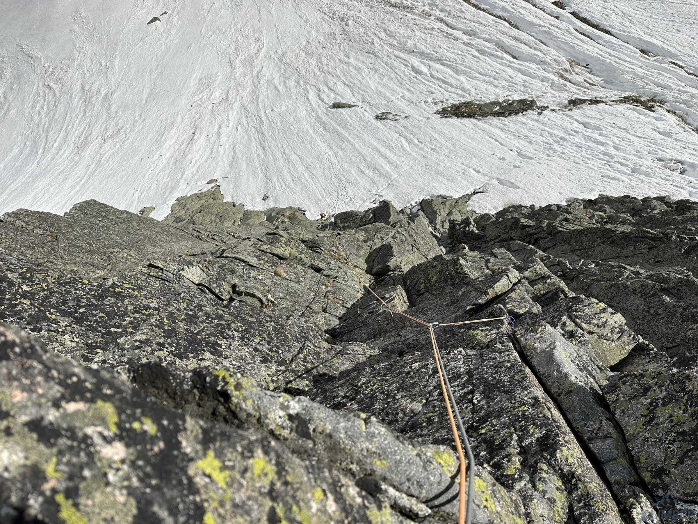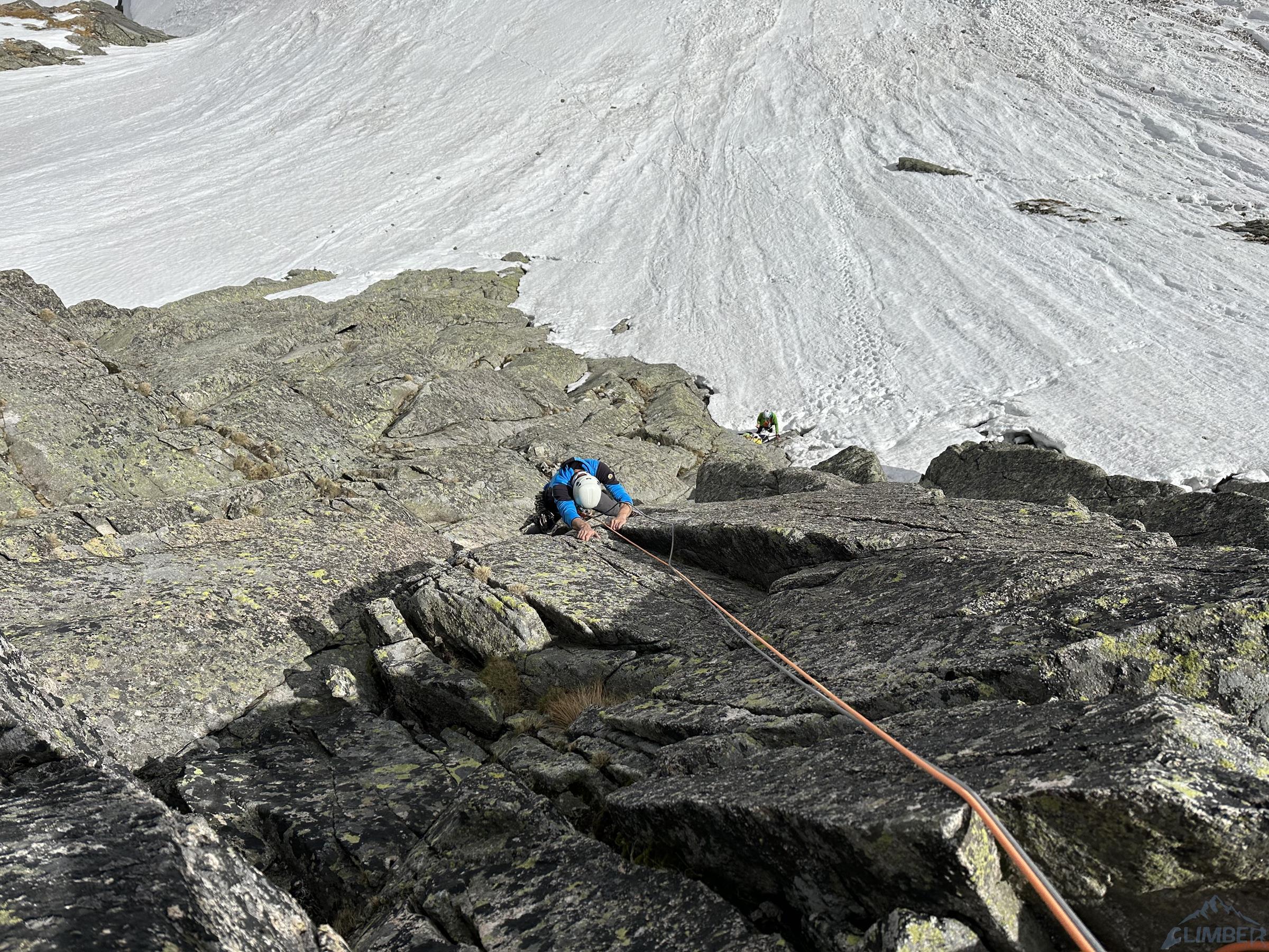 Pierwsze 10 metrów jest pod śniegiem, pozostaje nam więc ok. 20-tu. Idziemy płytą (IV) w kierunku łukowatego pęknięcia i przy ringu przewijamy się w lewo (V), po kilku ładnych ruchach docieramy do łatwiejszego zacięcia i przechodzimy nim w lewo do stanowiska na balkoniku. Drugi wyciąg (ok. 50m) zaczynamy od przejścia uklamionej przewieszki (IV+), po której ładnym zacięciem kierujemy się na lewo od przewieszek. Przechodzimy obok okapu na kant z rysą (IV+) i po przewinięciu kontynuujemy płytami skośnie w prawo do tarasu ze stanowiskiem – ostatnie metry są wspólne z wariantem prostującym. Dwa ostatnie wyciągi już robiliśmy, zjeżdżamy więc pod ścianę i kończymy naszą przygodę z Czarnym Szczytem. Fajnie było dotknąć ciepłego granitu w takich okolicznościach, a droga na pewno jest godna polecenia – jak ktoś będzie miał mało można przejść jeszcze drugą obok (np. wspomnianego Stanisławskiego czy Solickiego) albo przejść przez Baranią Przełęcz pod południową ścianę Baranich Rogów 😊. Ciekawą opcją jest również zrobienie Grani Papirusowych Turni do Przęłęczy Stolarczyka (zejście płytową Papirusową Drabiną).