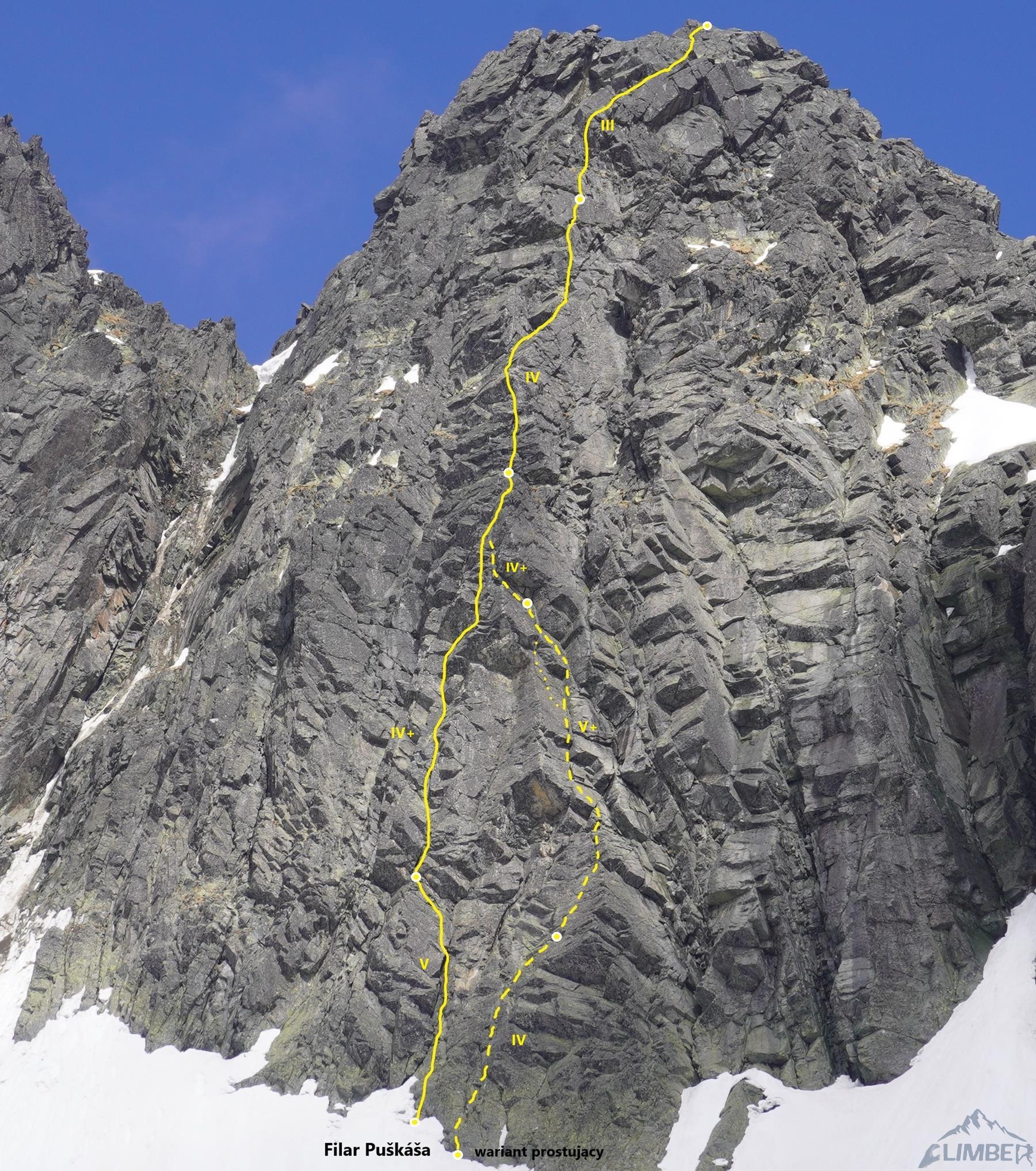 Co prawda w Tatrach śniegu nadal sporo, wiele słonecznych ścian umożliwia już jednak wspinanie w suchej skale – czas więc na rozpoczęcie sezonu letniego! Rehabilitacja barku trwa, pojawia się więc okazja na nadrobienie zaległości z łatwiejszym klasykiem z mojej listy tatrzańskich TOP100 - Filarem Puškáša (IV/V, war. V+) na Czarnym Szczycie. Droga jest lita, ładna i przyjemna oraz wyposażona w stanowiska w ringów i pojedyncze stałe punkty. To oraz fakt iż wyprowadza ona na oferujący świetne widoki wierzchołek sprawia, że zalicza się do grona najlepszych o tym stopniu trudności w Tatrach.