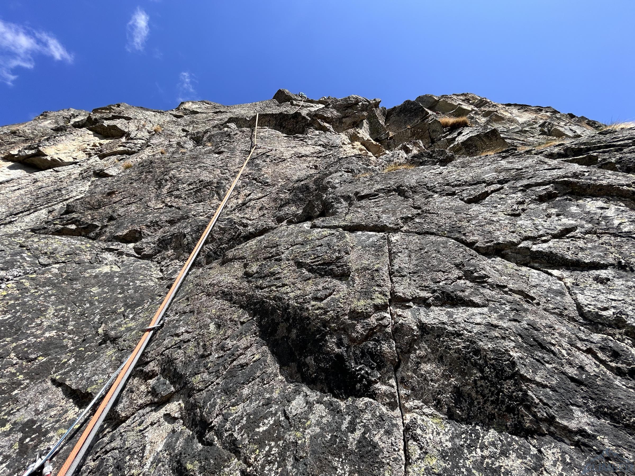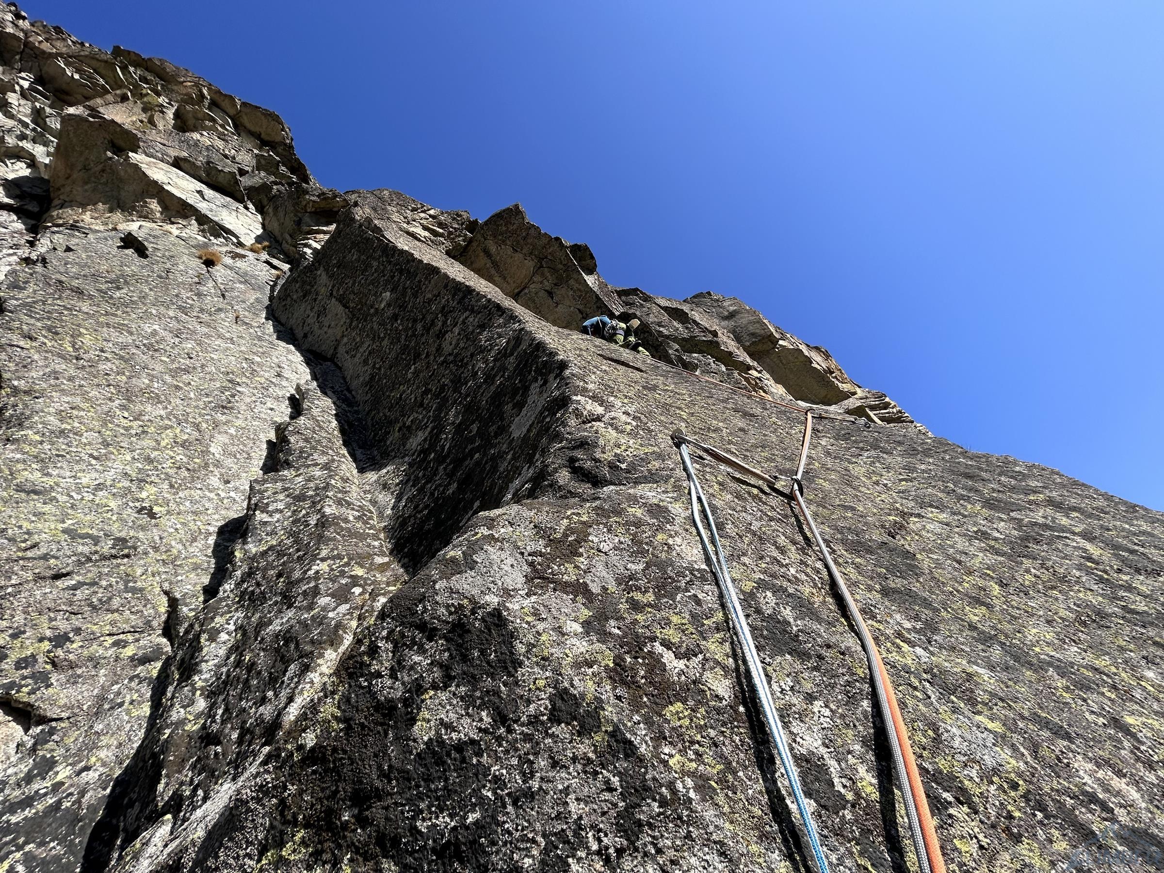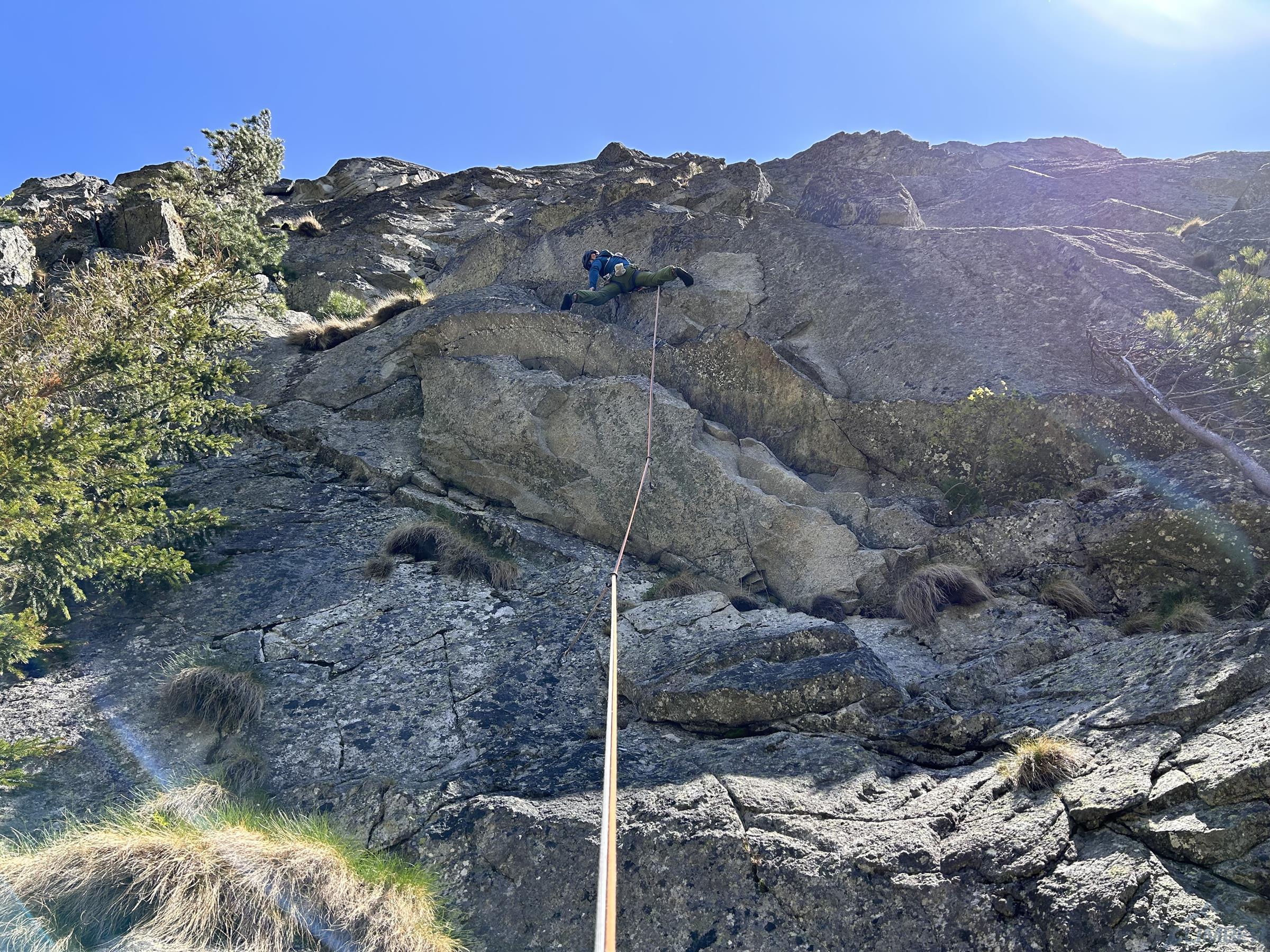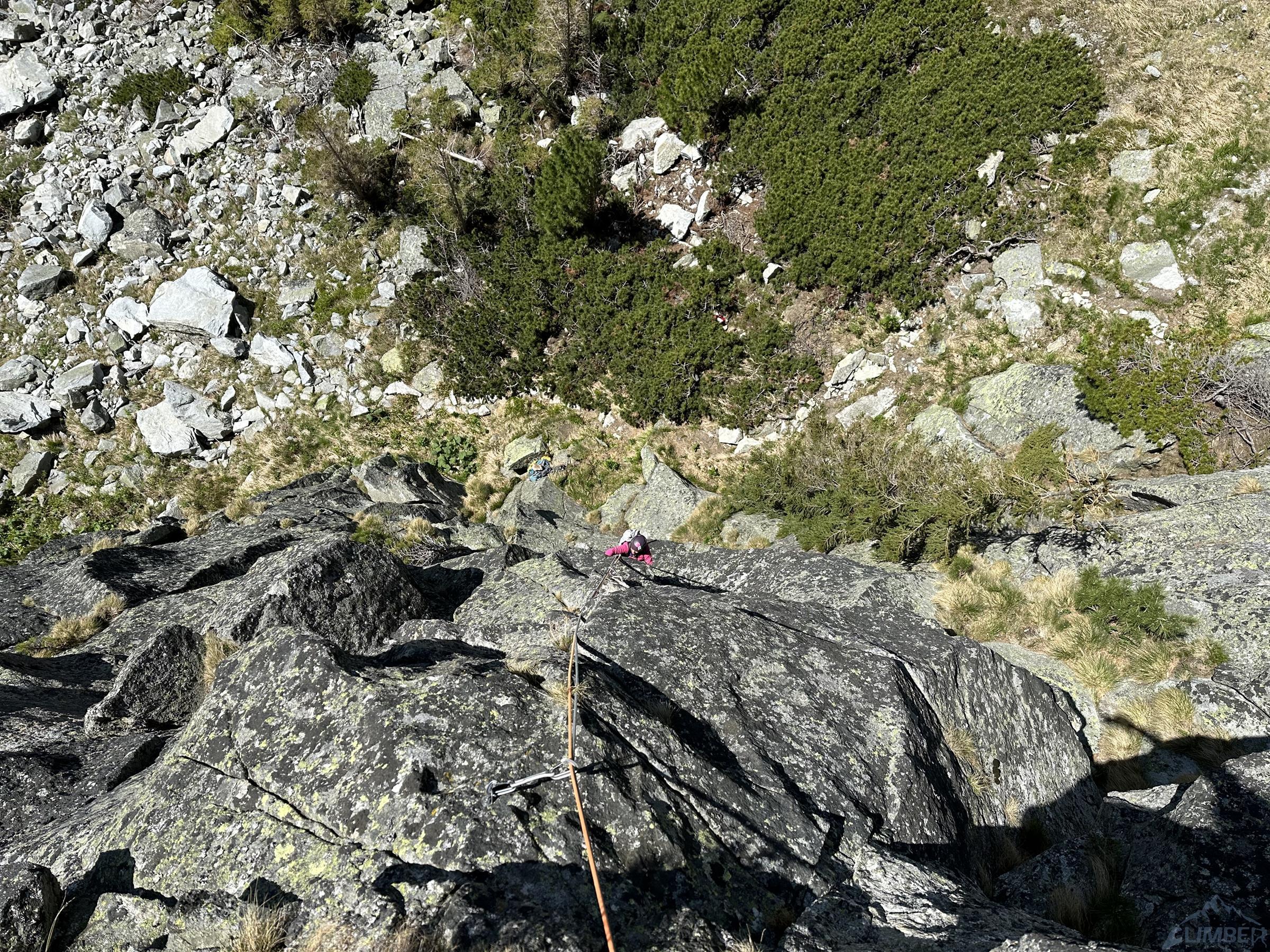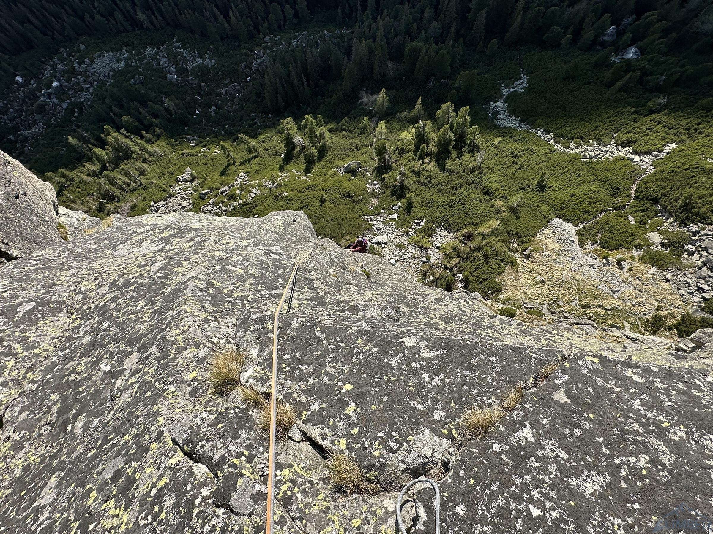 Wyciąg ostatni (VIII-, 35m) zaczyna się całkiem ciekawym rajbungiem, po którym łatwiej przechodzimy w lewo pod krótką przewieszoną ściankę wieńczącą okapy. Tutaj czeka kilka mocnych dogięć po dobrych chwytach i przewinięcie w połogi teren którym skośnie w lewo dotrzemy do ostatniego stanu. Pod ścianę wracamy dwoma szybkim zjazdami i udajemy się do schroniska na nocleg przed jutrzejszym, znacznie poważniejszym mentalnie wyzwaniem 😉 (RELACJA).