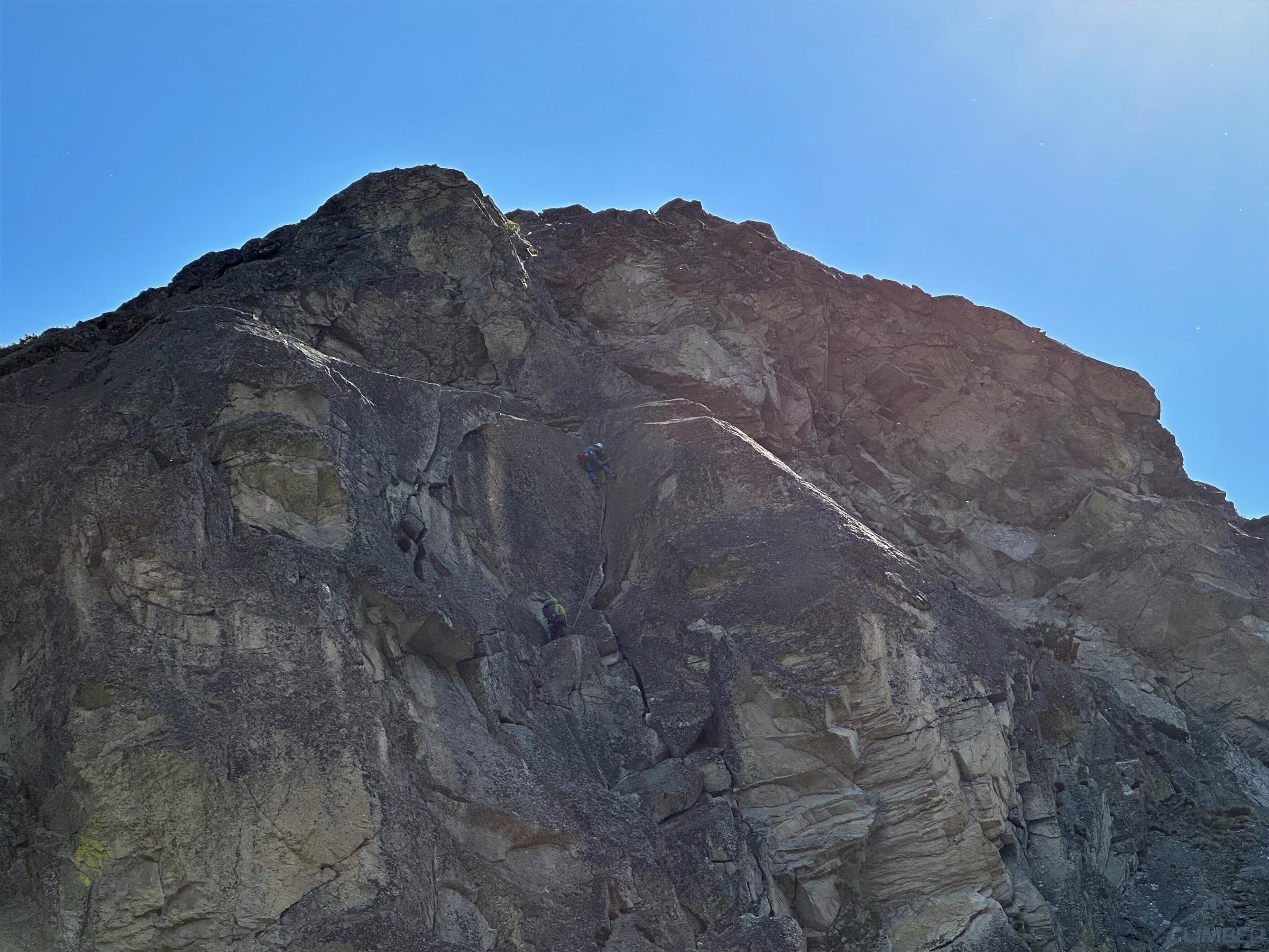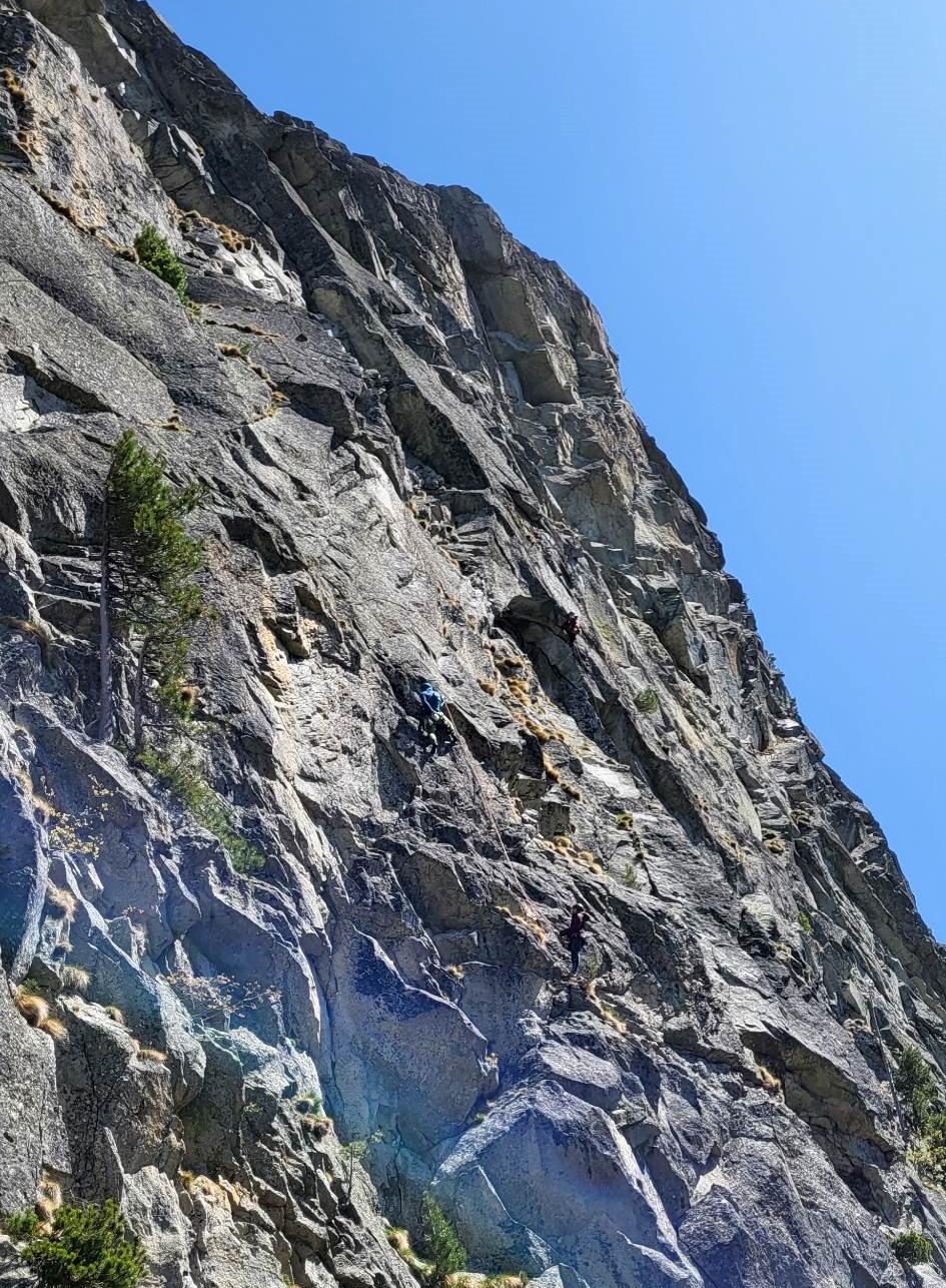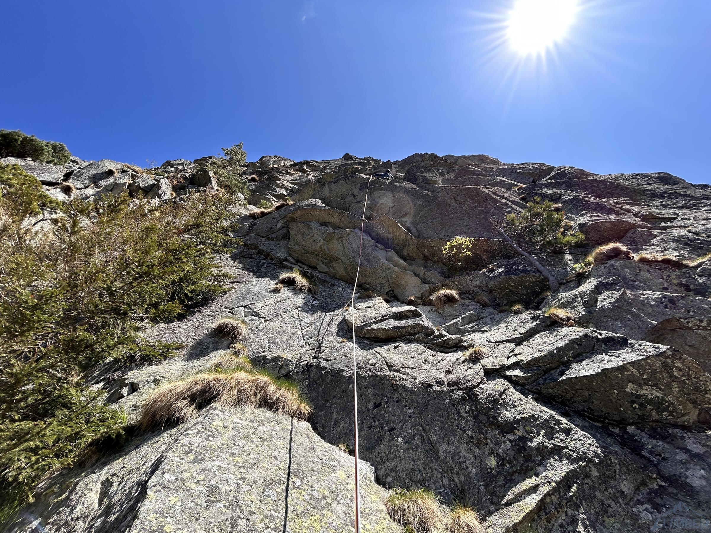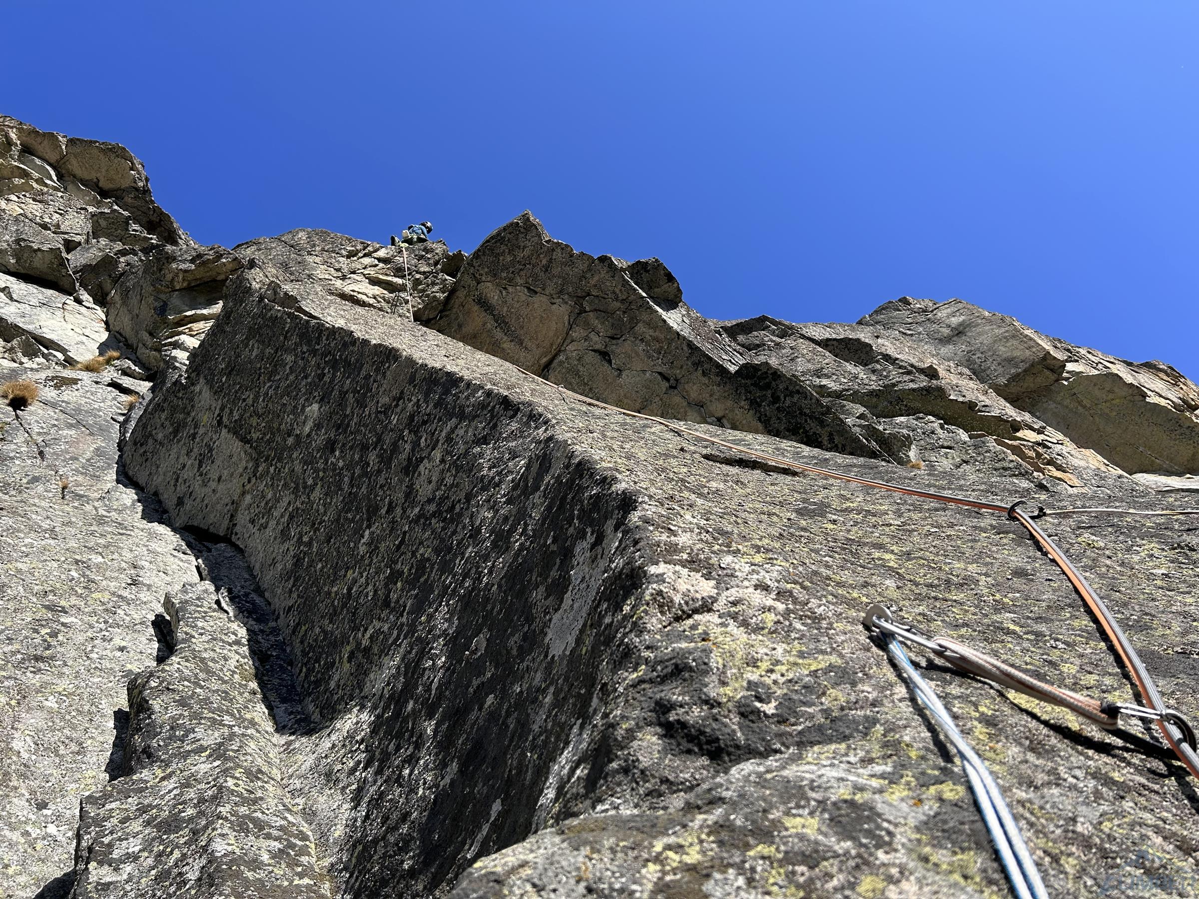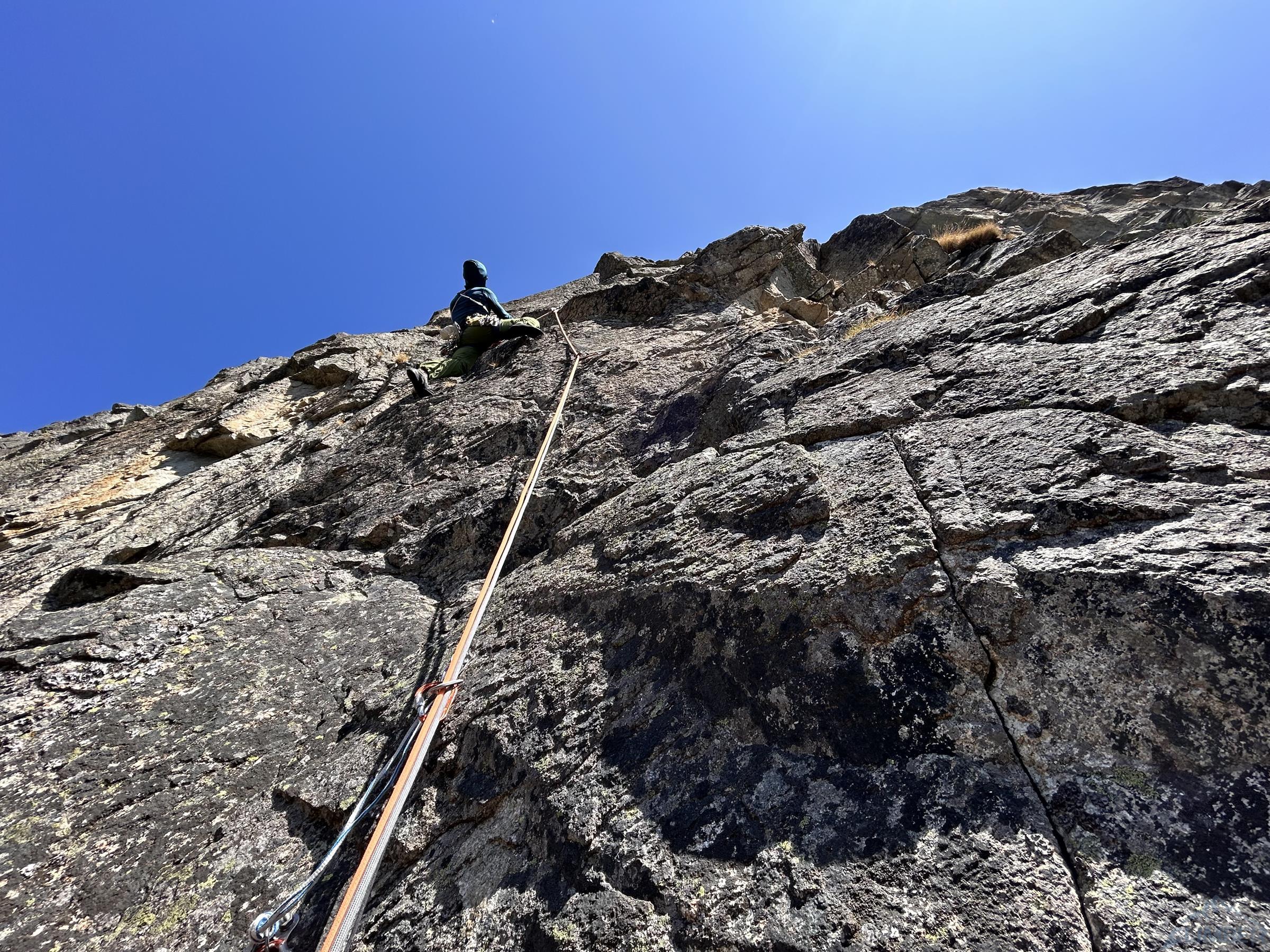 Wyciąg ostatni (VIII-, 35m) zaczyna się całkiem ciekawym rajbungiem, po którym łatwiej przechodzimy w lewo pod krótką przewieszoną ściankę wieńczącą okapy. Tutaj czeka kilka mocnych dogięć po dobrych chwytach i przewinięcie w połogi teren którym skośnie w lewo dotrzemy do ostatniego stanu. Pod ścianę wracamy dwoma szybkim zjazdami i udajemy się do schroniska na nocleg przed jutrzejszym, znacznie poważniejszym mentalnie wyzwaniem 😉 (RELACJA).