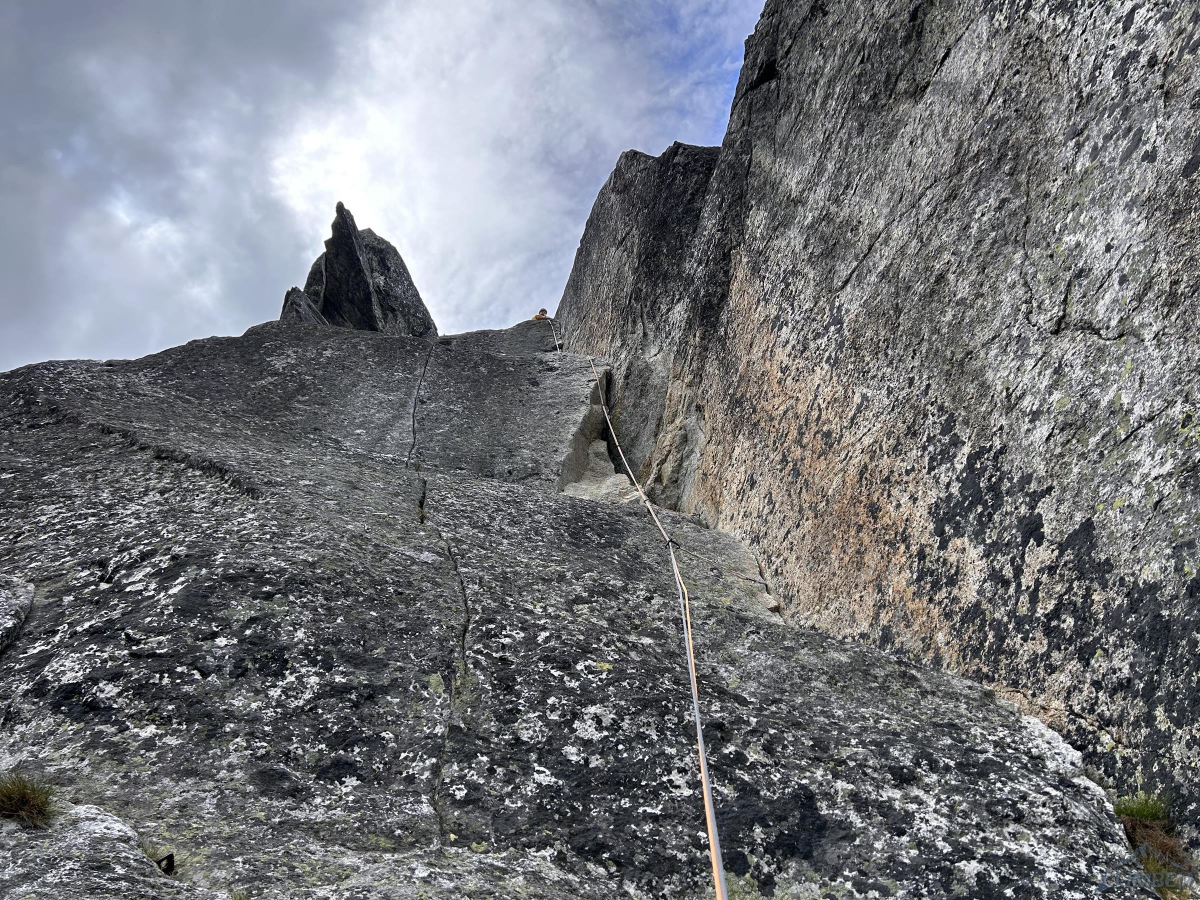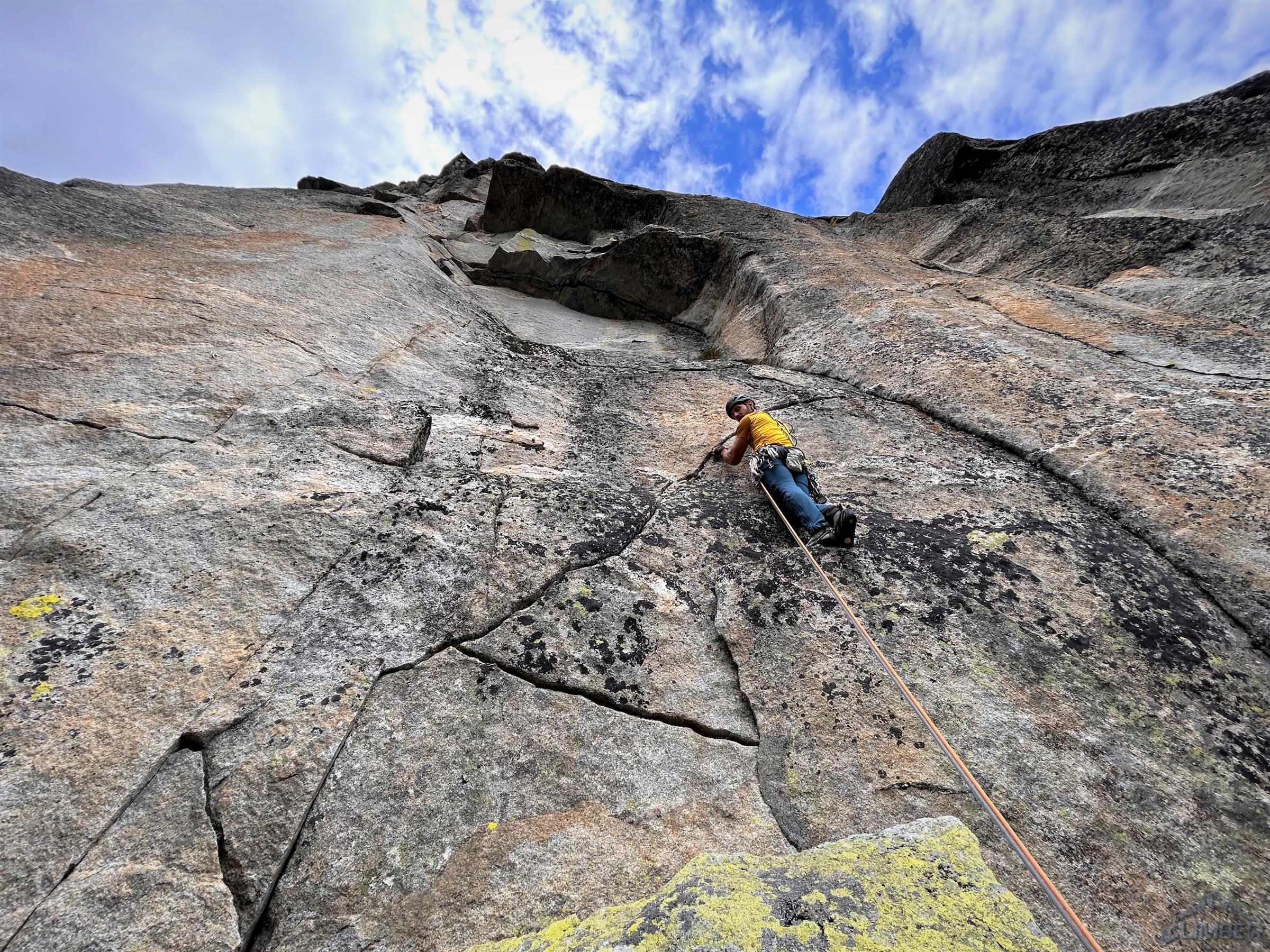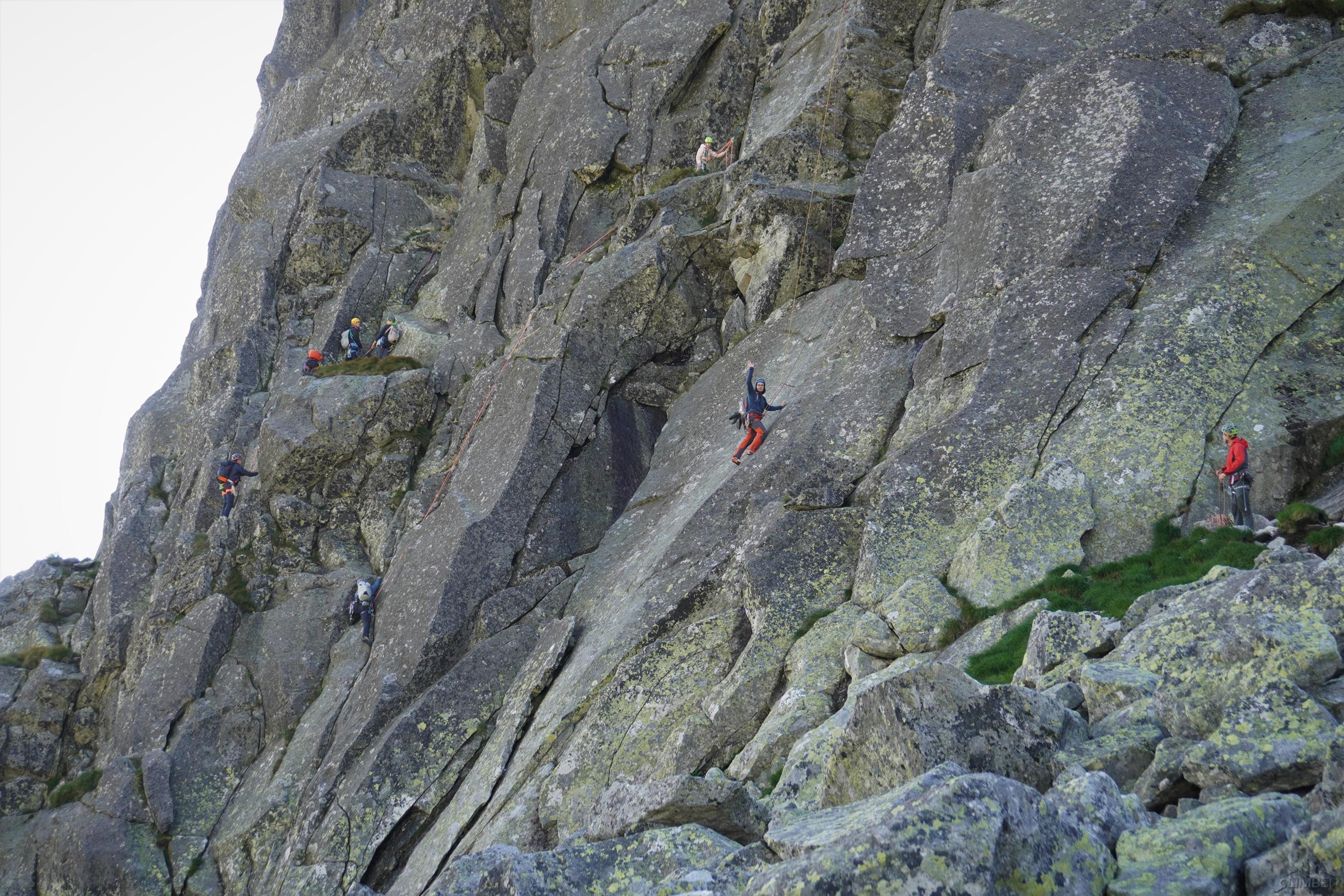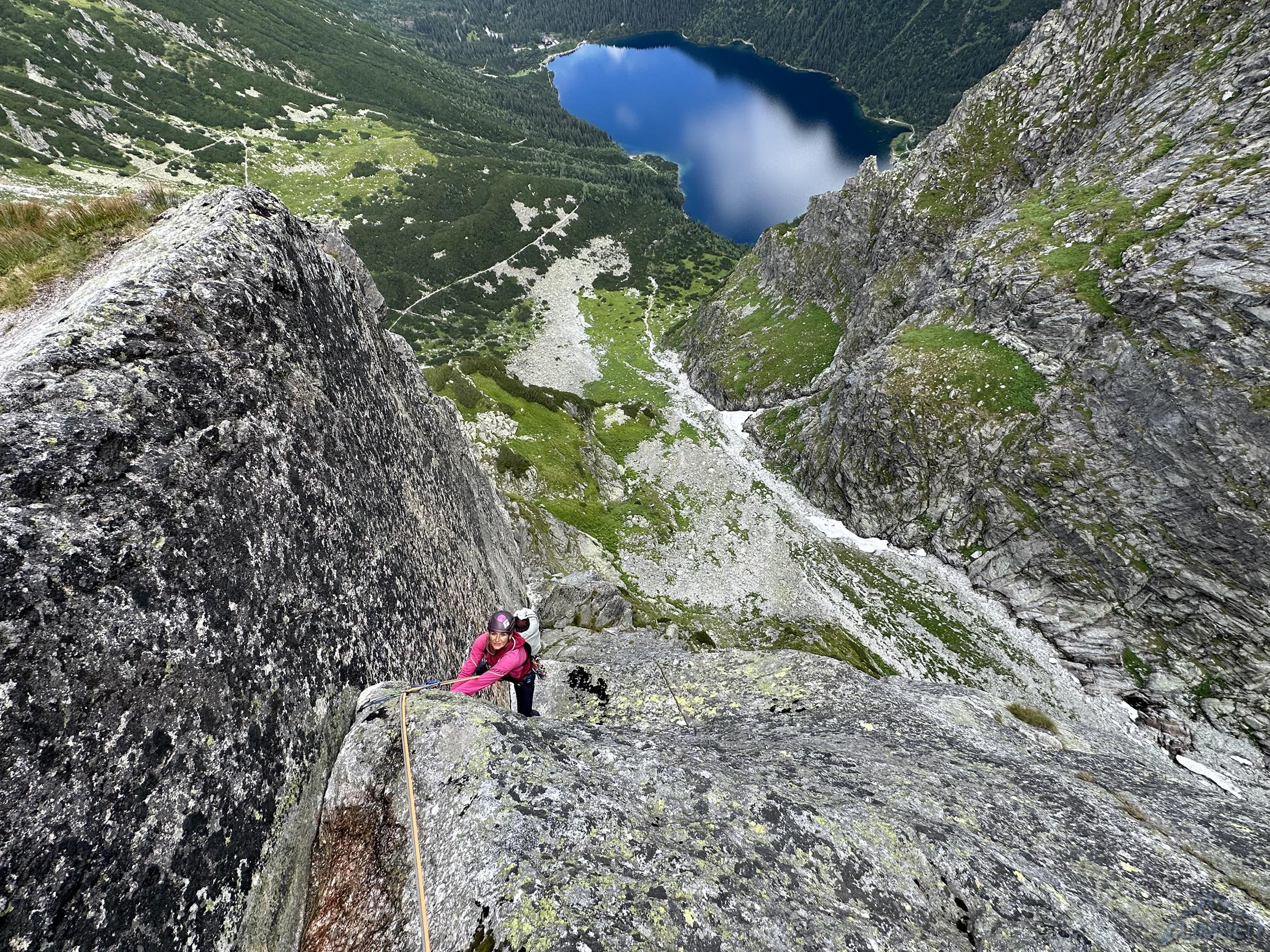 Weekendowy pobyt w Morskim Oku podczas klubowego obozu. Po kilku dniach opadów i niskiej temperatury sobota zapowiada się pogodnie tylko do południa. Wschodnia ściana Mnicha od rana jest w Słońcu i jako jedna z nielicznych przesycha, daje to więc nadzieję na szybkie przejście czegoś krótkiego. Po integracji do późnych godzin nocnych podejście jest bardziej męczące niż zazwyczaj, w końcu jednak docieramy na miejsce. Chmury już gęstnieją, proponuję więc Ani by spróbować przynajmniej Fereńskiego (oryg. VII/VII+), na którym główne trudności oferuje pięknie prezentujący się pierwszy wyciąg.