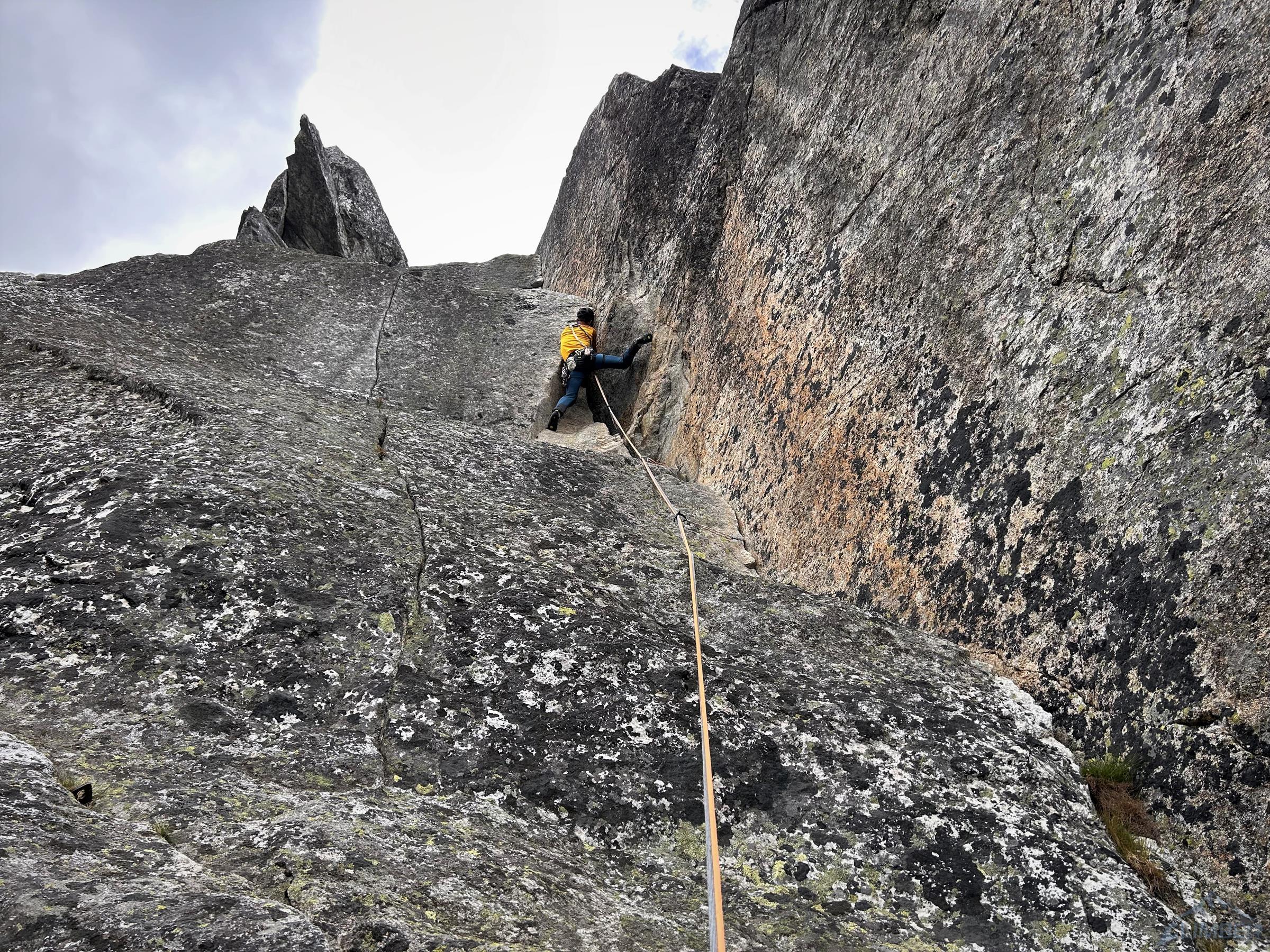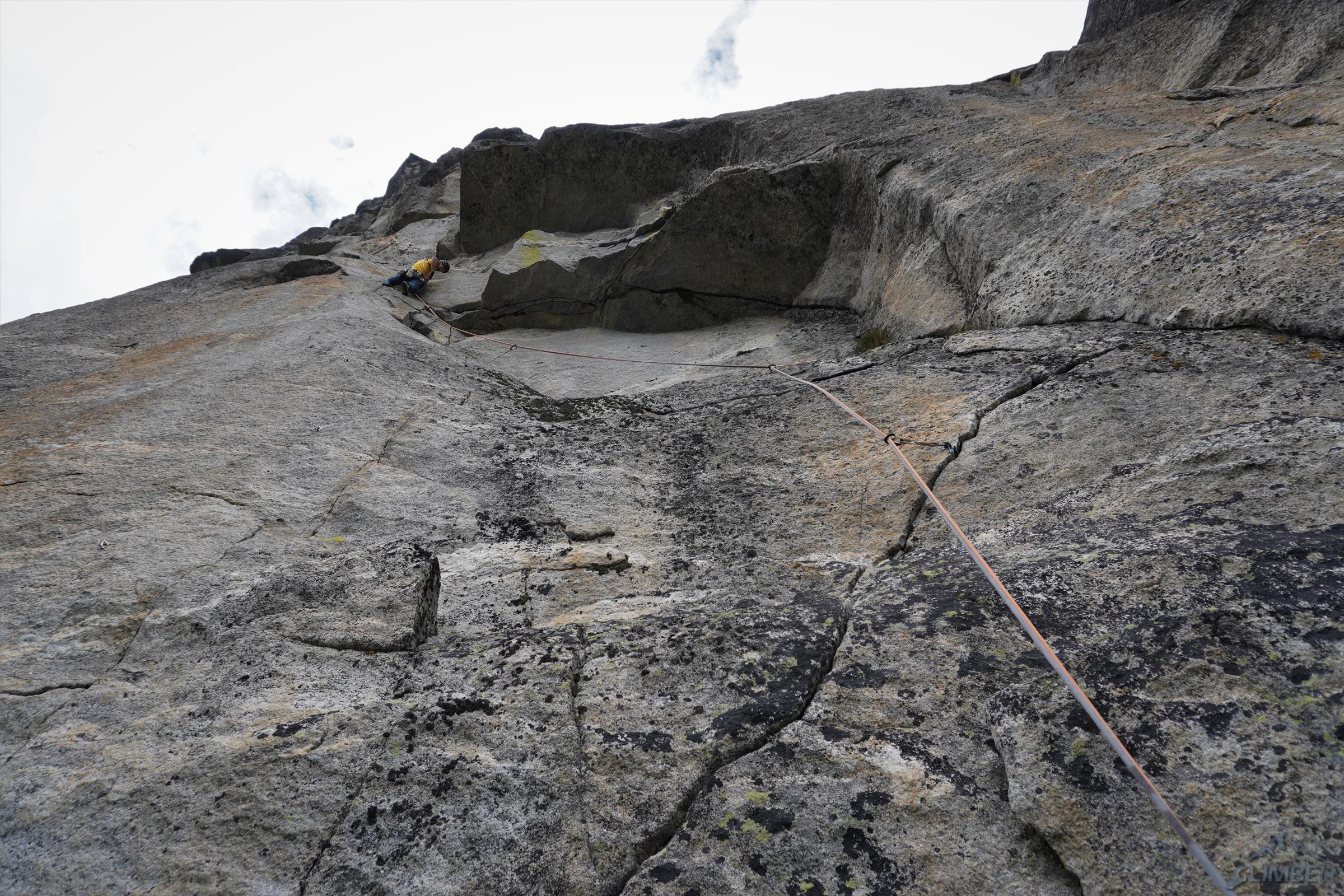 Drugi wyciąg zaczyna się od zaskakująco kąśliwego przewinięcia przez okapik (VI+, spit), wyżej robi się już łatwiej. Kontynuujemy wzdłuż rysy (V+, spity) i po 15 metrach docieramy do półki, do której z prawej strony dochodzi Hobrzański. Nie zatrzymując się kontynuujemy zacięciem (V) kolejne 15 metrów do stanowiska pod przepięknym Zacięciem Kosińskiego. Na Górne Półki najłatwiej dostać możemy się ostatnim wyciągiem Międzymiastowej (VI+), my jednak postanawiamy zrobić to Kosińskim, z którym mam stare porachunki – takie zakończenie jest zresztą bardziej logiczne i eleganckie. Zacięcie pokonujemy na własnej asekuracji i posiada ona dwa trudniejsze, przewieszone fragmenty – dolny z szerszą rysą (ok. VII-) i górny z wąskim pęknięciem (VII). Będąc tu już po raz trzeci tym razem udaje się poprowadzić w pierwszej próbie, nadal stwierdzam jednak że łatwo nie jest 😊.