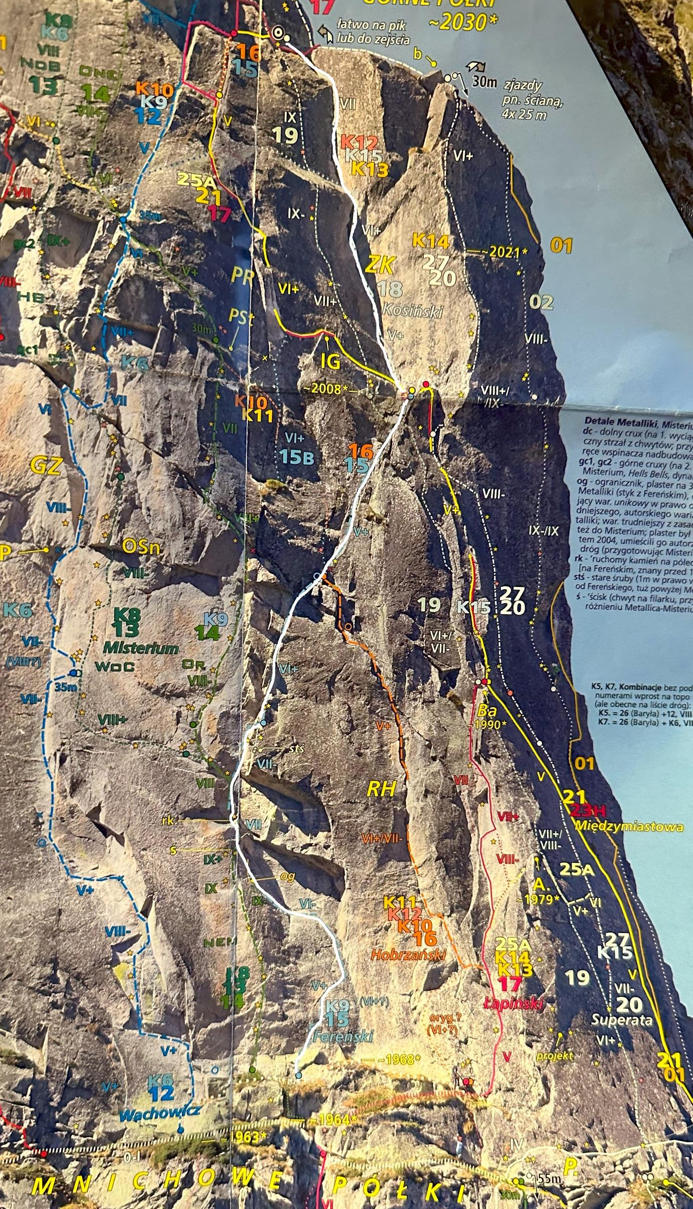 Droga startuje pod okapami tuż na prawo od Metaliki, po przewinięciu się na ścianę wschodnią trawersujemy za Rysę Hobrzańskiego (opis kombinacji Hobrzański/Kosiński TUTAJ) i wychodzimy na taras z blokiem, gdzie znajdziemy dwa spity stanowiskowe. Wspinanie zaczynamy od pokonania cienkiej łukowatej rysy, która zanika pod półką – przewinięcie na nią jest dość wymagające jak na V+ (raczej VI+). Z półki odbijamy skośnie w lewo wzdłuż pięknego szerokiego pęknięcia, które doprowadza nas na skraj dolnego okapu, gdzie znajdziemy pierwszego spita – do tego miejsca asekurujemy się własnym sprzętem. Powyżej czeka nas już mocniejsze wspinanie – przewijamy się wzdłuż pęknięć w lewo (VII+), pokonujemy krótki fragment wspólny z Metaliką i wchodzimy do pięknego zacięcia z rysą (VII) na lewo od górnego okapu (są dwa spity). Na deser pozostaje nam niebanalne przejście z zacięcia do stanowiska na kancie – z powodu słabej dyspozycji dociągam do niego na oparach, polecam być dobrze rozgrzanym 😉.