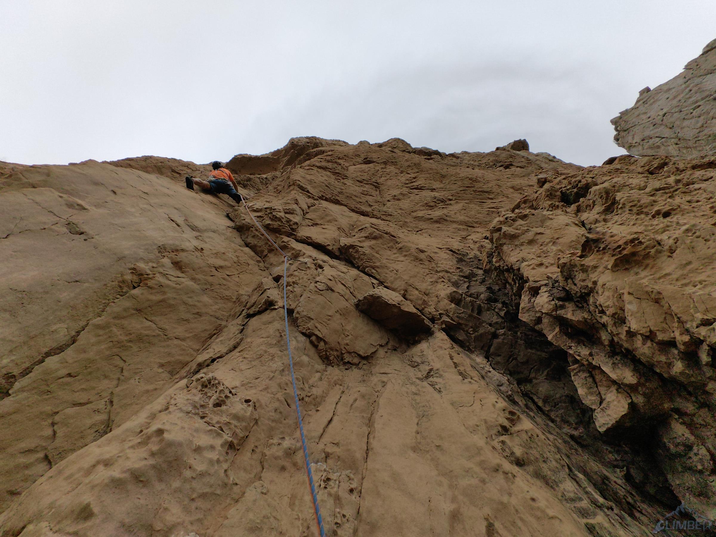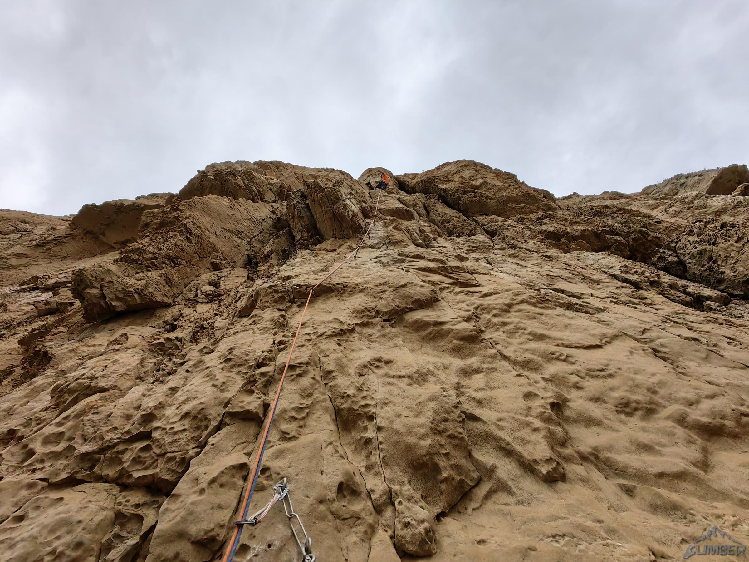 Pierwszy wyciąg (6a+, 45m) to przyjemne wspinanie wzdłuż wymytych rys i płytkich zacięć oraz końcówka w płycie z ostrzejszą już skałą. Teren jest spionowany, daje się jednak złapać kilka restów – przydatnych przy tylu metrach i braku dogrzania. Drugi wyciąg (6a, 40m) zaczyna się stromą ścianką, po której kontynuujemy w połogu by pod stanowiskiem ponownie pokonać trudniejszy fragment.
