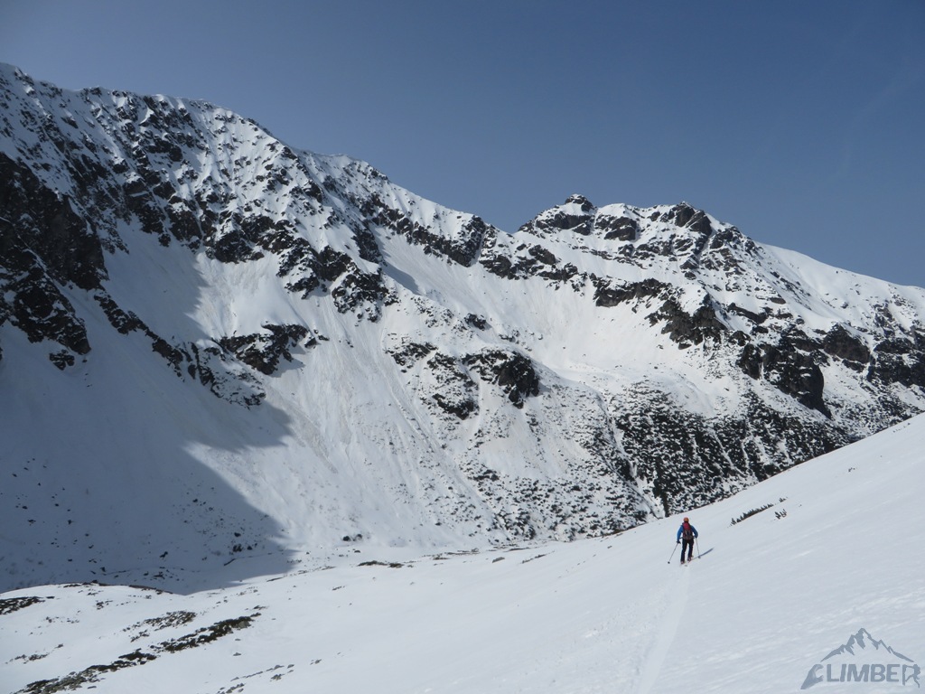 Temperatura mocno poszła w górę więc trzeba korzystać z resztek śniegu w Tatrach :) Dlatego też decydujemy się na przejście trochę zapomnianej Doliny Jaworowej i zjazd z Przełęczy Lodowej. Przez pierwsze kilometry śniegu niestety brak więc narty na plecach czyli klasyczny skitouring tatrzański ;)